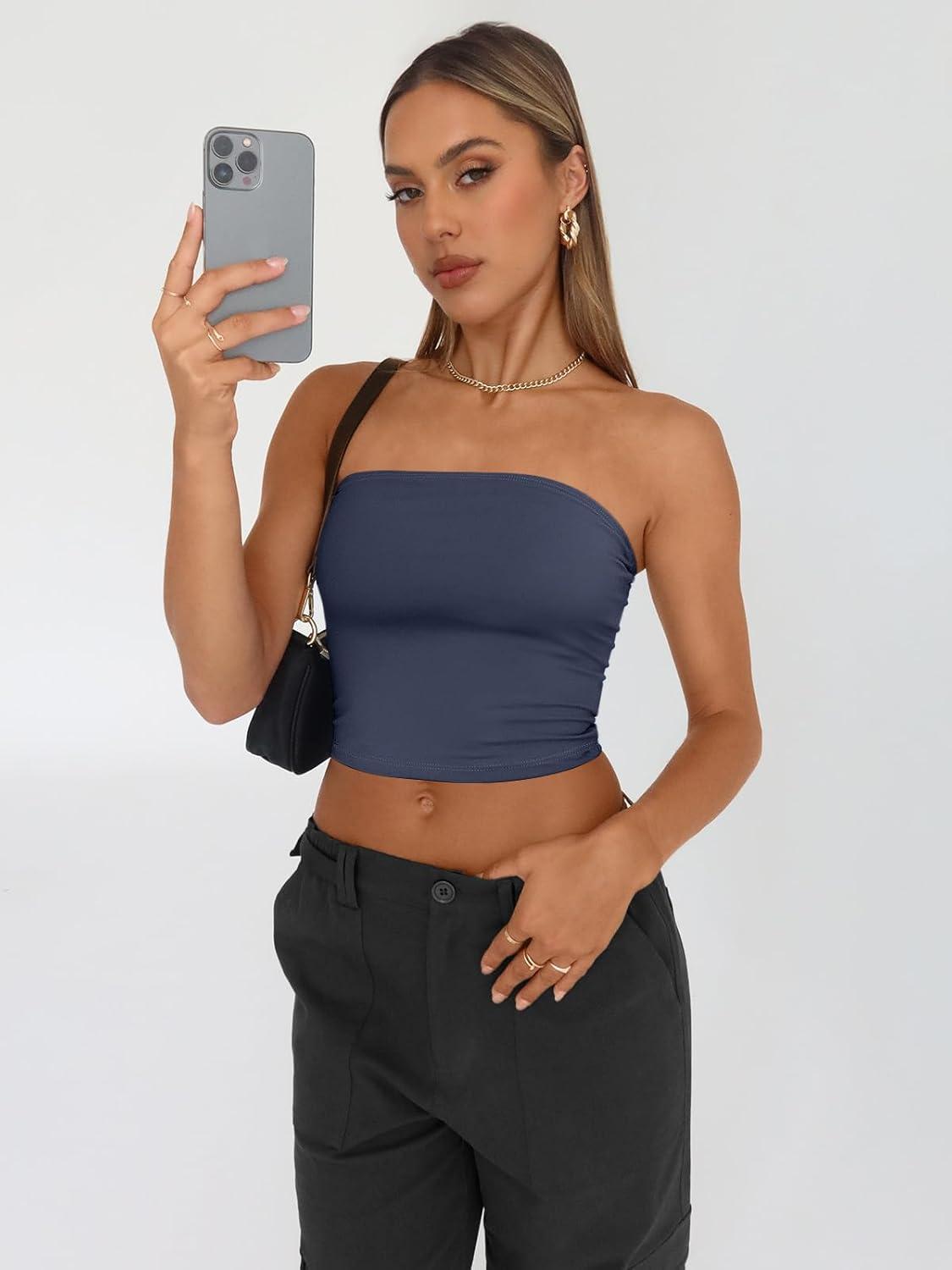 Trendy Queen Womens 3 Pack Tube Tops Crop Going Out Strapless Basic Backless Bandeau Bra Summer Outfits 2026(White black navy)