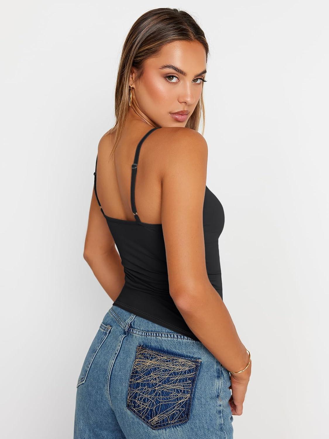 Trendy Queen Womens Adjustable Camisole Sleeveless Square Neck Spaghetti Strap Tank Tops Basic Shirt(Black)
