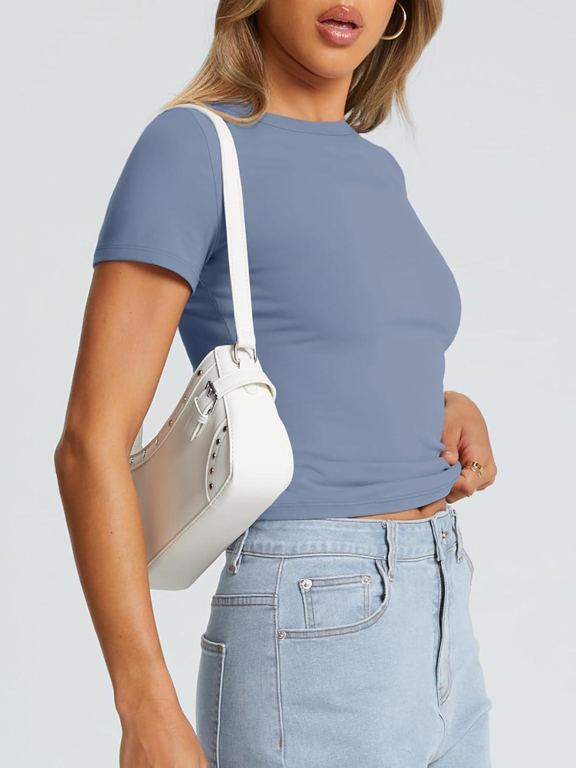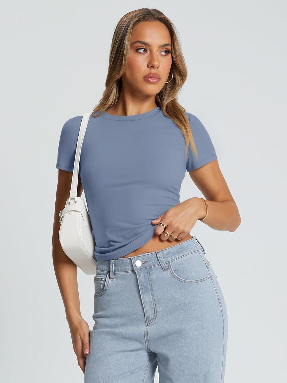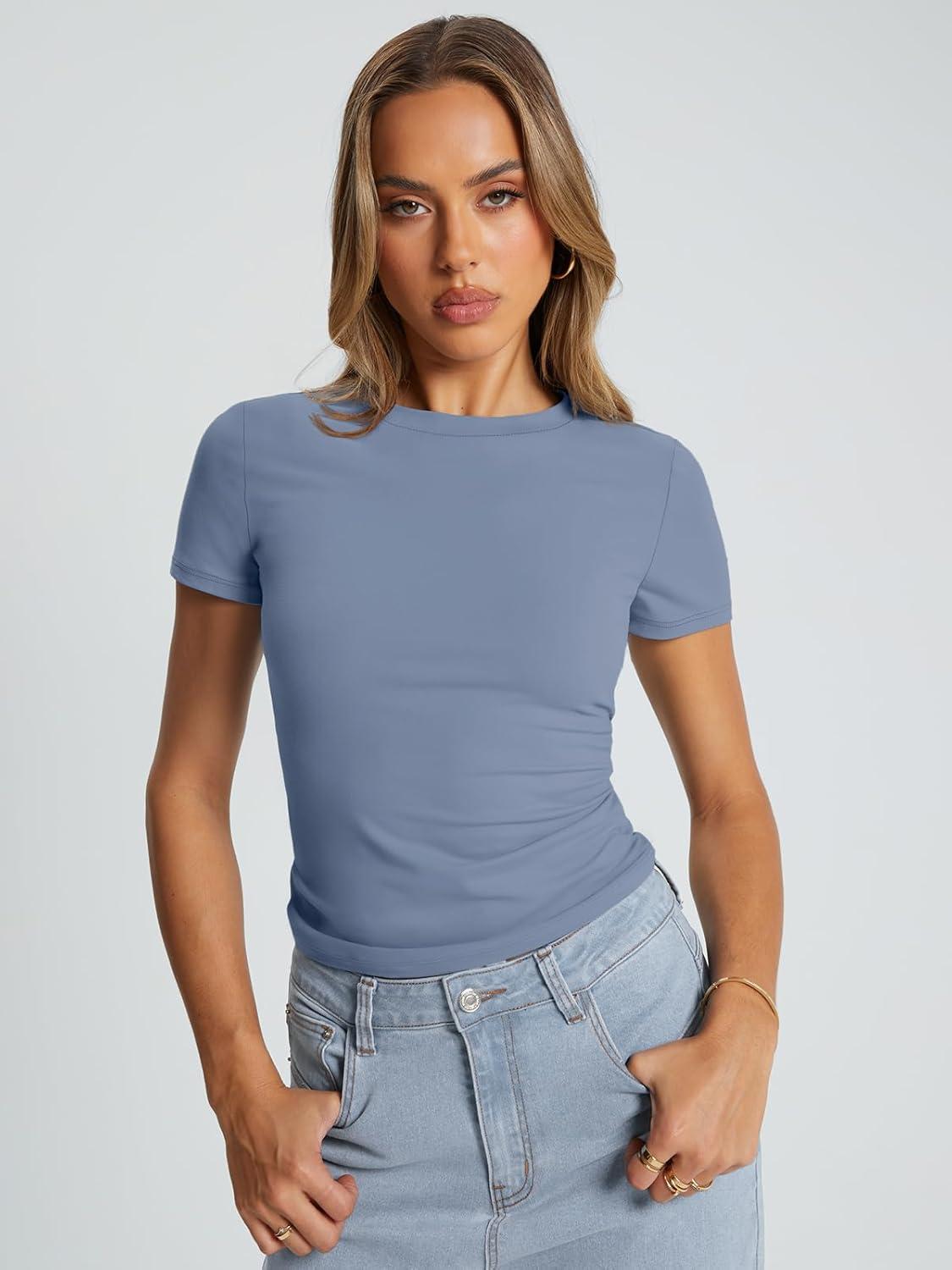 Trendy Queen Womens Basic T Shirts Summer Tops 2025 Crop Short Sleeve Slim Fit Tee Cute Gym Workout Clothes(Lightblue)