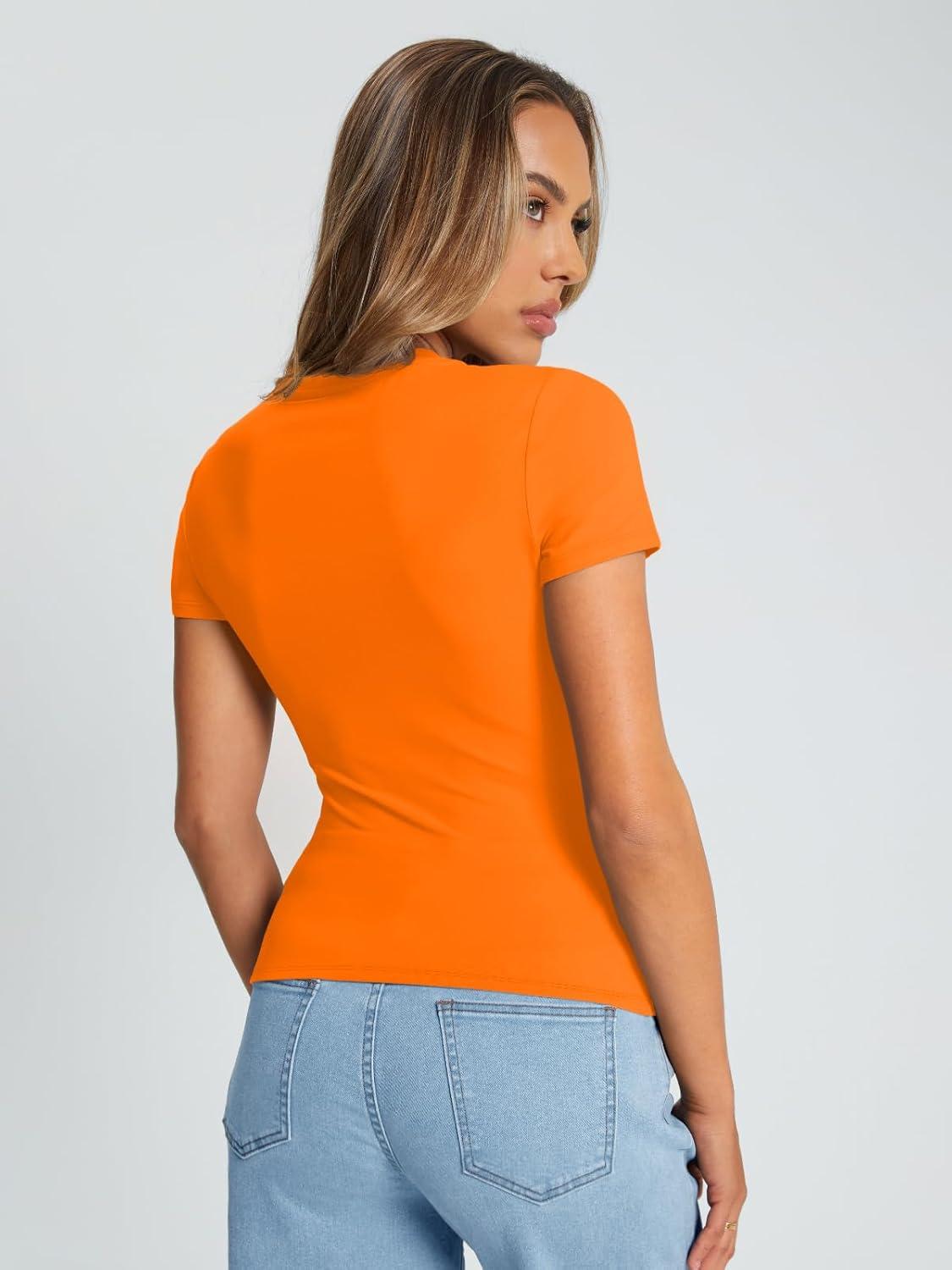 Trendy Queen Womens Basic T Shirts Summer Tops 2025 Crop Short Sleeve Slim Fit Tee Cute Gym Workout Clothes(Orange)