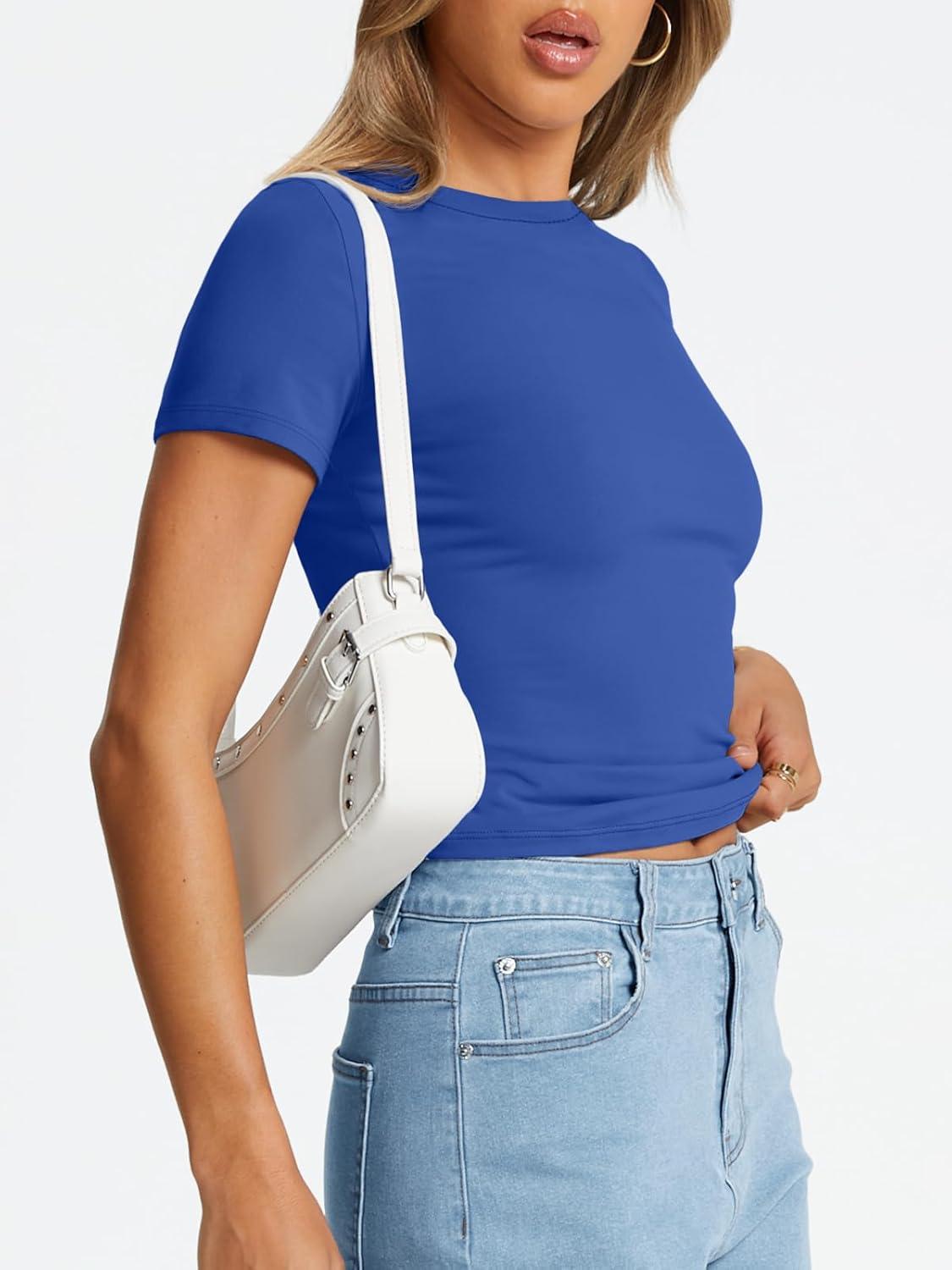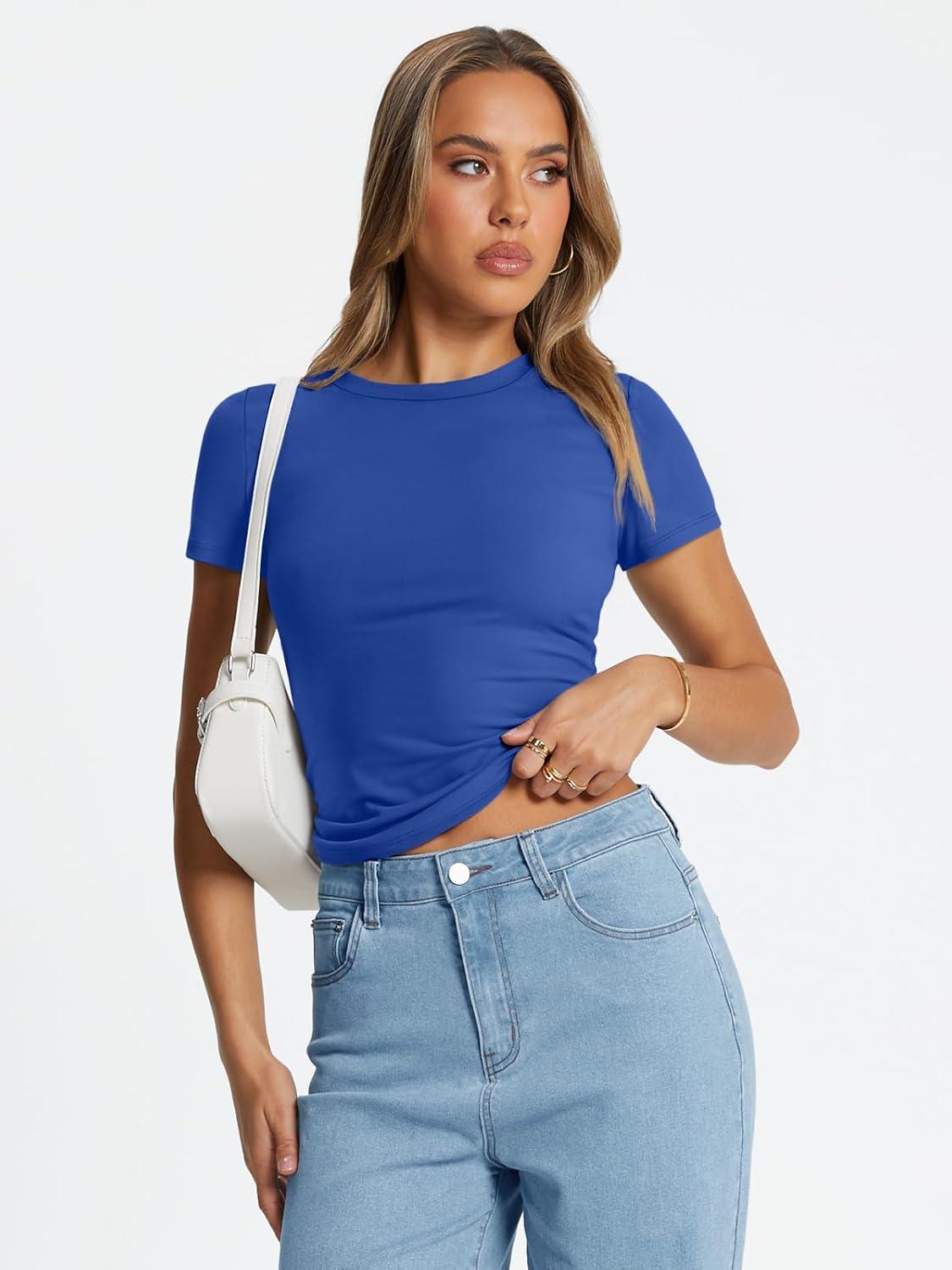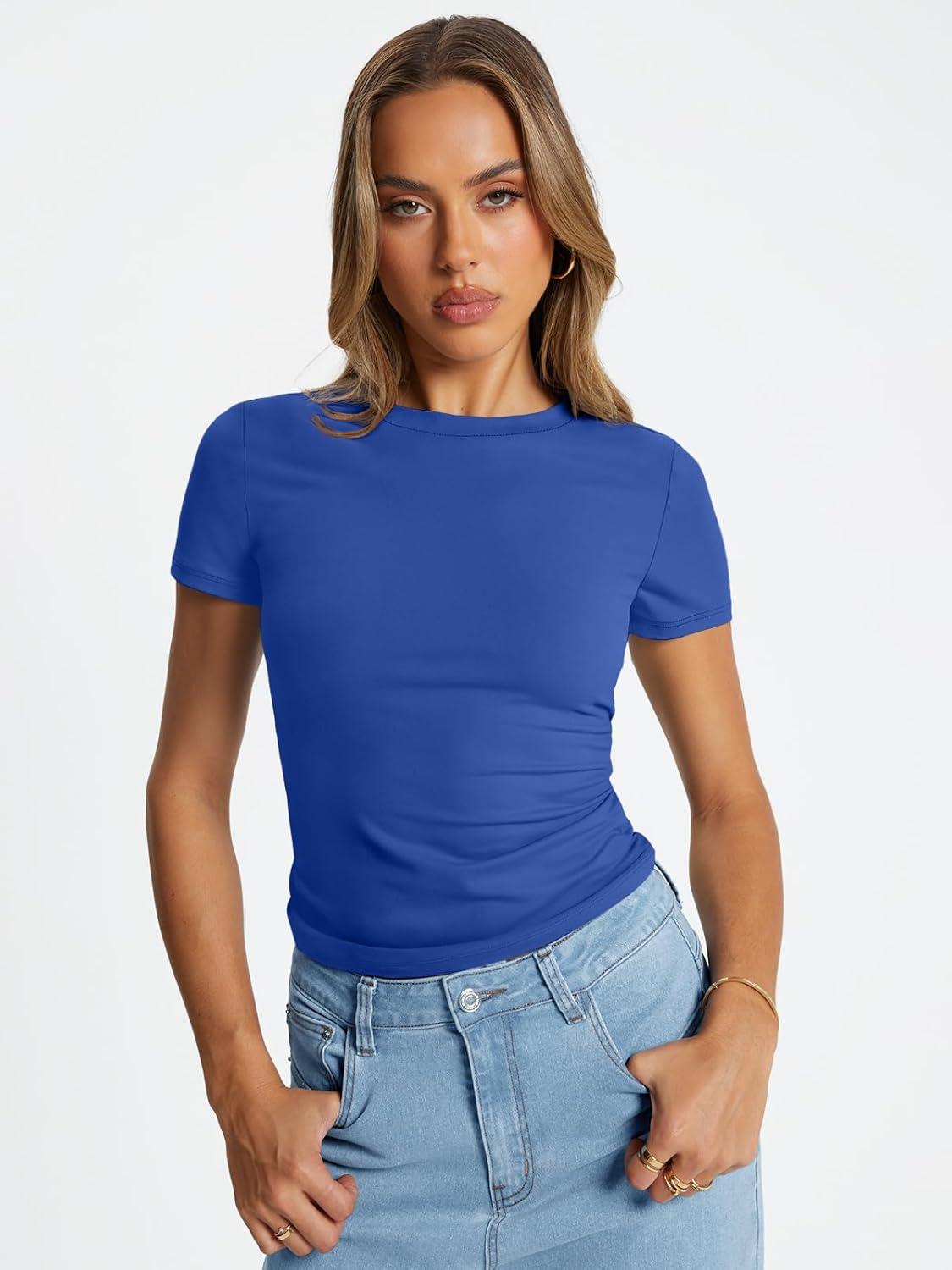 Trendy Queen Womens Basic T Shirts Summer Tops 2025 Crop Short Sleeve Slim Fit Tee Cute Gym Workout Clothes(Royal Blue)