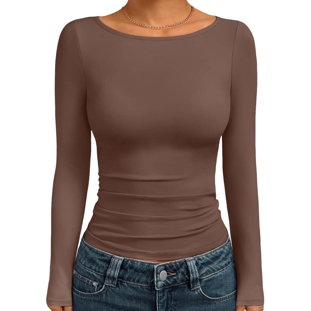 Trendy Queen Women’s Boat Neck Tops Long Sleeve Shirts Casual Fitted Tee Shirts Solid Color Fall Basic Clothes 2025(Brown)