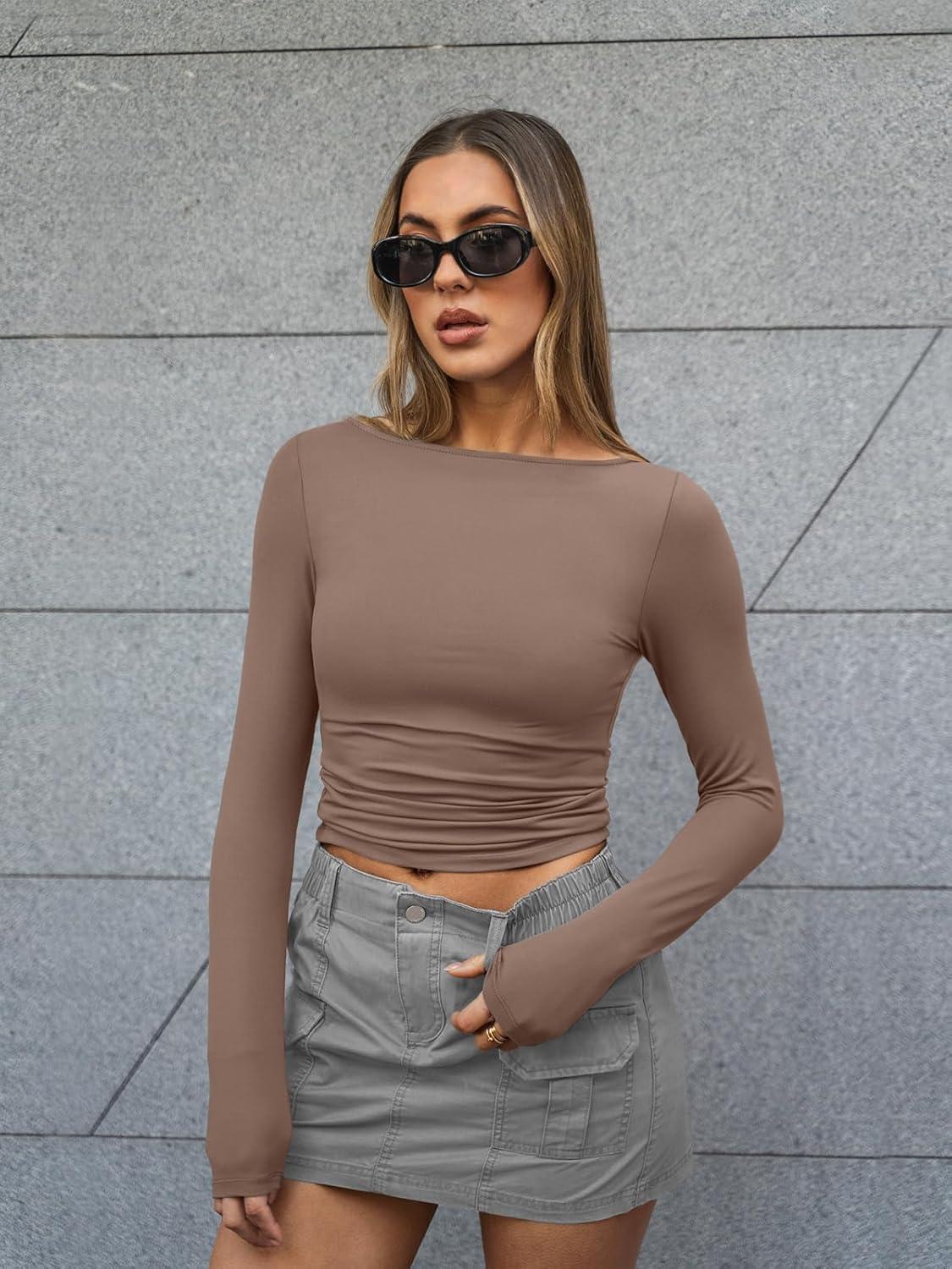 Trendy Queen Women’s Boat Neck Tops Long Sleeve Shirts Casual Fitted Tee Shirts Solid Color Fall Basic Clothes 2025(Coffeegray)