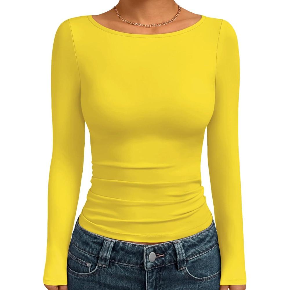 Trendy Queen Women’s Boat Neck Tops Long Sleeve Shirts Casual Fitted Tee Shirts Solid Color Fall Basic Clothes 2025(Yellow)