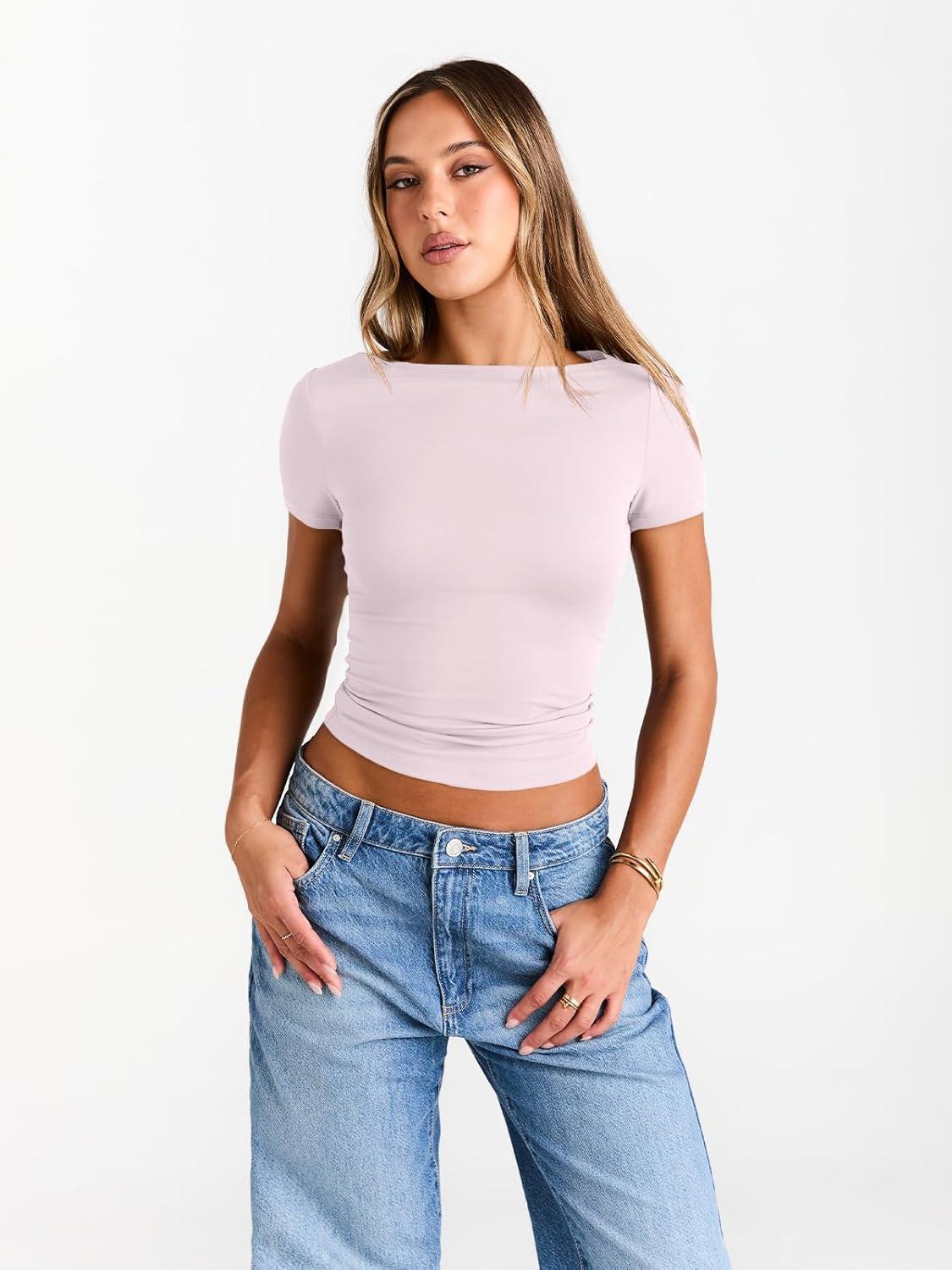 Trendy Queen Womens Boat Neck Tops Short Sleeve T-Shirts Slim Fitted Compression Summer Y2k Basic Clothes 2025(Lightpink)