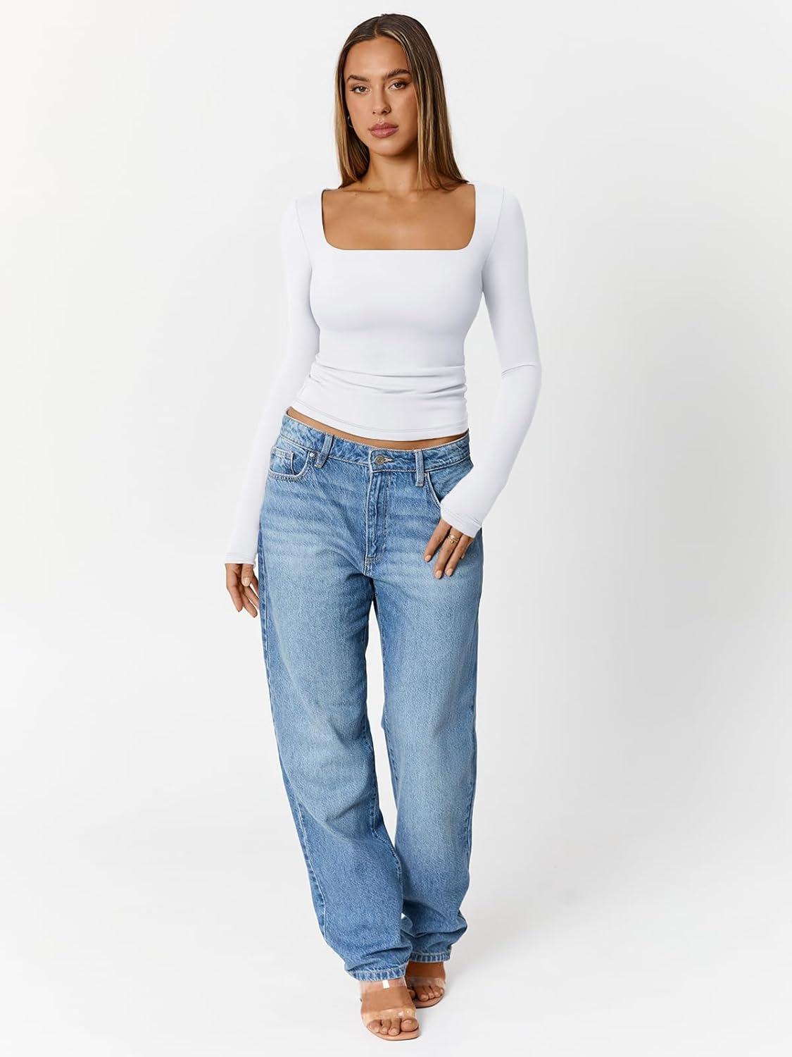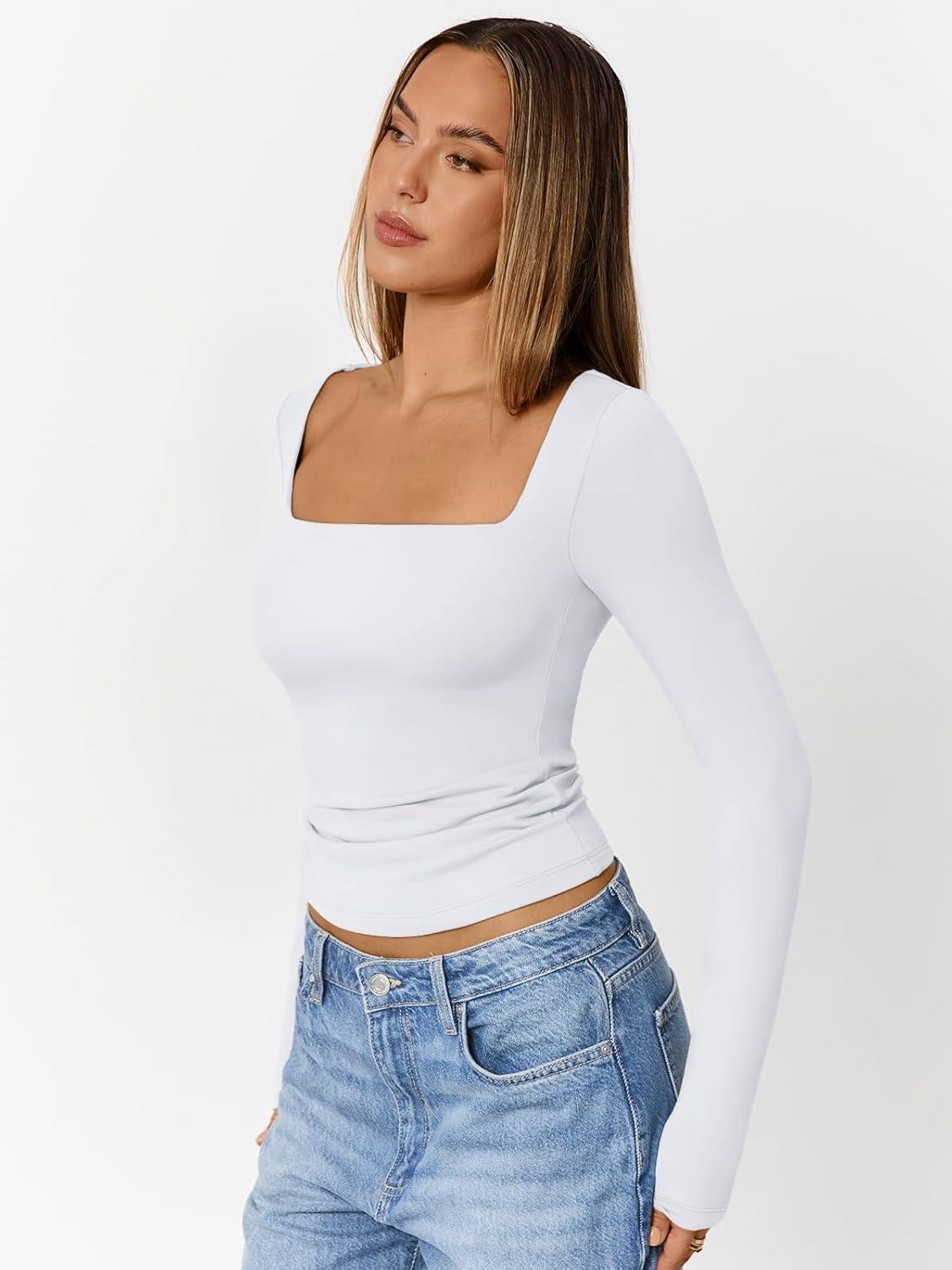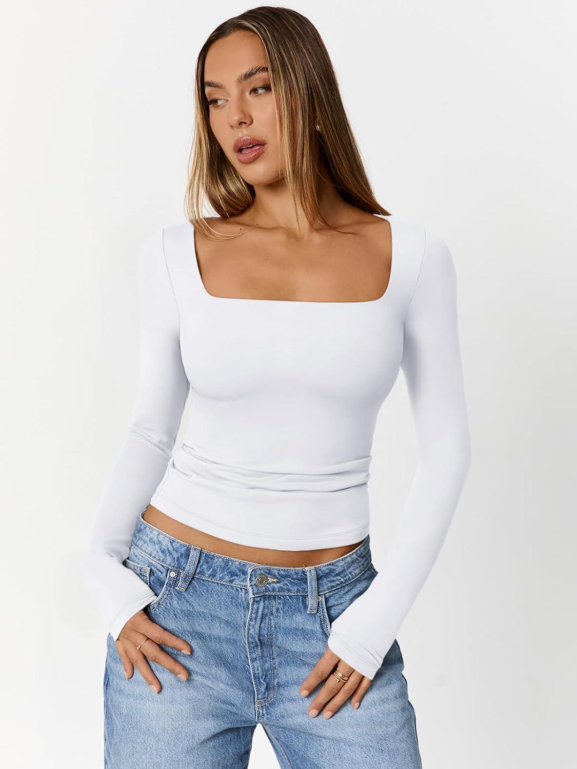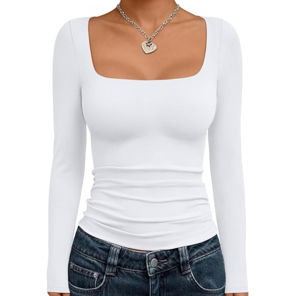 Trendy Queen Womens Double Lined Square Neck Long Sleeve Slightly Crop Slim Fit Tops Casual Layer Basic Tee Shirts 2025(White)