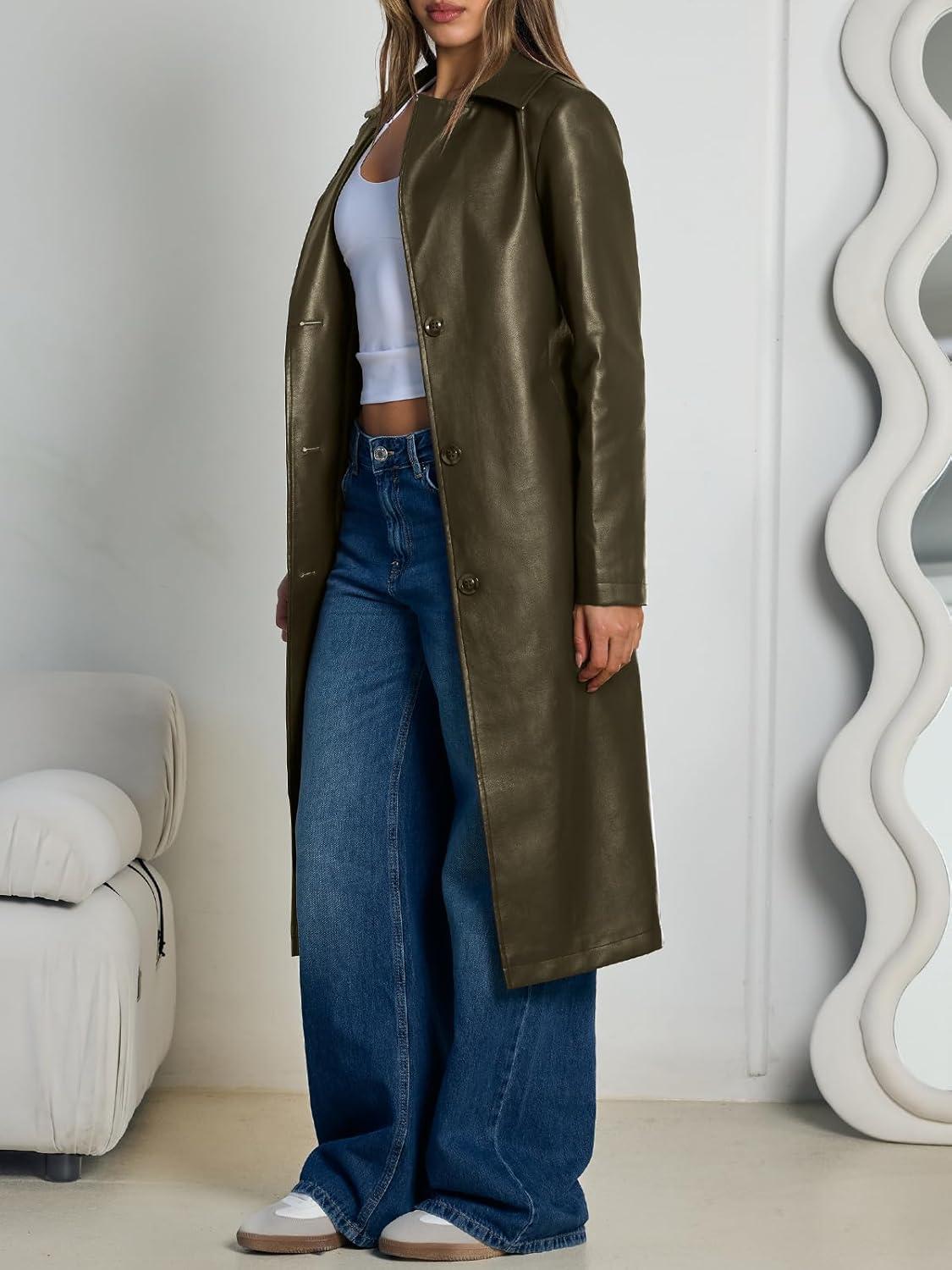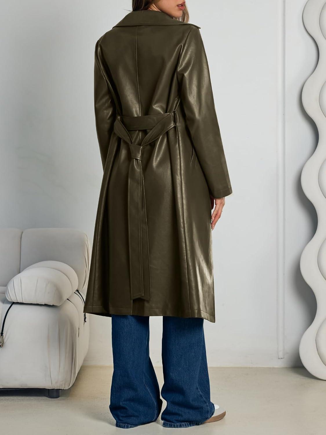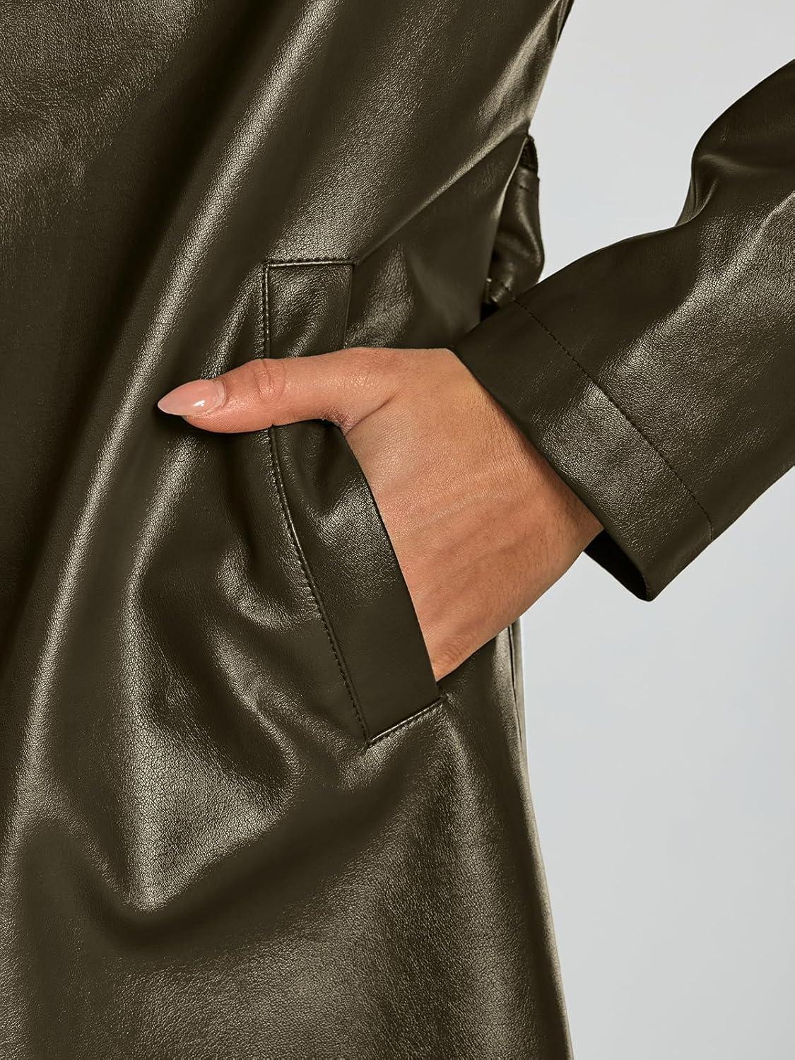 Trendy Queen Womens Long Leather Jackets Trench Coat Blazer Lapel Faux Open Front with Belt(Army Green)