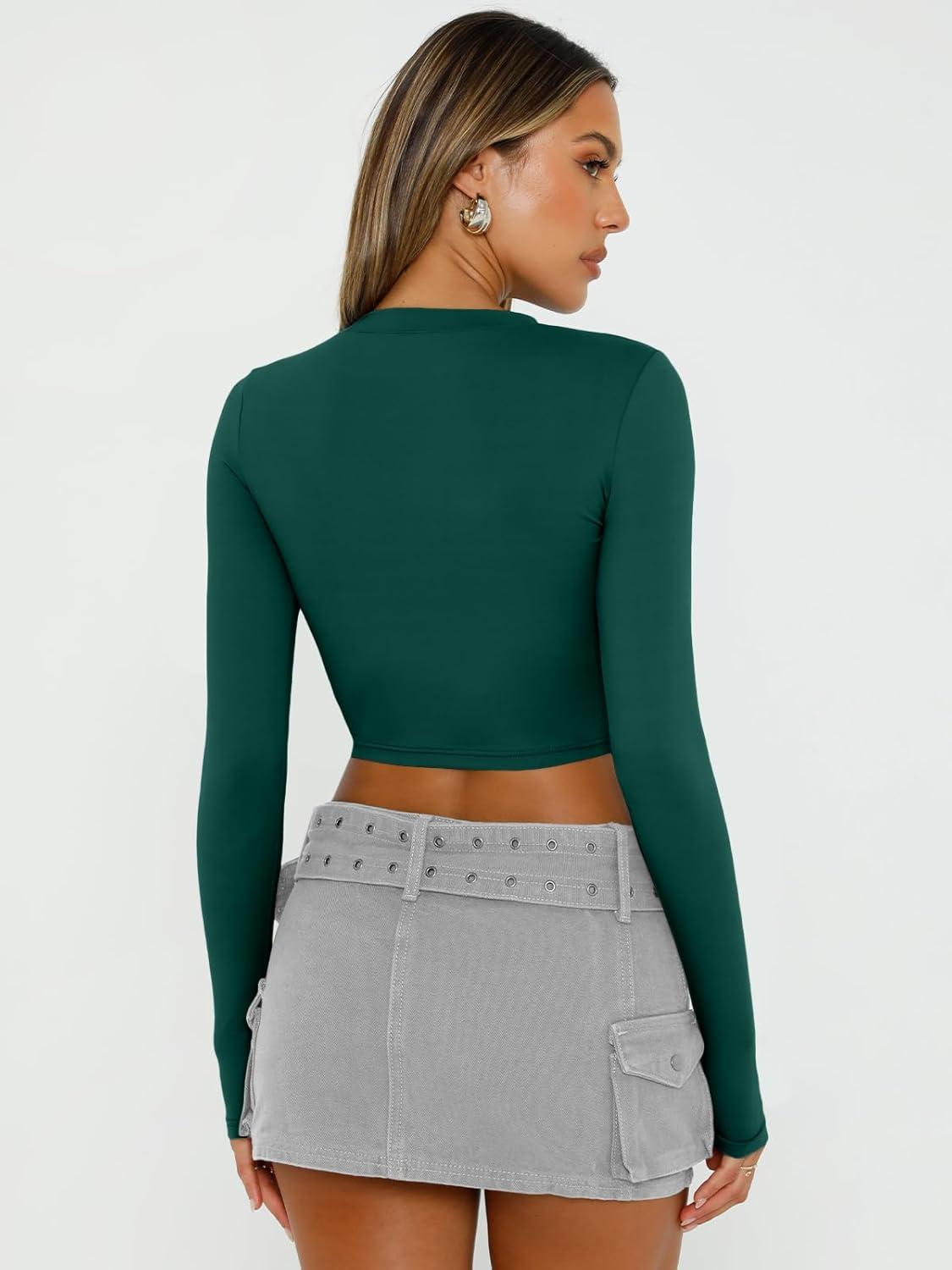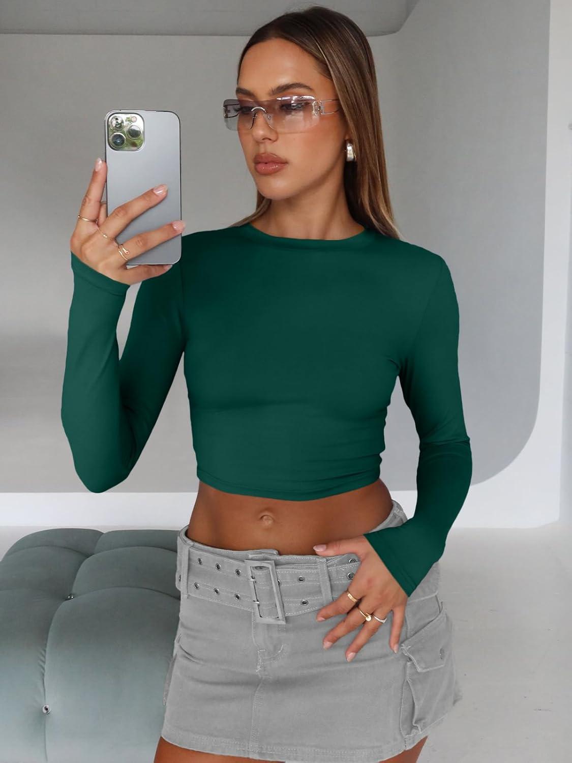 Trendy Queen Womens Long Sleeve Crop Tops Basic Slim Fitted Shirts Fashion 2025 Going Out Y2k Tops Teen Girl Clothes(Dark Green)