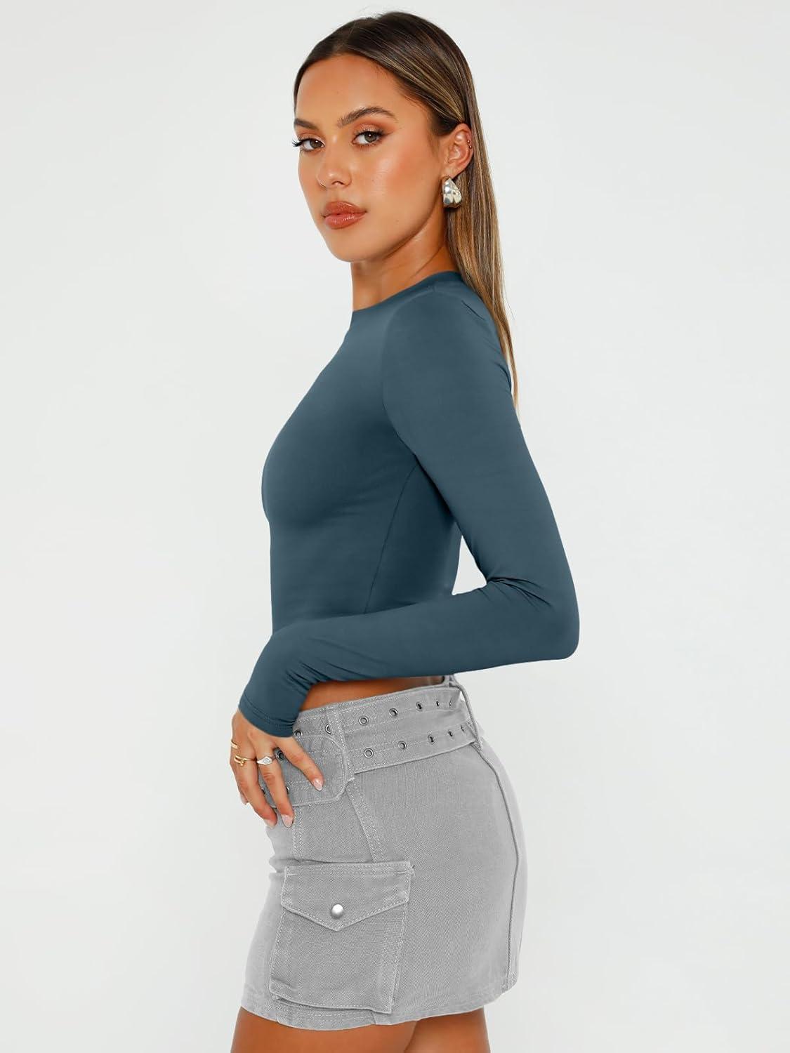 Trendy Queen Womens Long Sleeve Crop Tops Basic Slim Fitted Shirts Fashion 2025 Going Out Y2k Tops Teen Girl Clothes(Haze Blue)