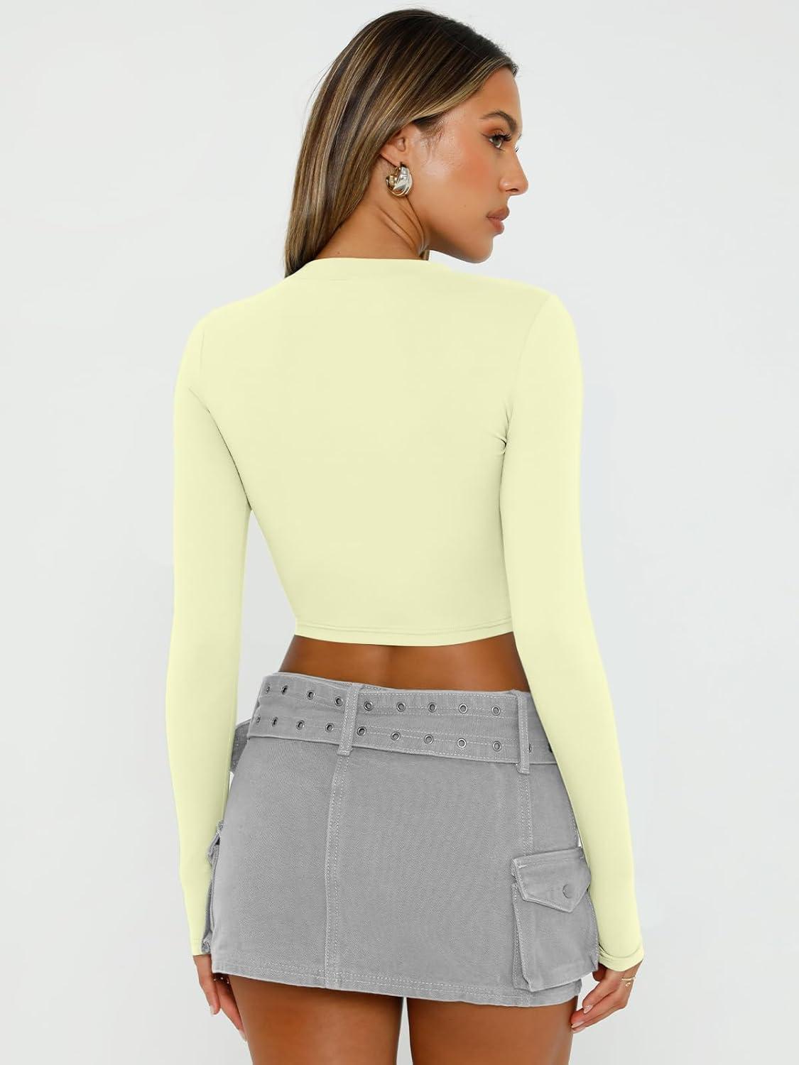Trendy Queen Womens Long Sleeve Crop Tops Basic Slim Fitted Shirts Fashion 2025 Going Out Y2k Tops Teen Girl Clothes(Lemon Yellow)