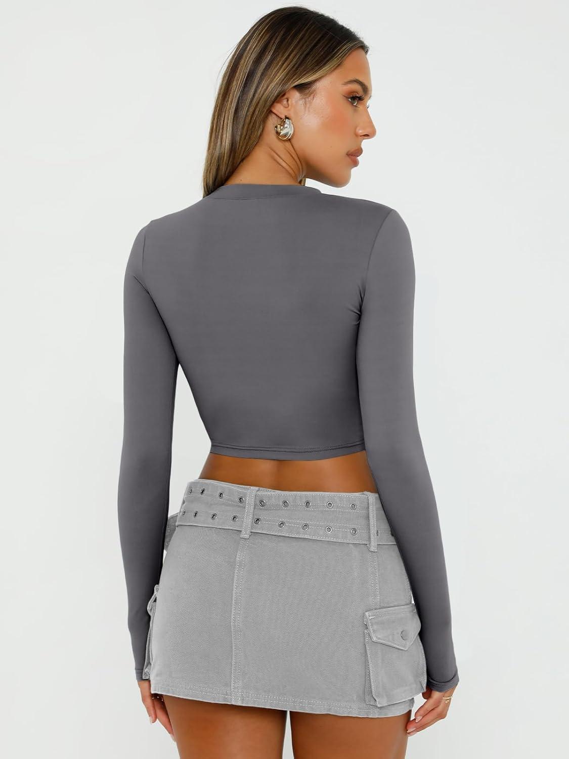 Trendy Queen Womens Long Sleeve Crop Tops Basic Slim Fitted Shirts Fashion 2025 Going Out Y2k Tops Teen Girl Clothes(Light Gray)