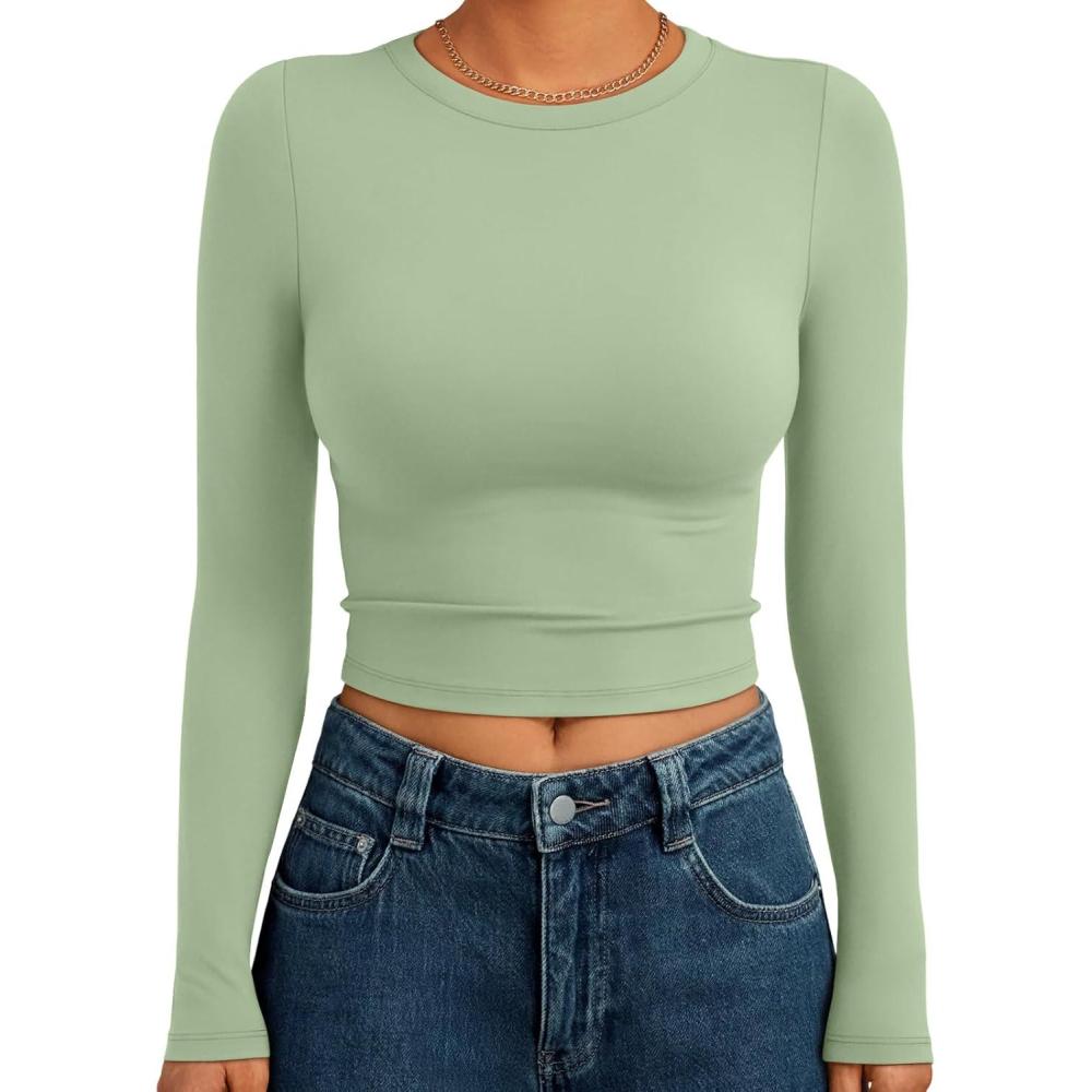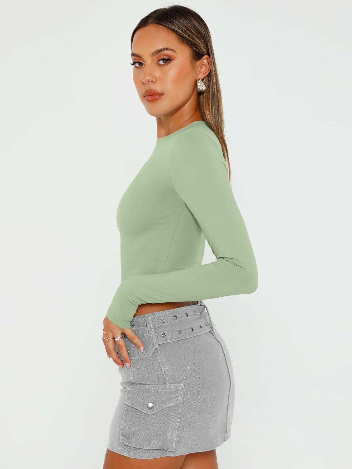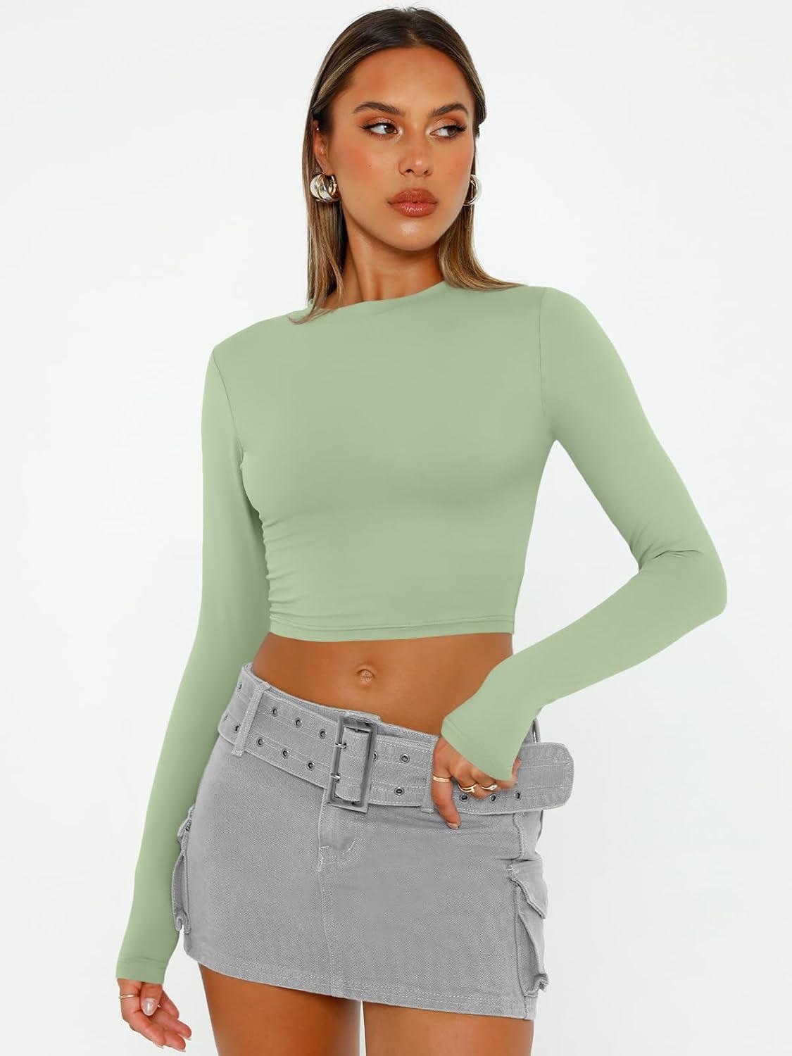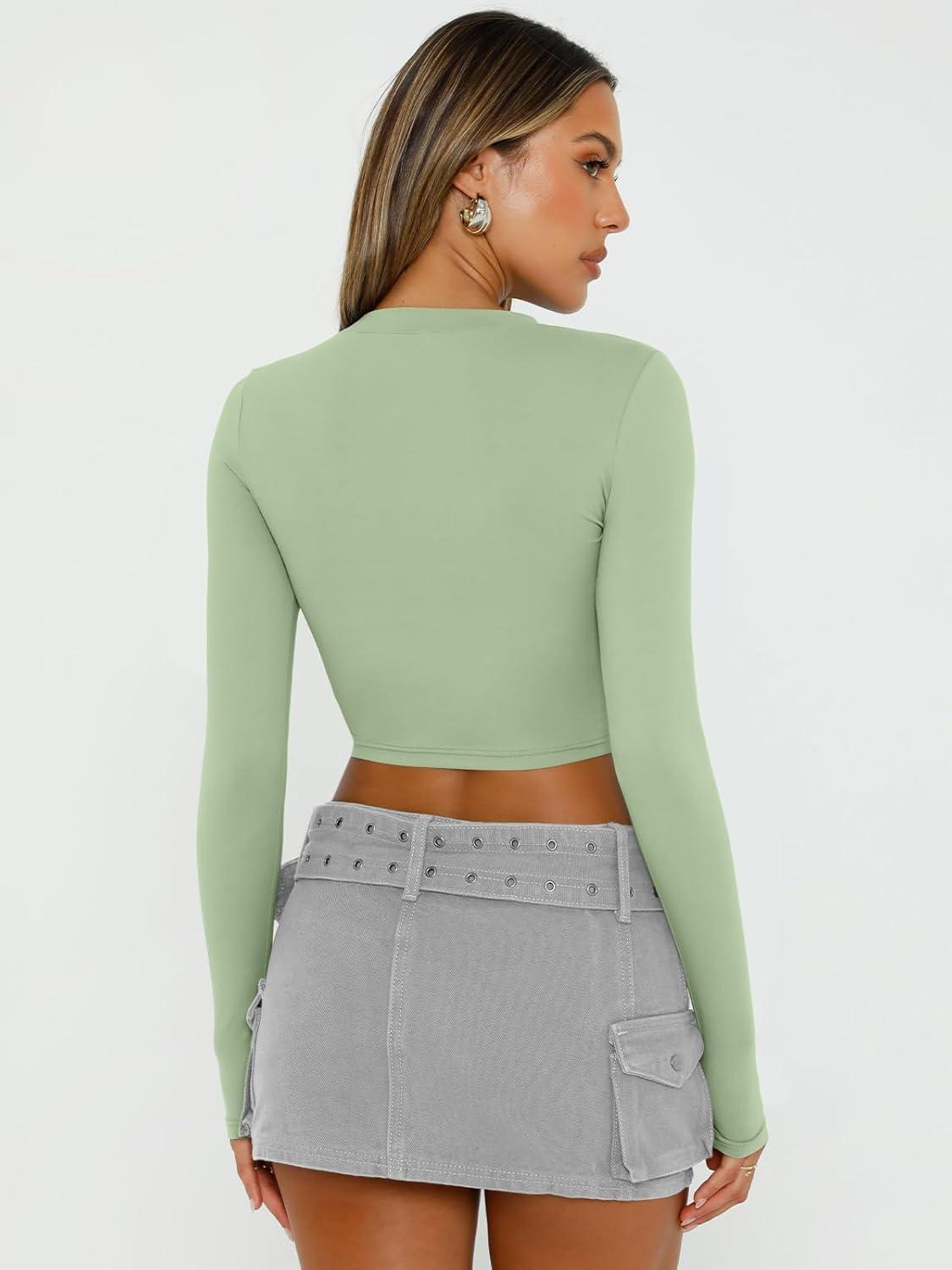 Trendy Queen Womens Long Sleeve Crop Tops Basic Slim Fitted Shirts Fashion 2025 Going Out Y2k Tops Teen Girl Clothes(Light Green)