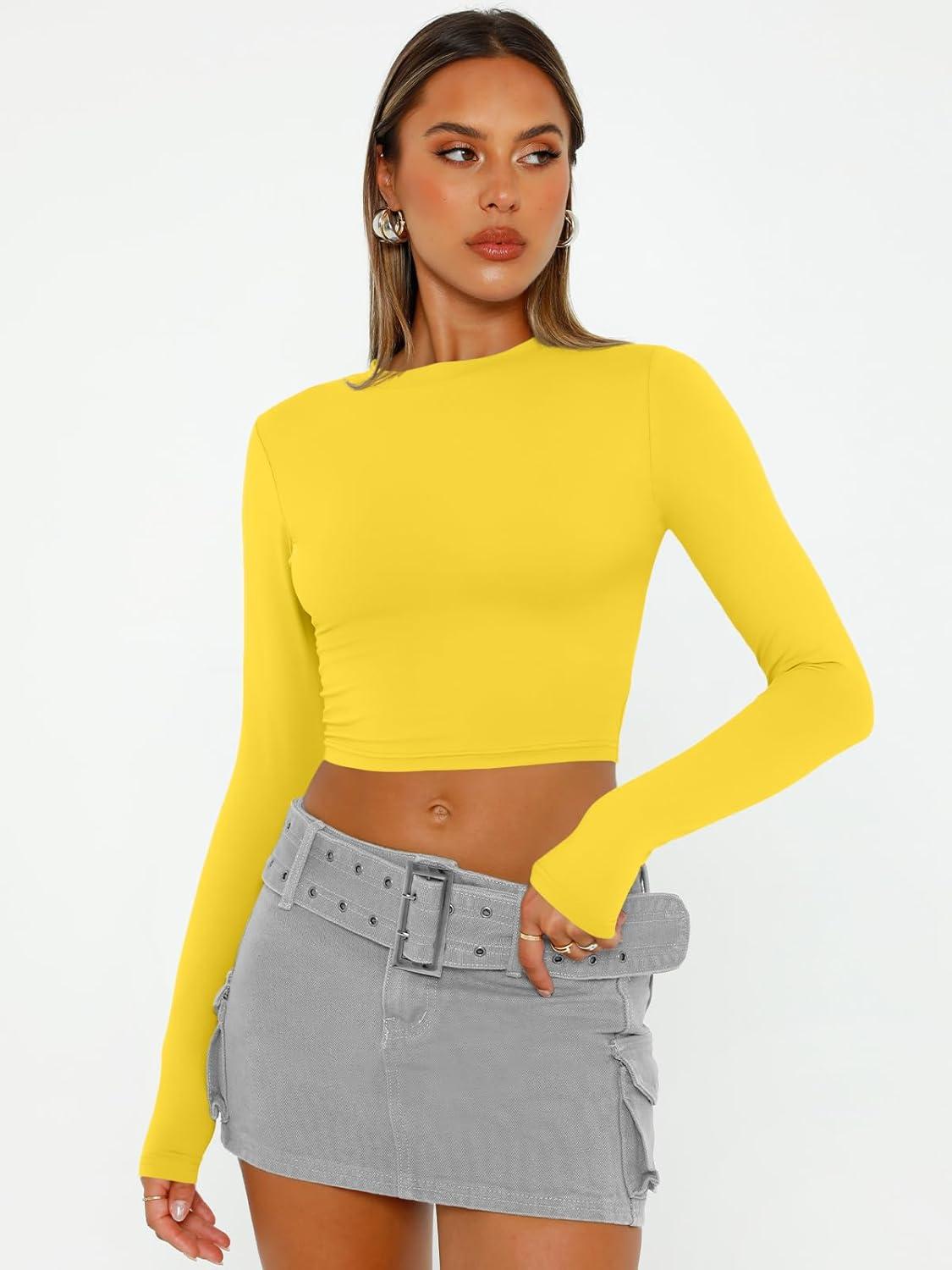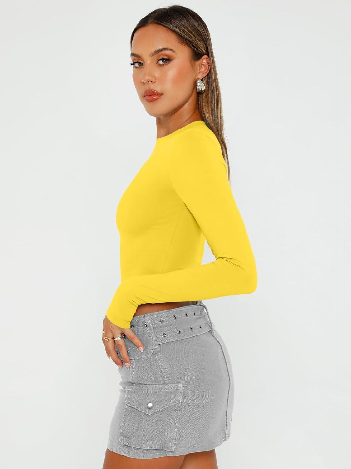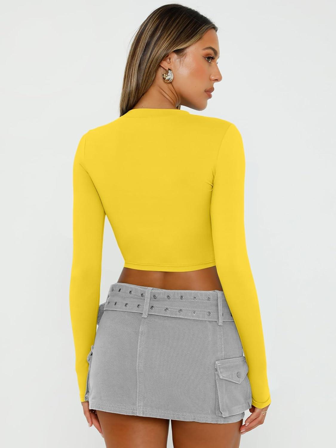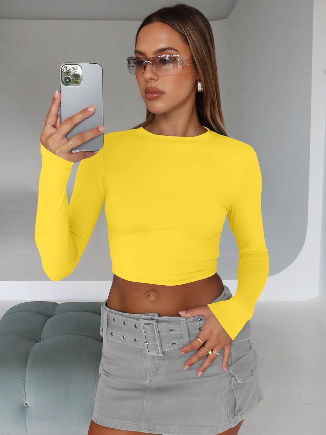 Trendy Queen Womens Long Sleeve Crop Tops Basic Slim Fitted Shirts Fashion 2025 Going Out Y2k Tops Teen Girl Clothes(Yellow)