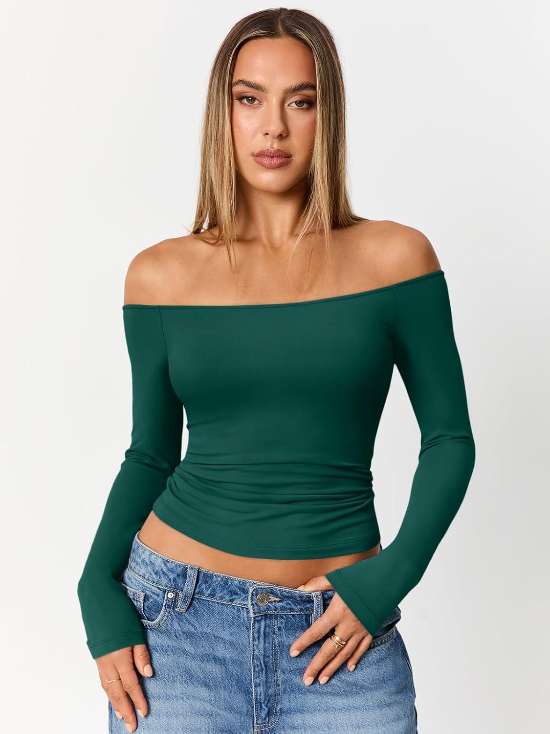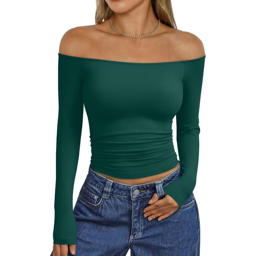 Trendy Queen Womens Long Sleeve Off The Shoulder Tops Going Out Cute Basic Y2K Fall Fashion 2025 Outfits Clothes(Green)