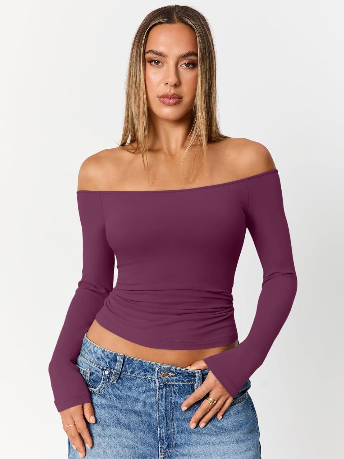 Trendy Queen Womens Long Sleeve Off The Shoulder Tops Going Out Cute Basic Y2K Fall Fashion 2025 Outfits Clothes(Purple)