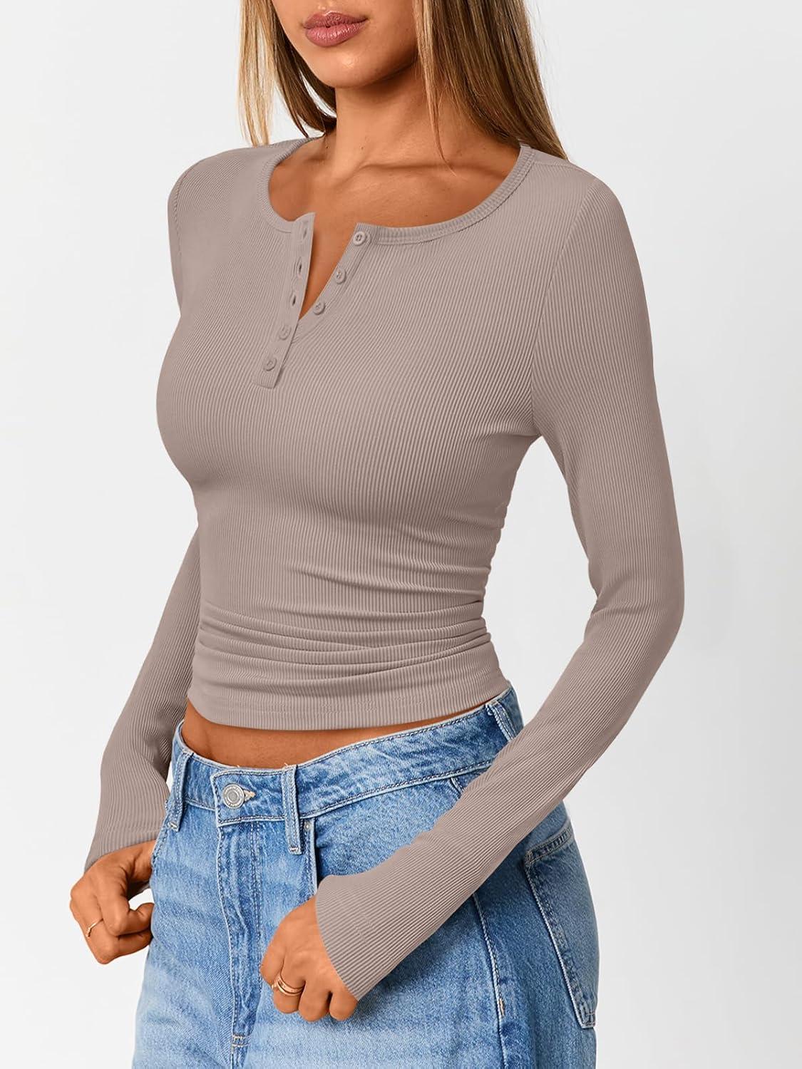 Trendy Queen Womens Long Sleeve Shirts 2025 Henley Casual Fall Outfits Fitted Tops Ribbed Fashion Basic Tees(Taupe)