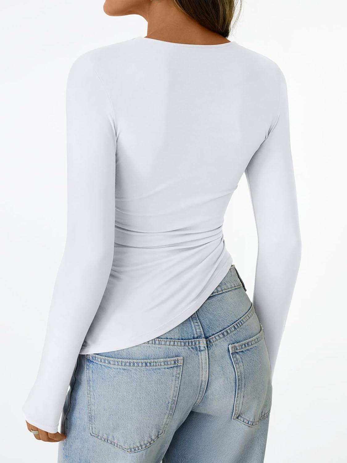 Trendy Queen Womens Long Sleeve Shirts Asymmetrical Ruched Going Out Slim Fit Tees Sexy Cute Y2k Fall Fashion Tops 2025(White)