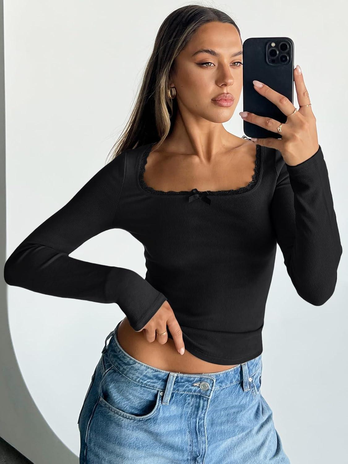 Trendy Queen Womens Long Sleeve Shirts Crop Square Neck Ribbed Tops Basic Slim Fit Y2K Fall Winter Clothes Outfits 2025(Black)