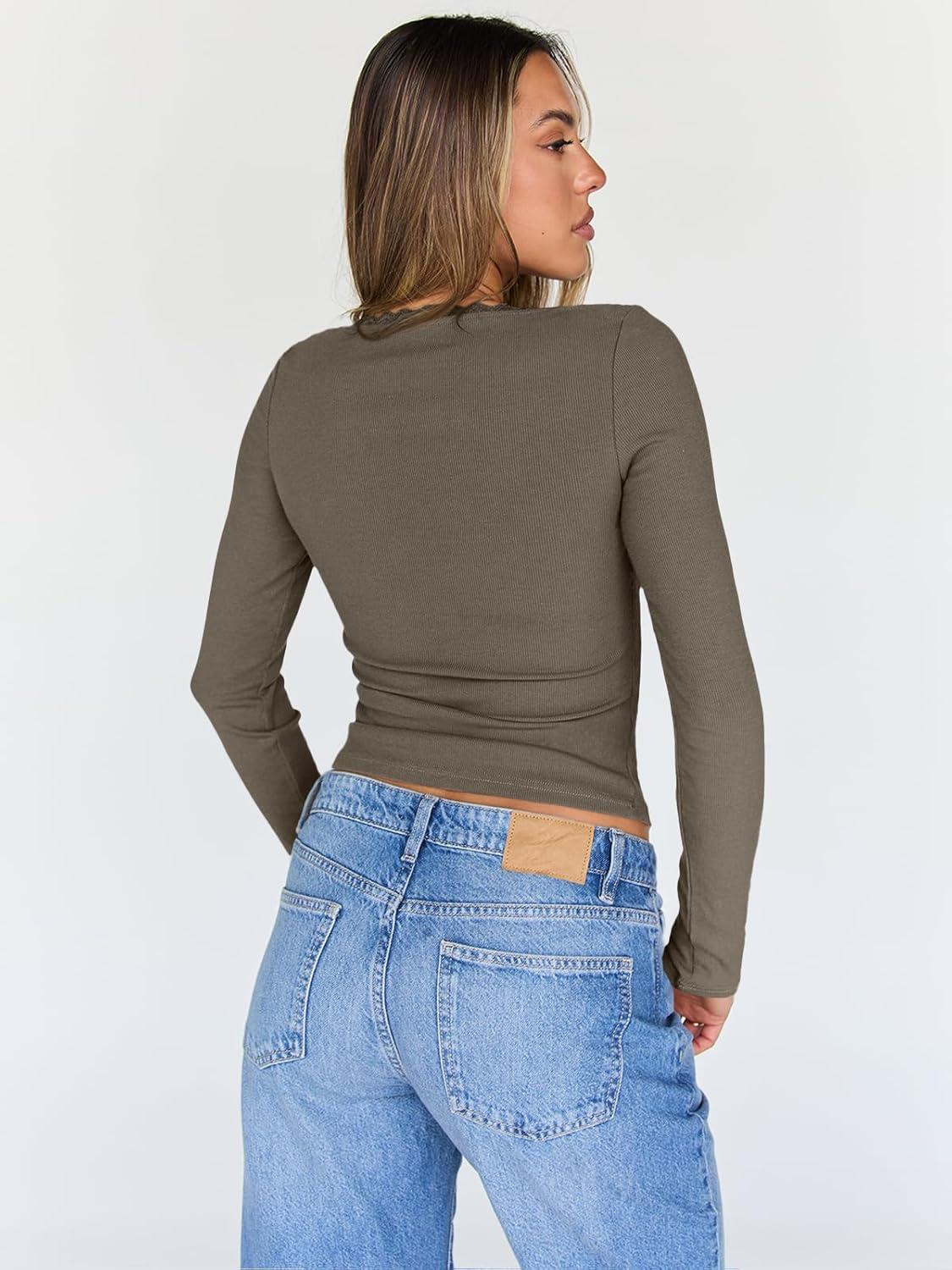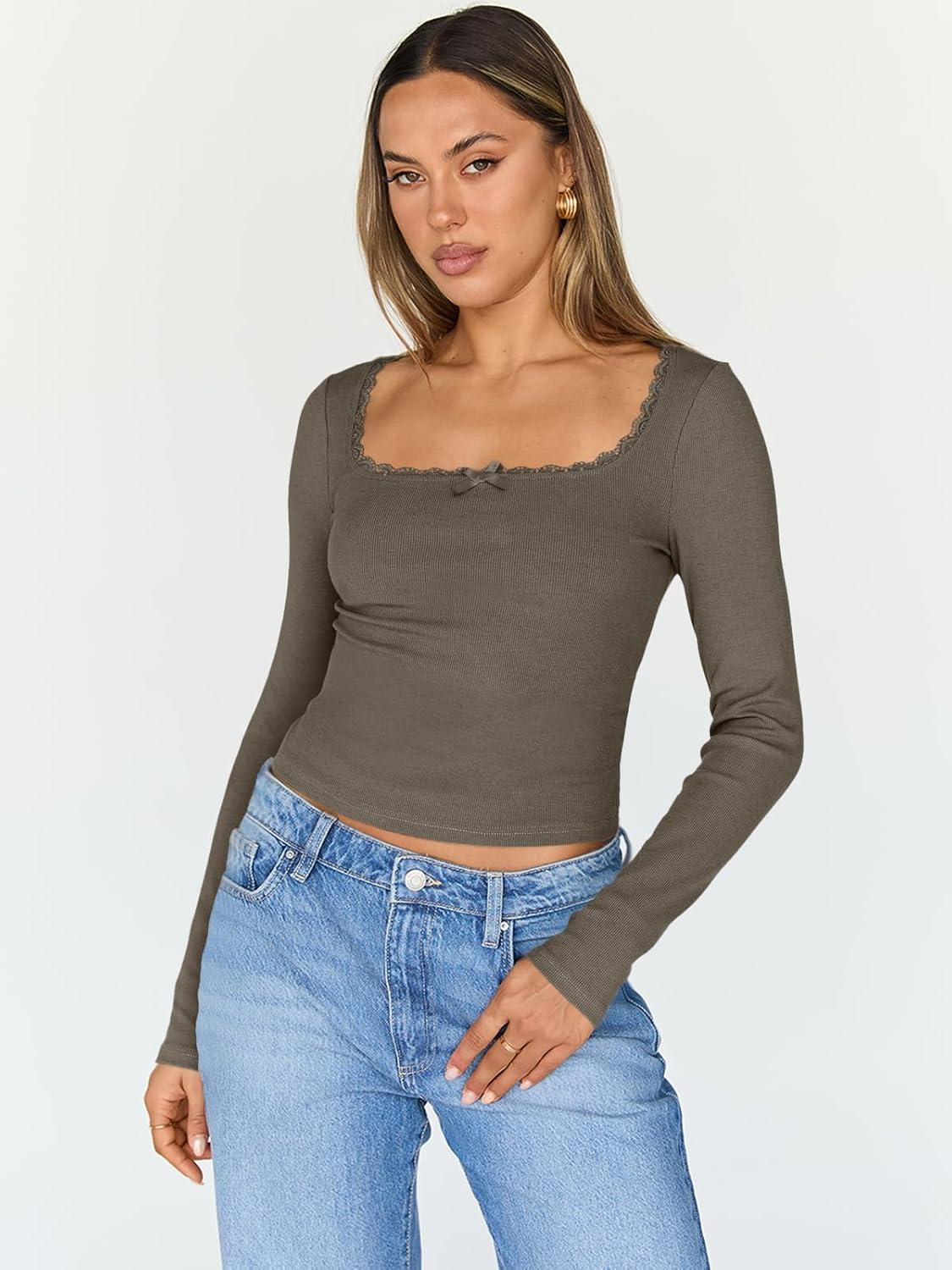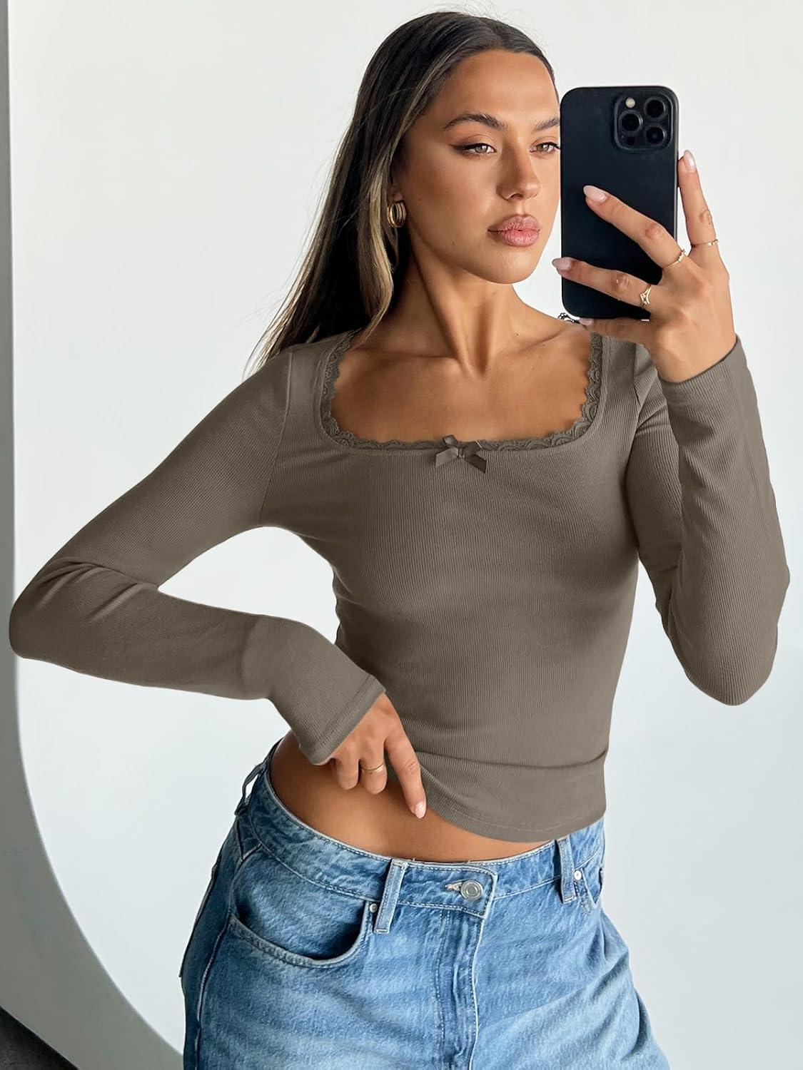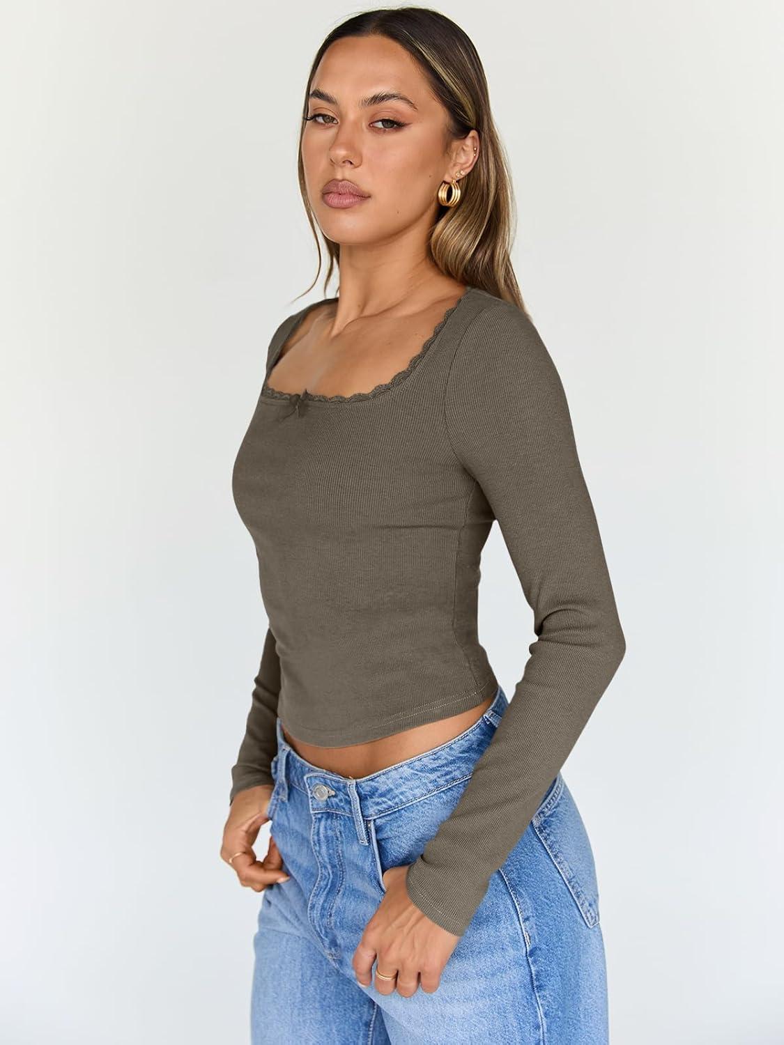 Trendy Queen Womens Long Sleeve Shirts Crop Square Neck Ribbed Tops Basic Slim Fit Y2K Fall Winter Clothes Outfits 2025(Coffee)