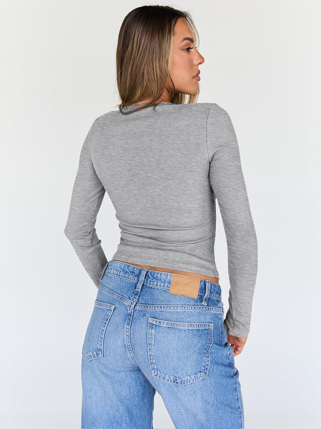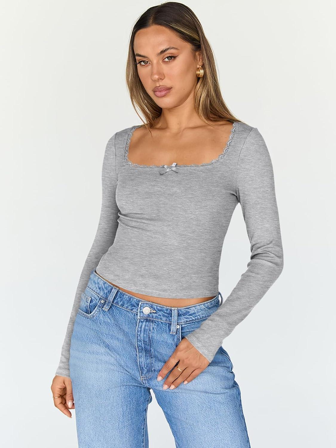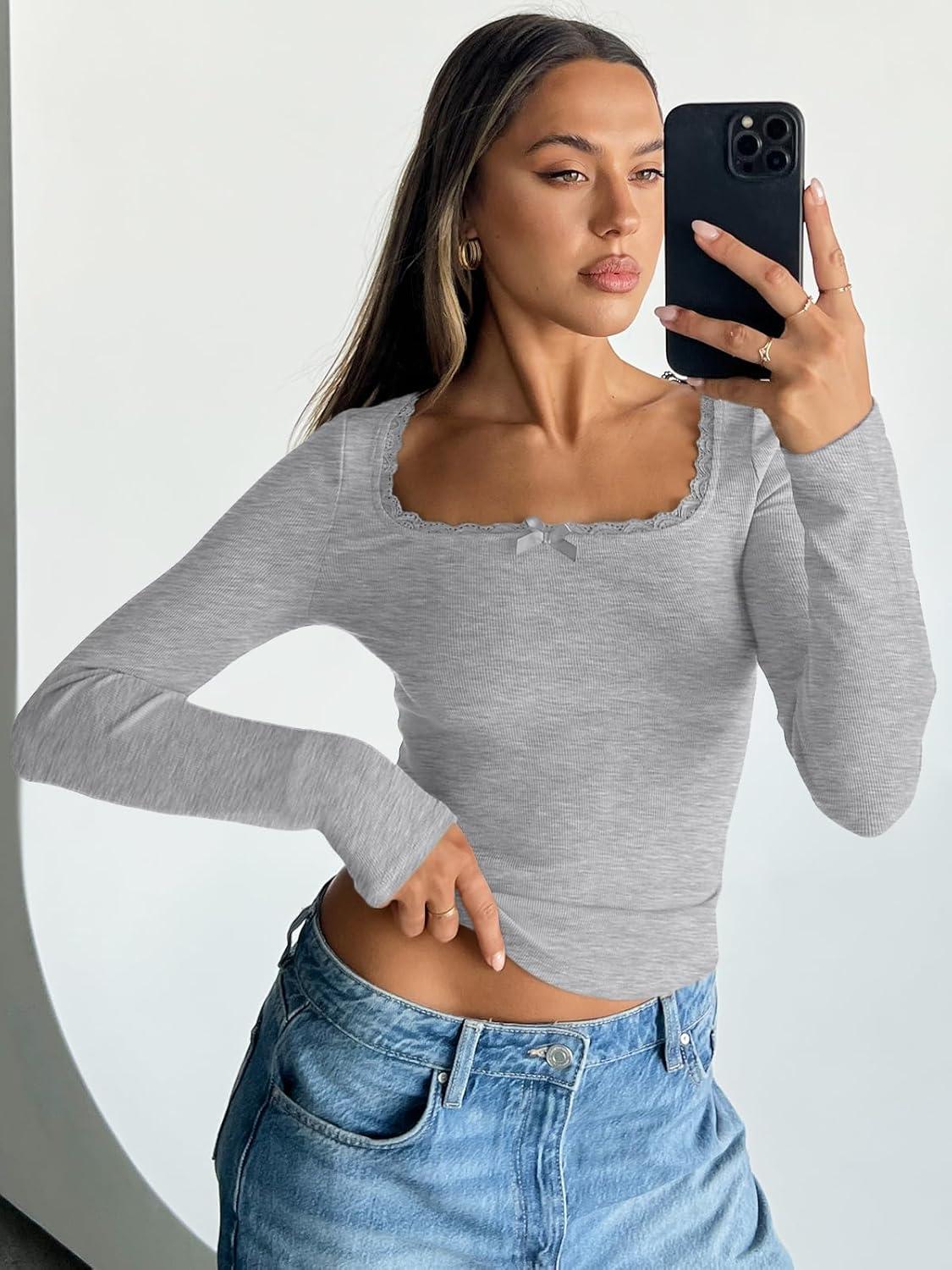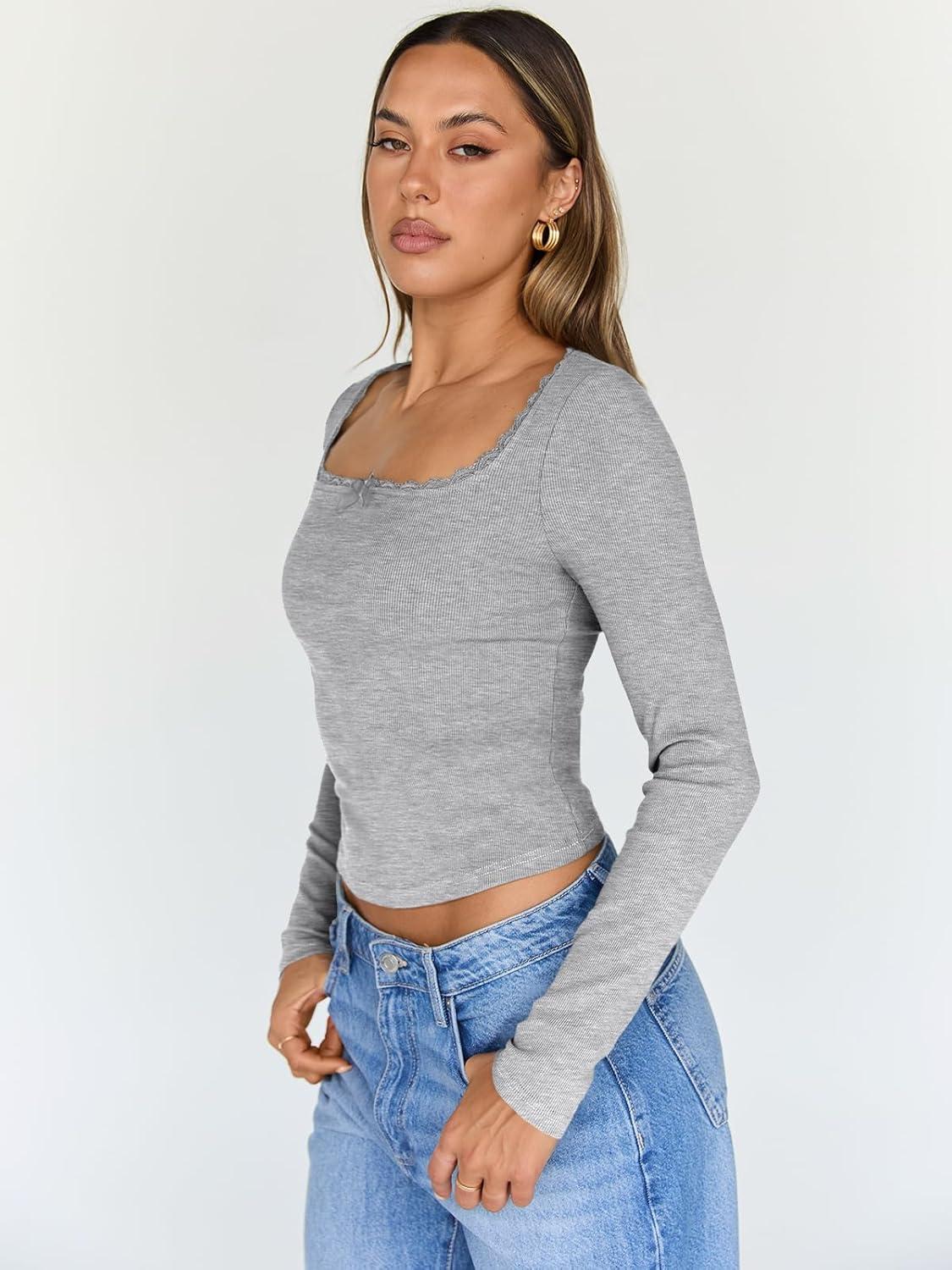 Trendy Queen Womens Long Sleeve Shirts Crop Square Neck Ribbed Tops Basic Slim Fit Y2K Fall Winter Clothes Outfits 2025(Grey)