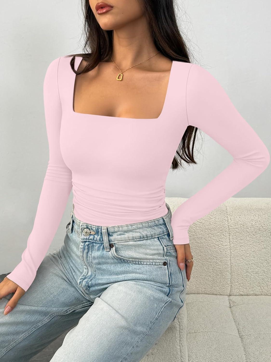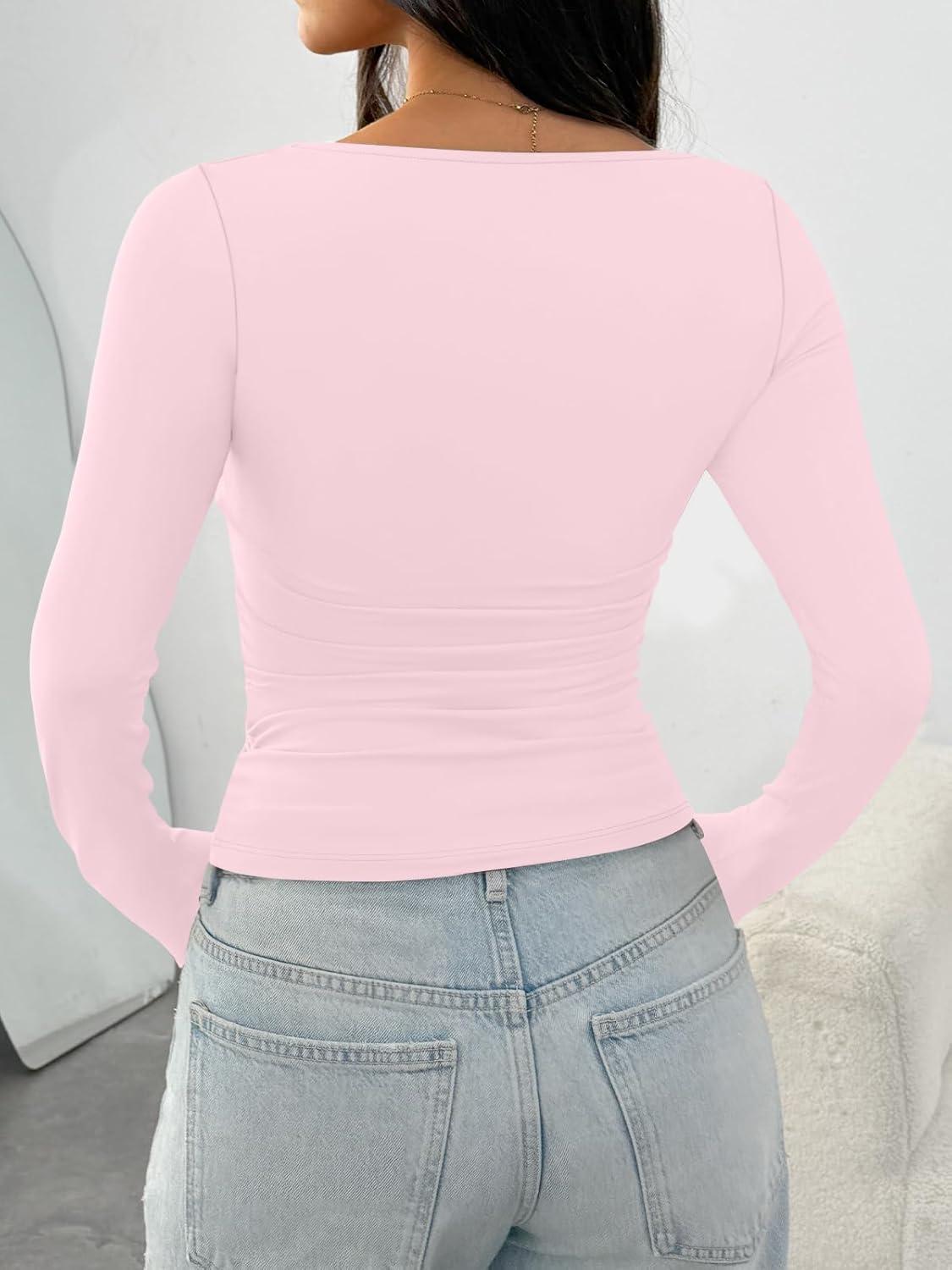 Trendy Queen Womens Long Sleeve Shirts Crop Tops Basic Square Neck Going Out Fall Fashion 2025 Fitted Clothes Workout Outfits(Pink)