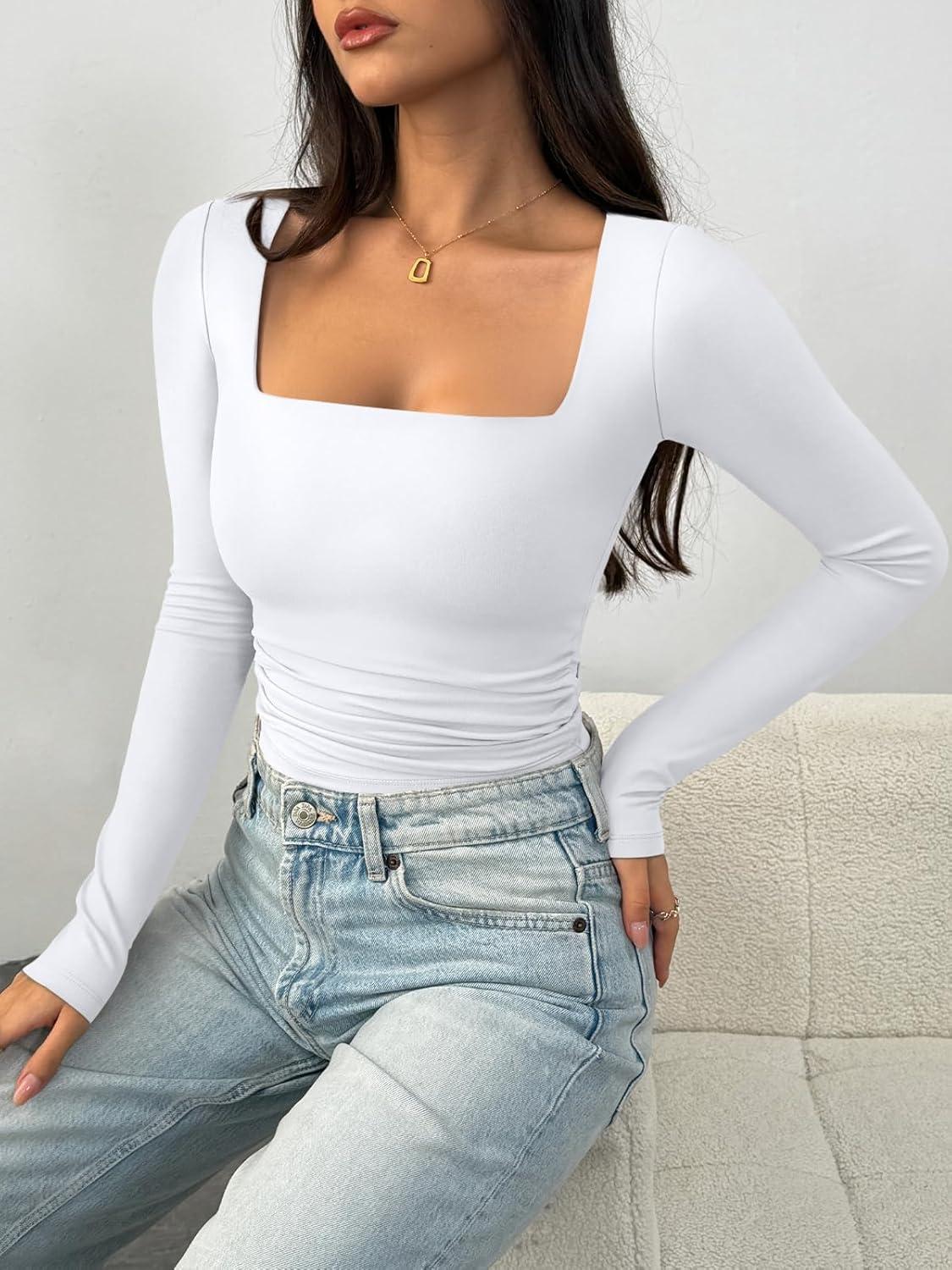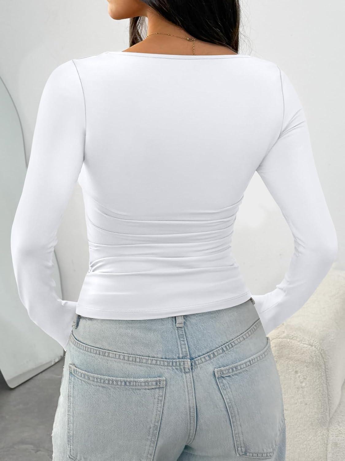 Trendy Queen Womens Long Sleeve Shirts Crop Tops Basic Square Neck Going Out Fall Fashion 2025 Fitted Clothes Workout Outfits(White)