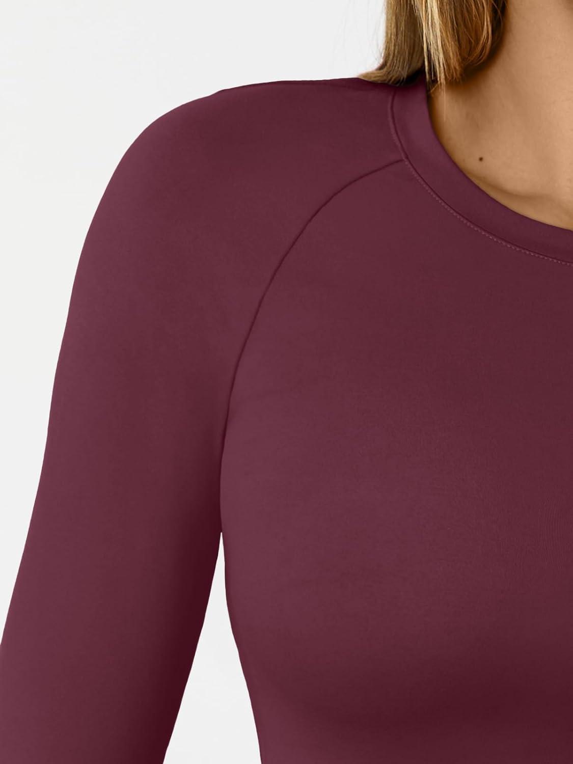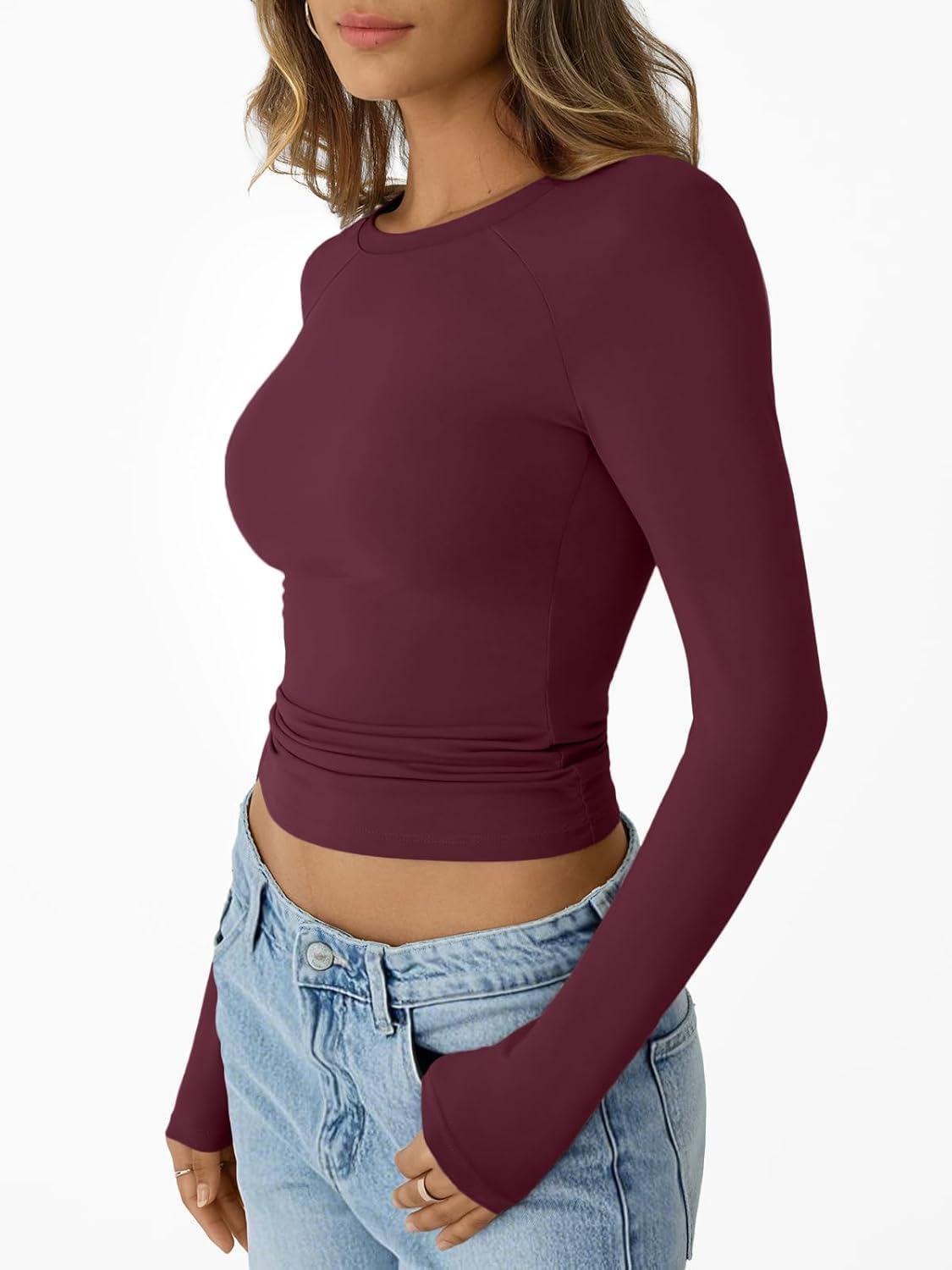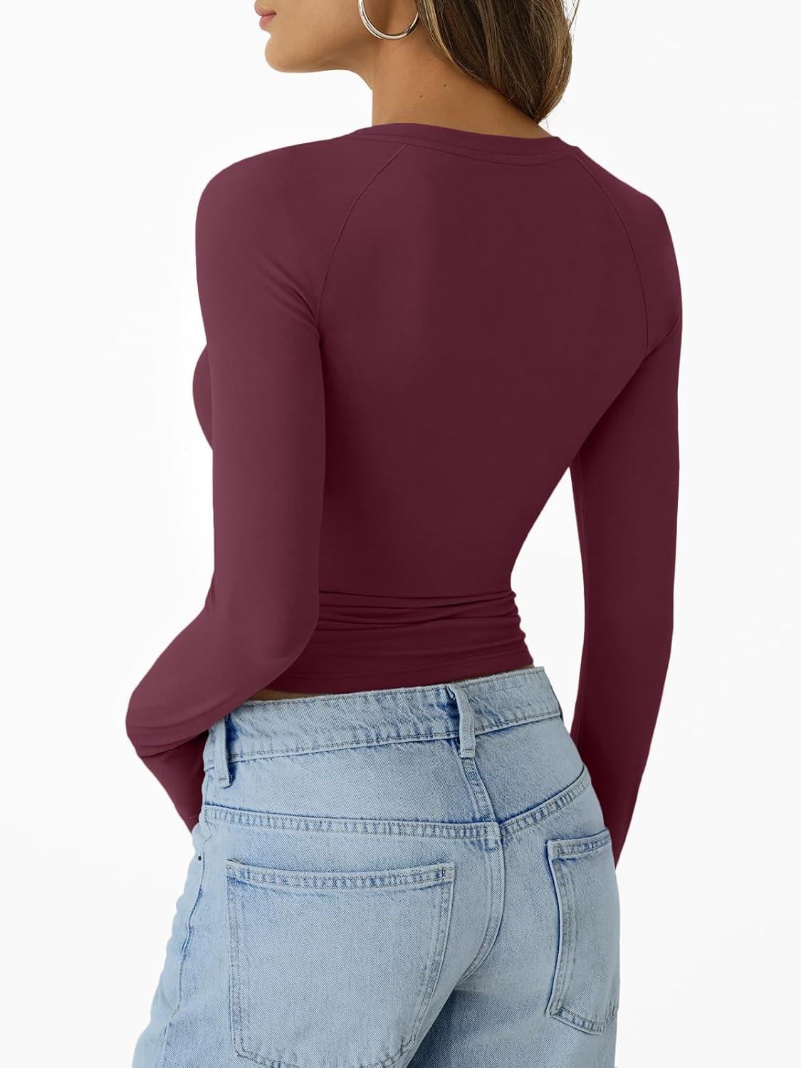 Trendy Queen Womens Long Sleeve Shirts Crop Tops Basic Workout Tees Going Out for Teen Girls(Wine)
