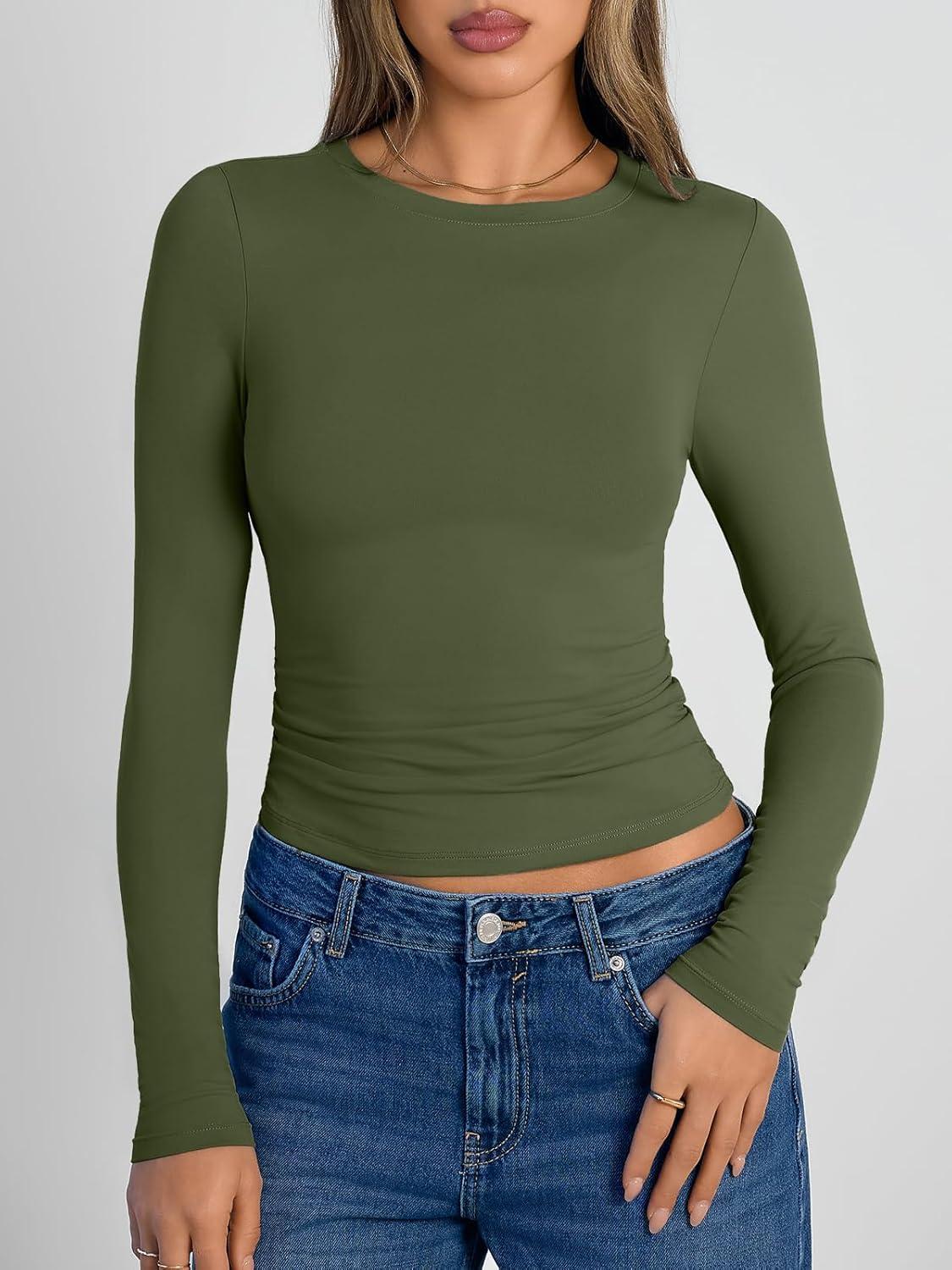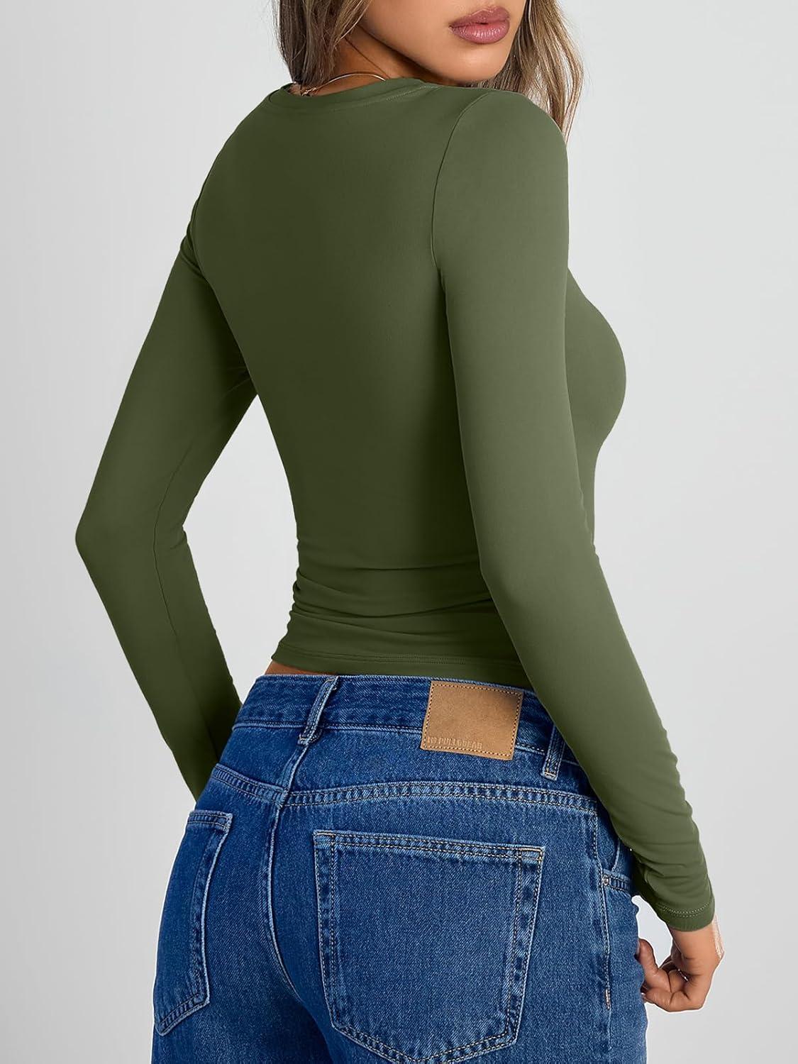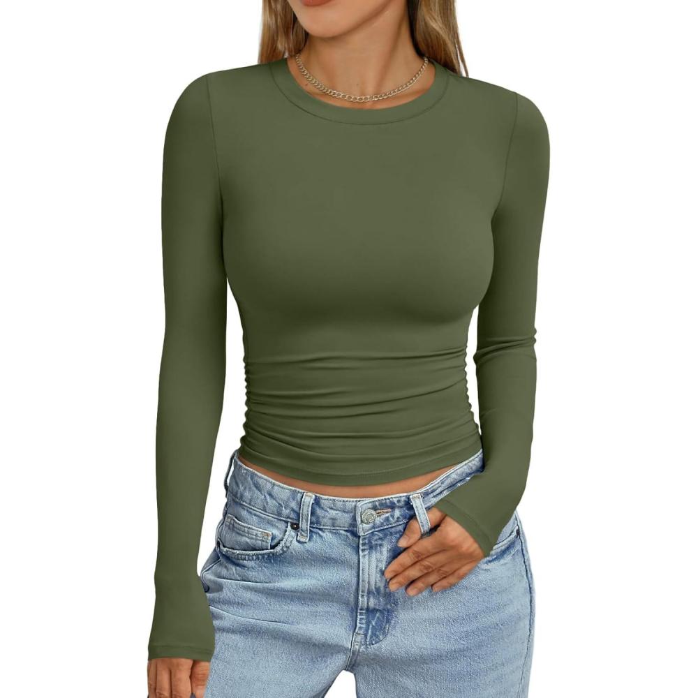 Trendy Queen Womens Long Sleeve Shirts Crop Tops Fall Fashion 2025 Going Out Basic Winter Clothes(Armygreen)