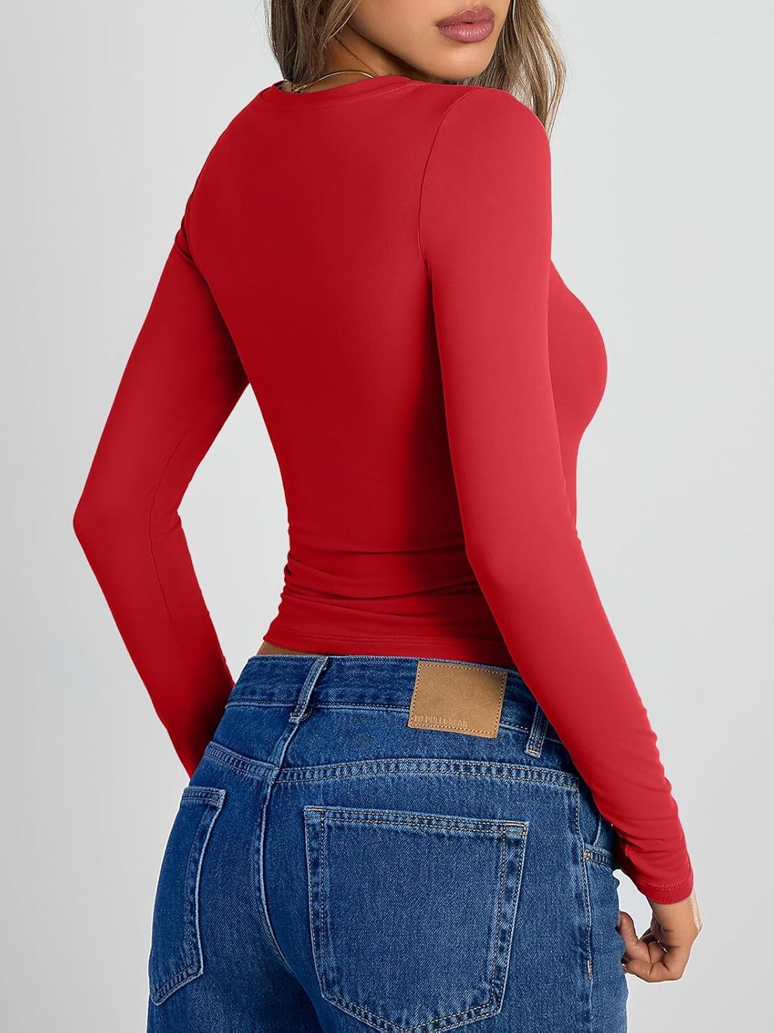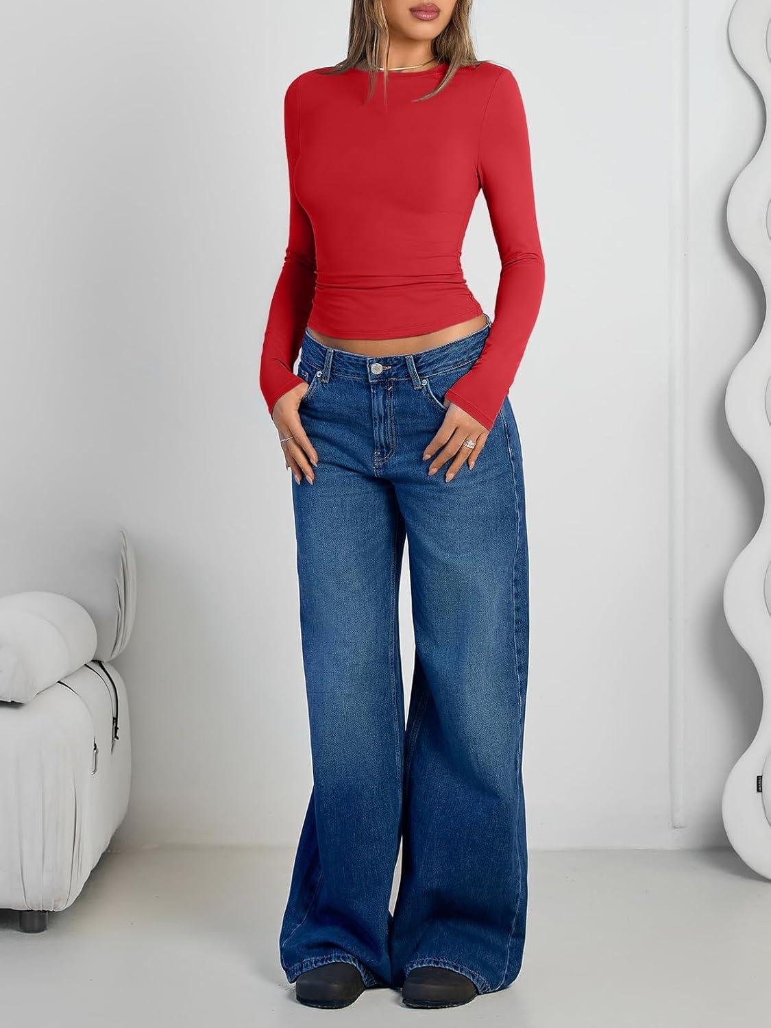 Trendy Queen Womens Long Sleeve Shirts Crop Tops Fall Fashion 2025 Going Out Basic Winter Clothes(Red)