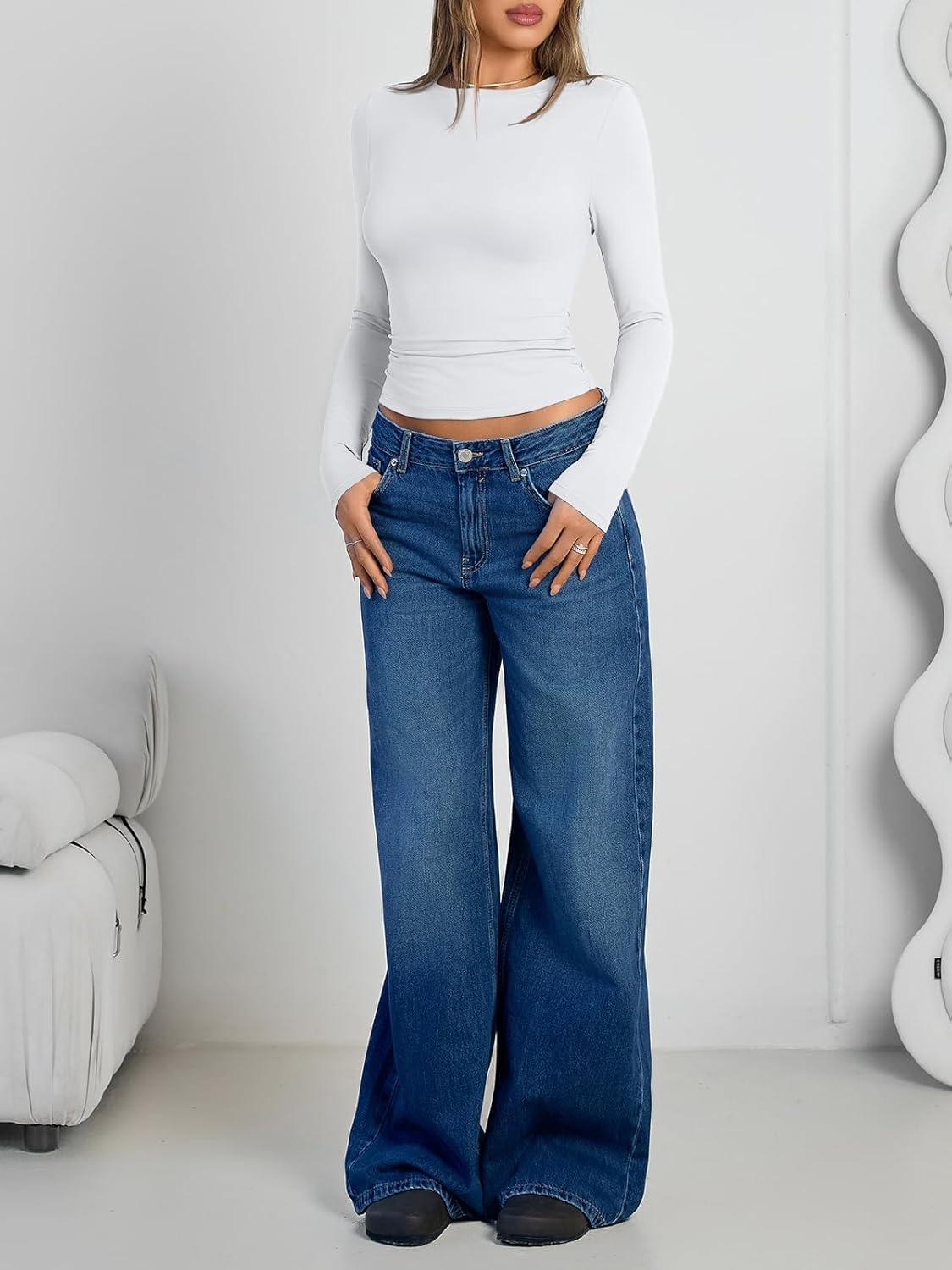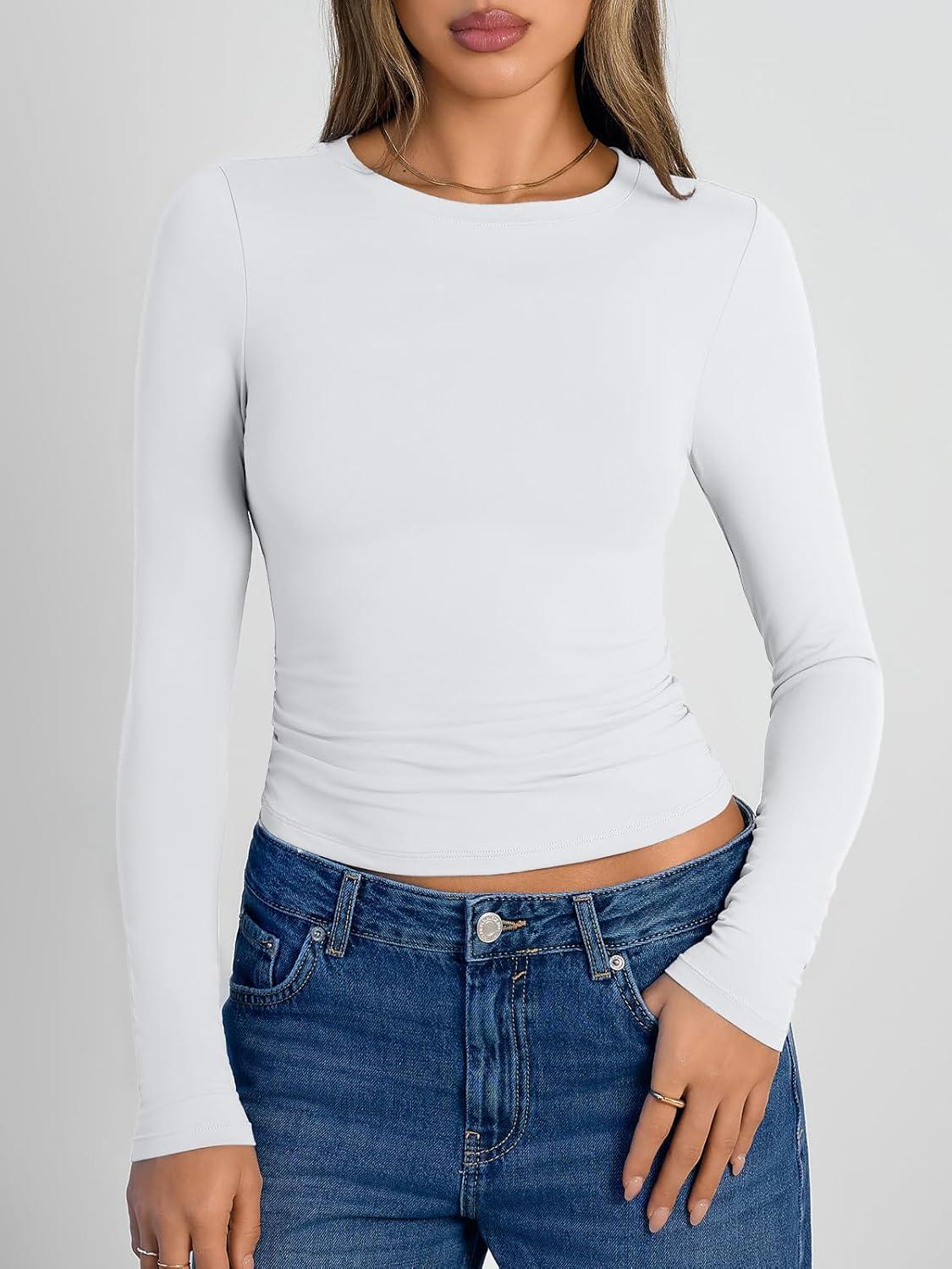 Trendy Queen Womens Long Sleeve Shirts Crop Tops Fall Fashion 2025 Going Out Basic Winter Clothes(White)