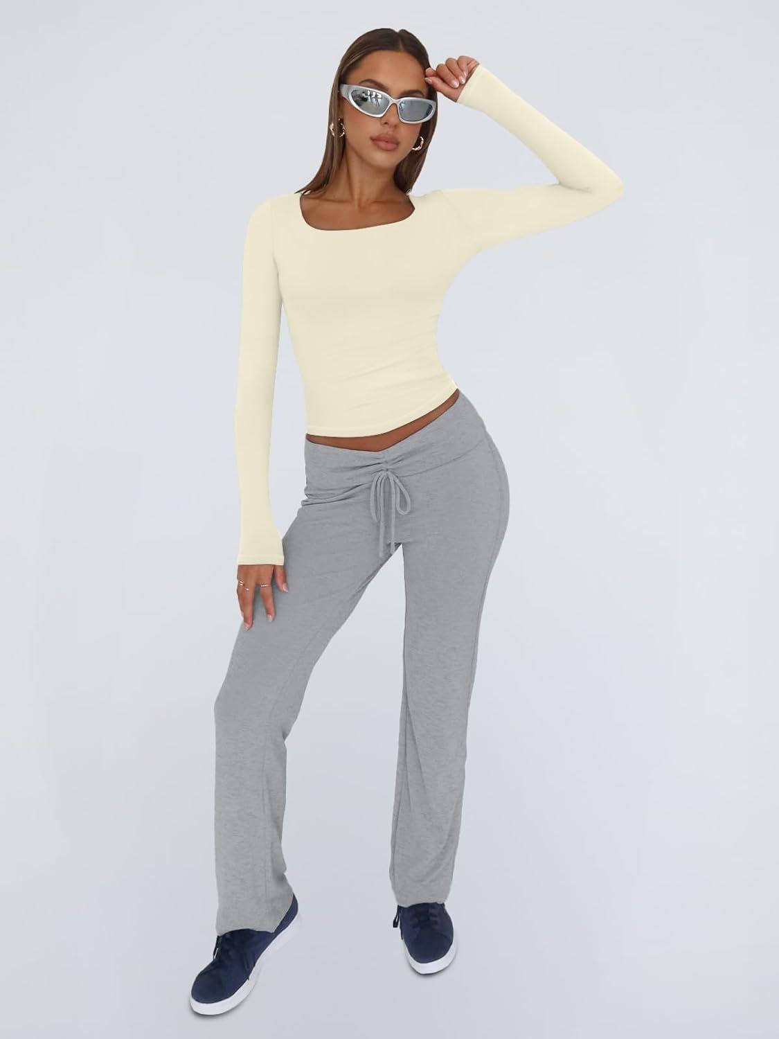 Trendy Queen Womens Long Sleeve Shirts Crop Tops Fall Fashion 2025 Square Neck Going Out Basics Tees Y2k Clothes(Apricot)