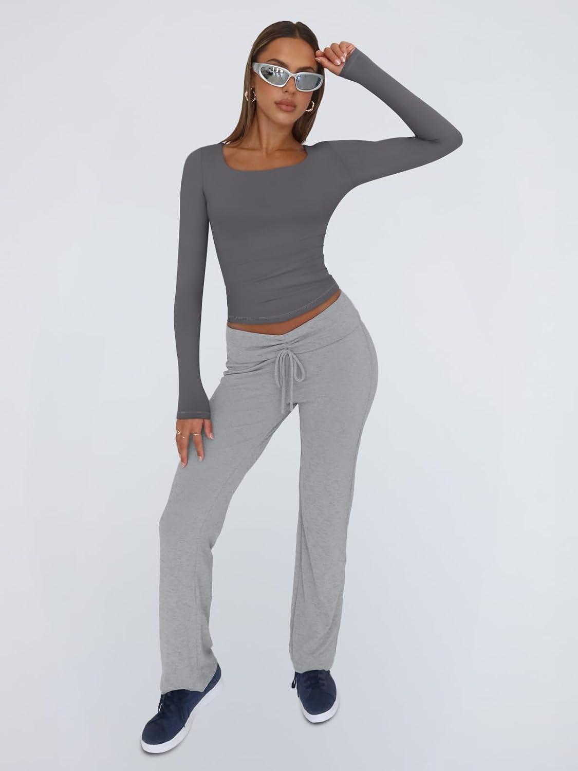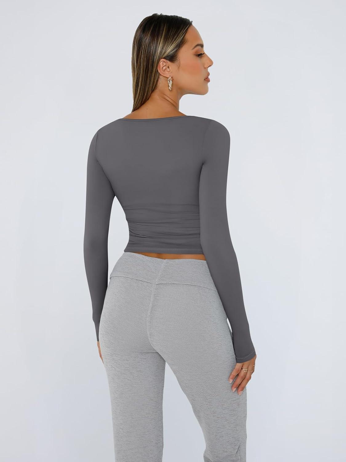 Trendy Queen Womens Long Sleeve Shirts Crop Tops Fall Fashion 2025 Square Neck Going Out Basics Tees Y2k Clothes(Light Gray)