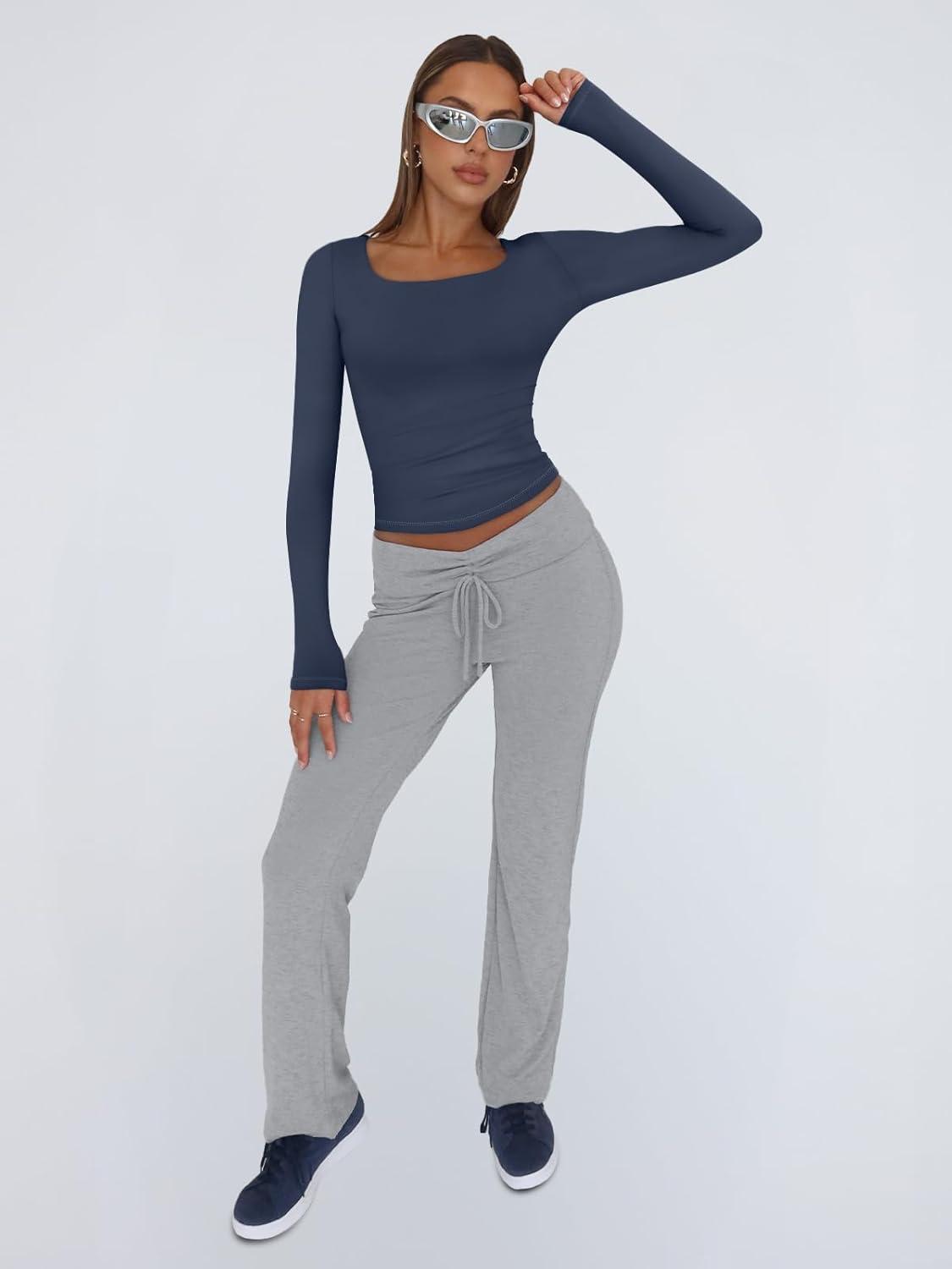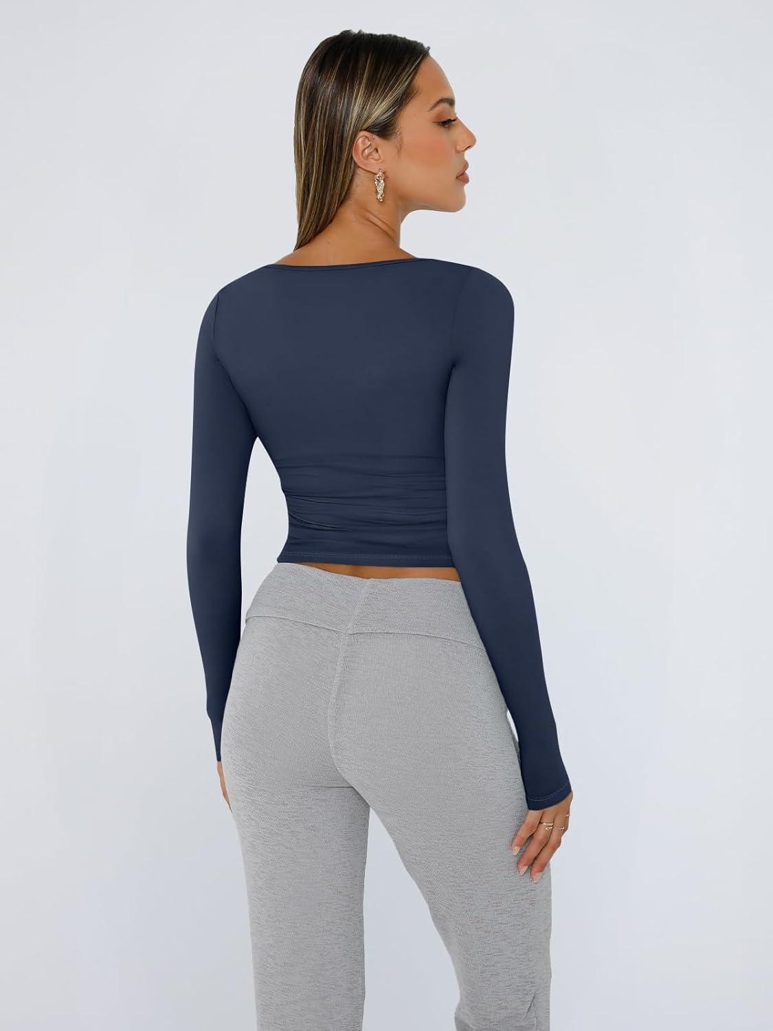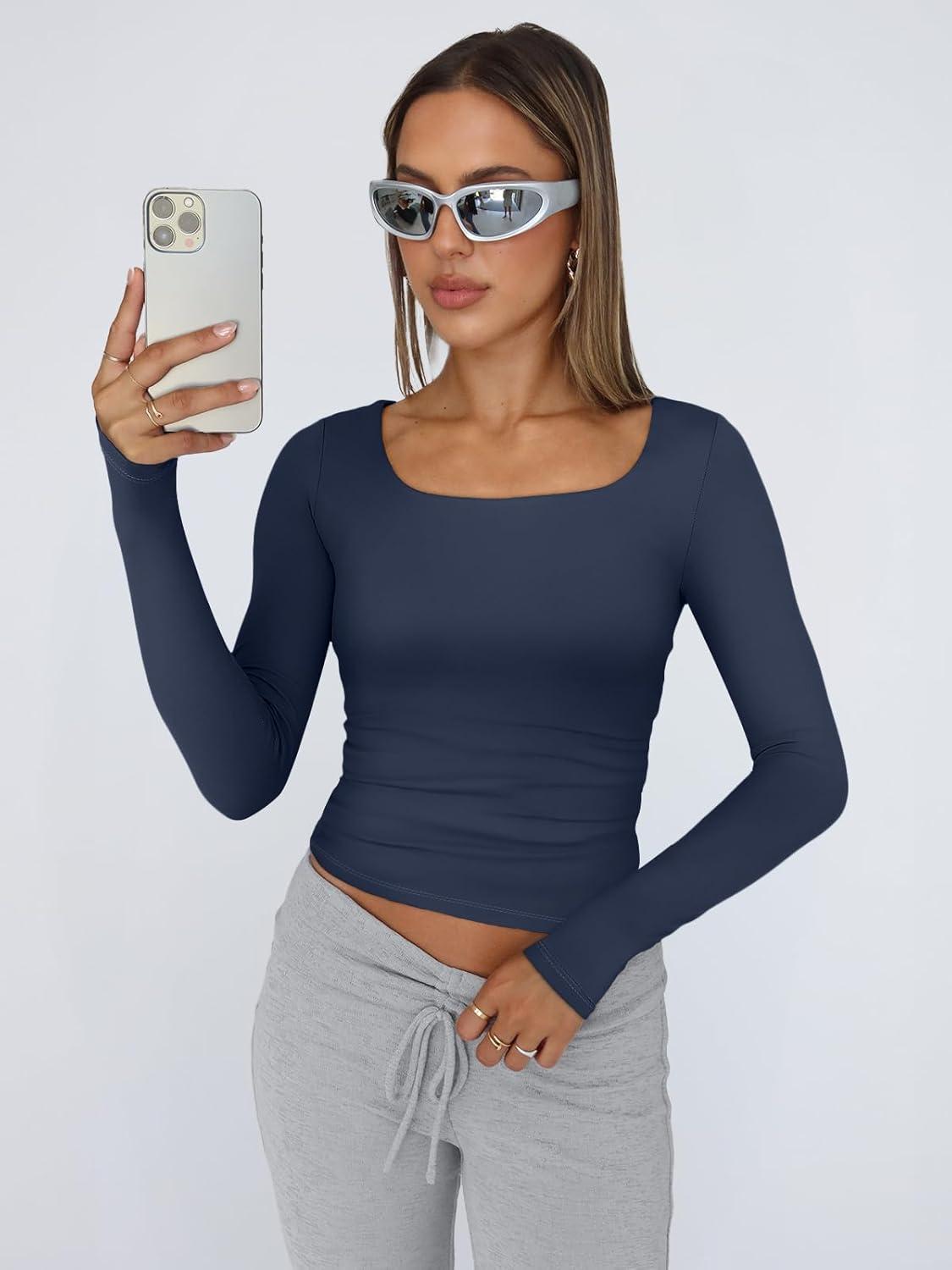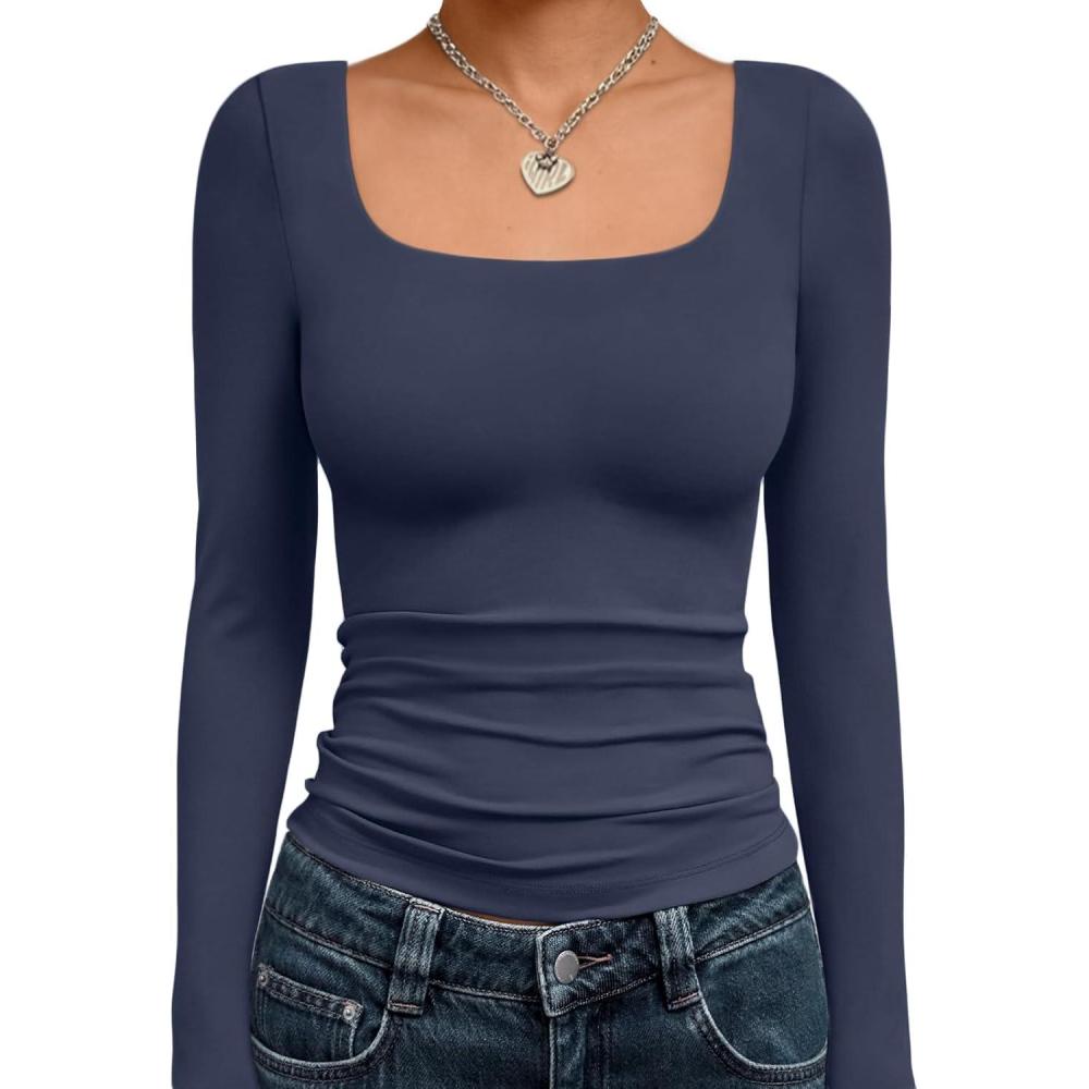 Trendy Queen Womens Long Sleeve Shirts Crop Tops Fall Fashion 2025 Square Neck Going Out Basics Tees Y2k Clothes(Navy)