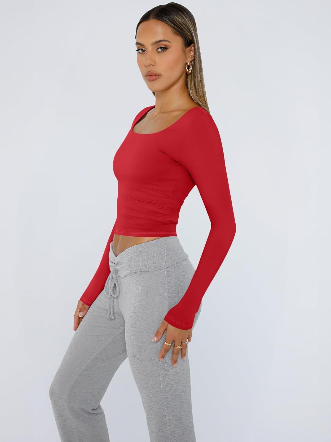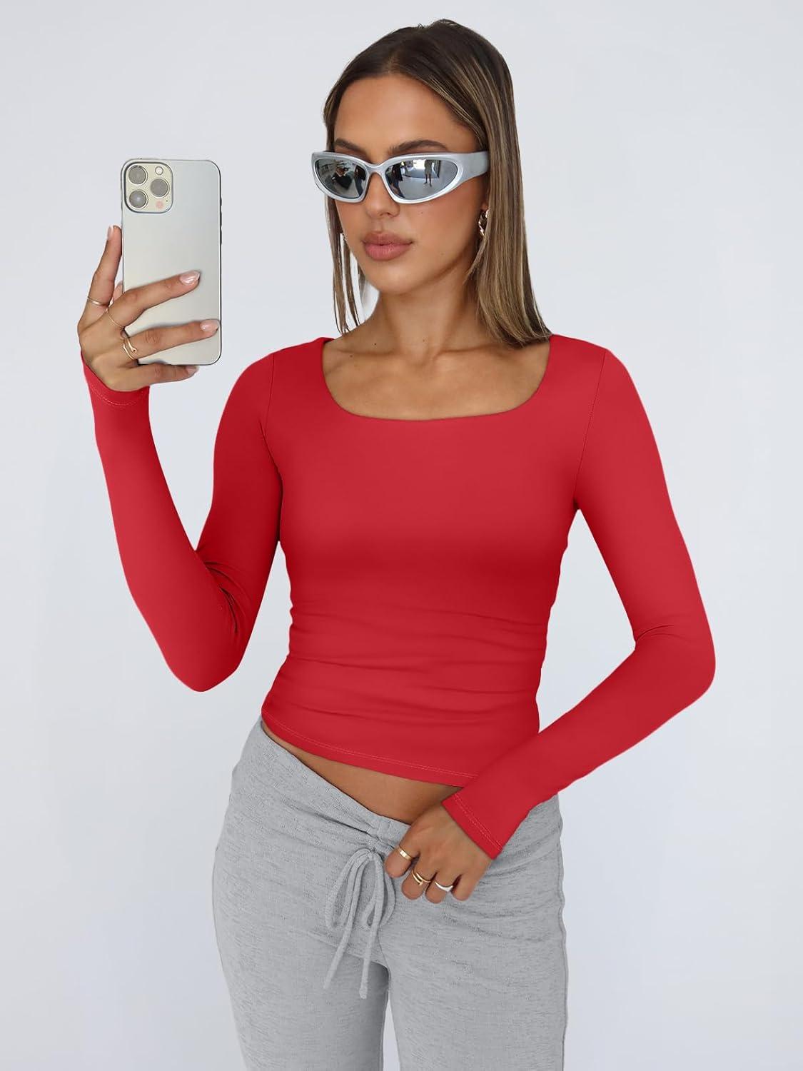 Trendy Queen Womens Long Sleeve Shirts Crop Tops Fall Fashion 2025 Square Neck Going Out Basics Tees Y2k Clothes(Red)