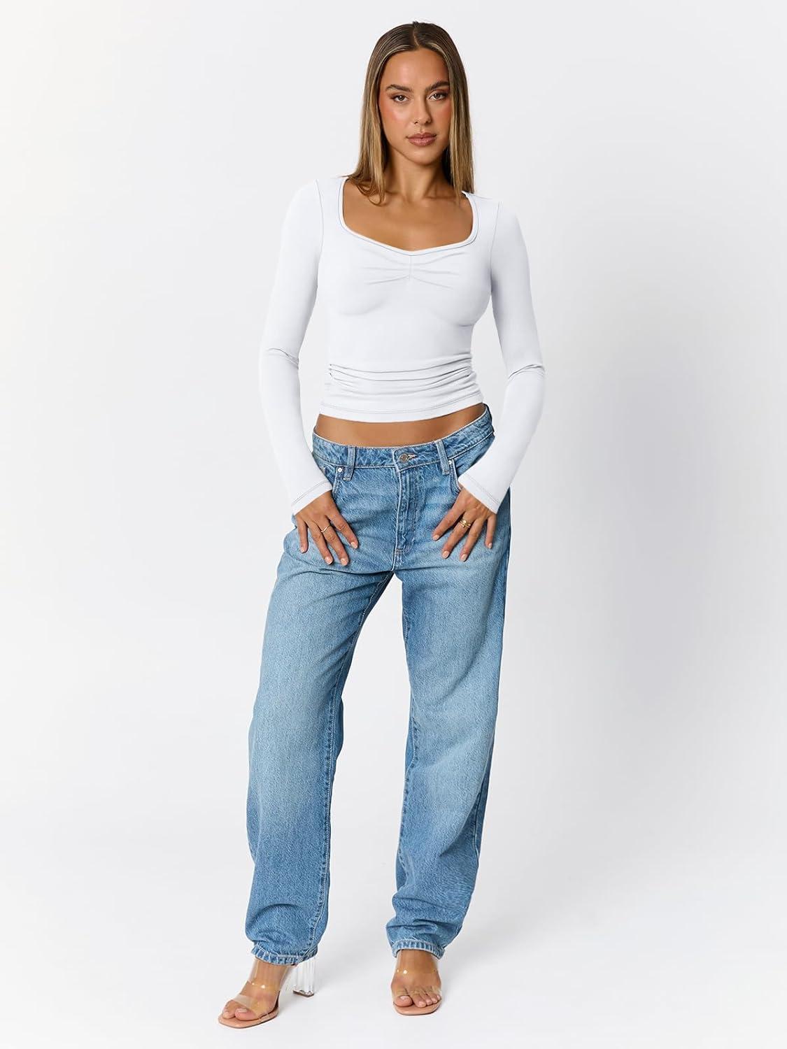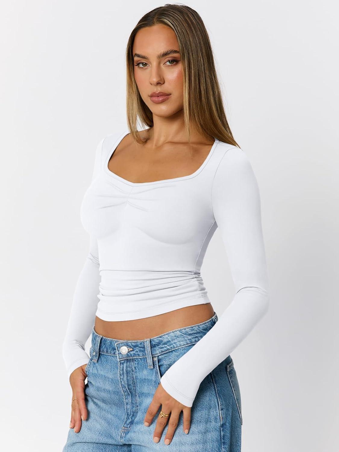 Trendy Queen Womens Long Sleeve Shirts Going Out Crop Tops Sweetheart Neck Workout Tops(White)