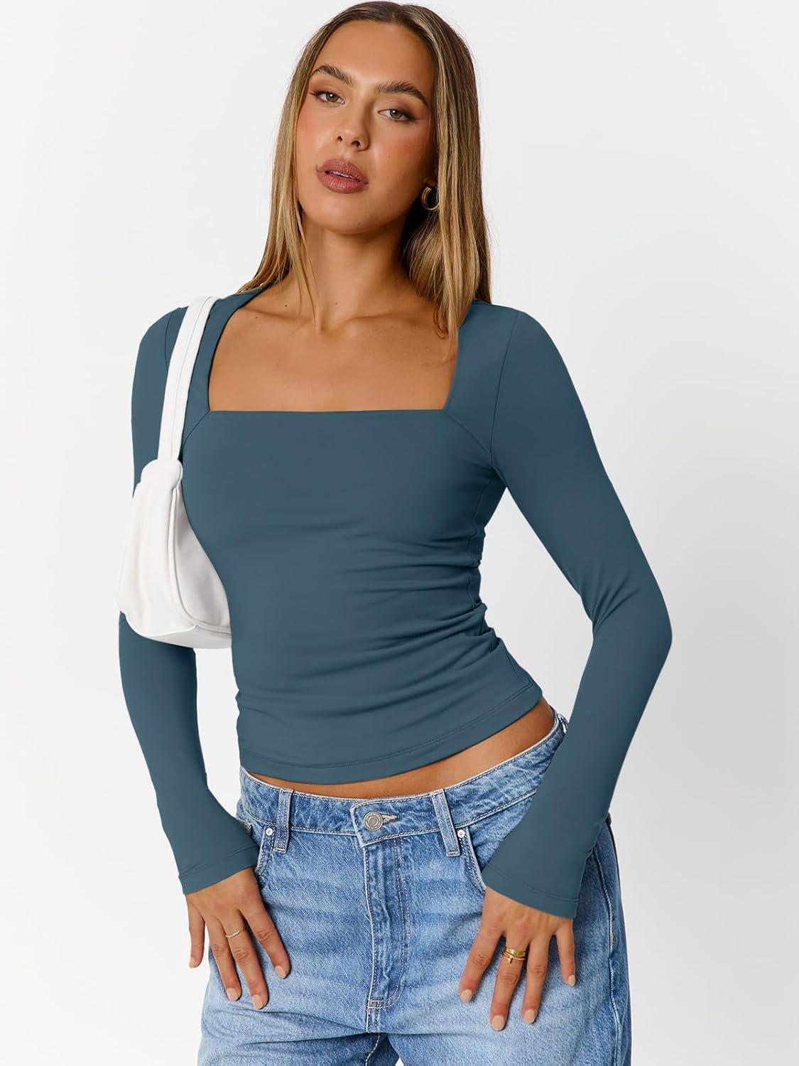 Trendy Queen Womens Long Sleeve Shirts Going Out Tops Square Neck Crop Workout Tops(Hazeblue)