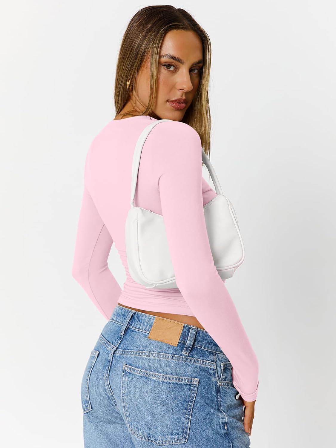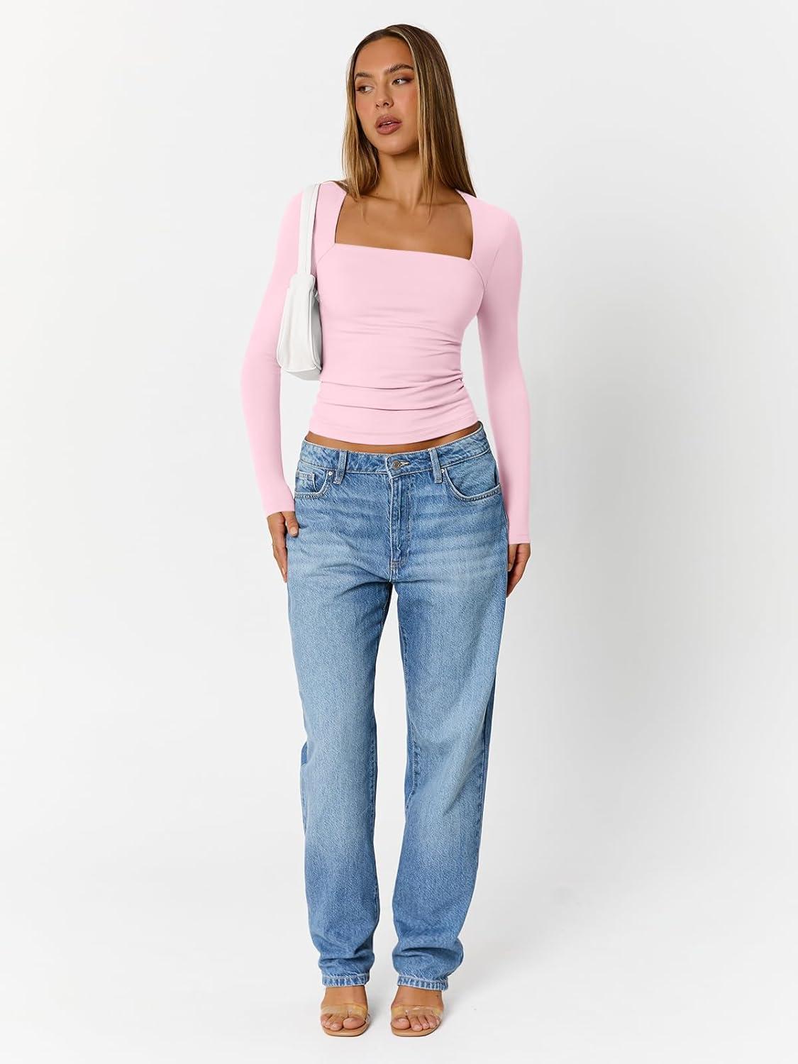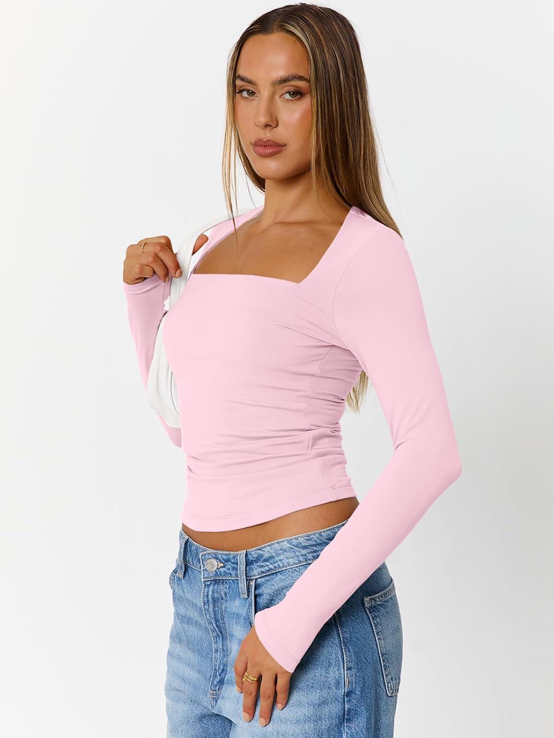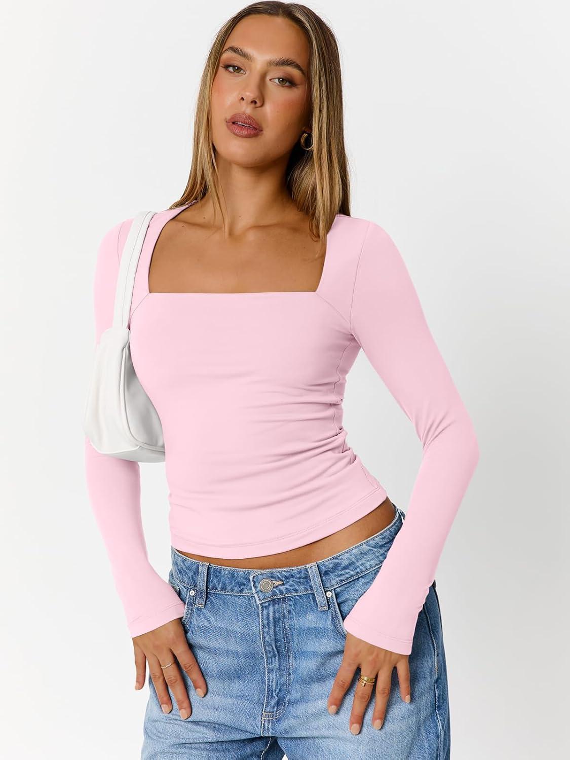 Trendy Queen Womens Long Sleeve Shirts Going Out Tops Square Neck Crop Workout Tops(Pink)
