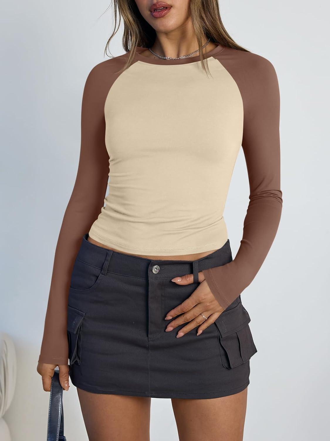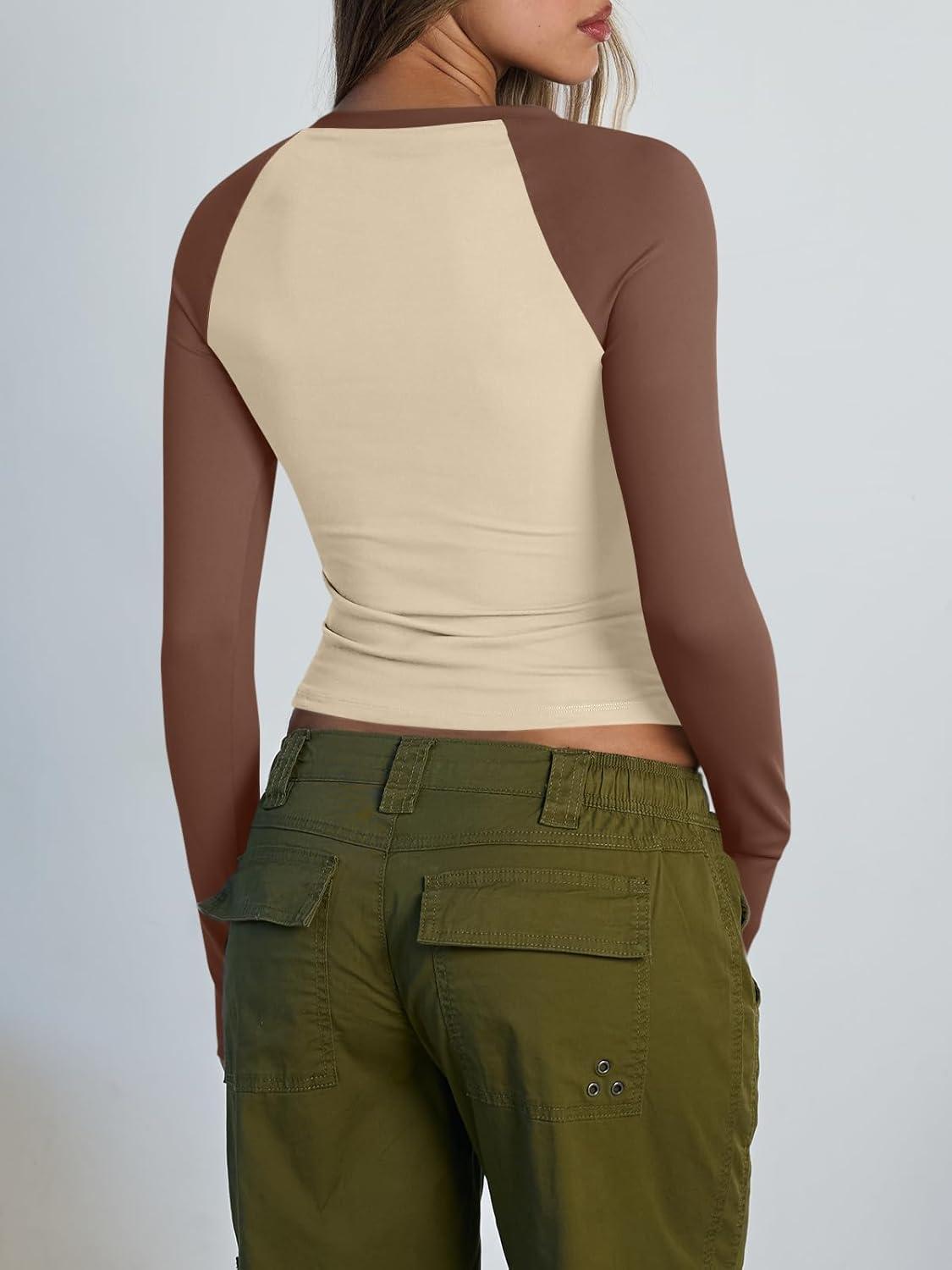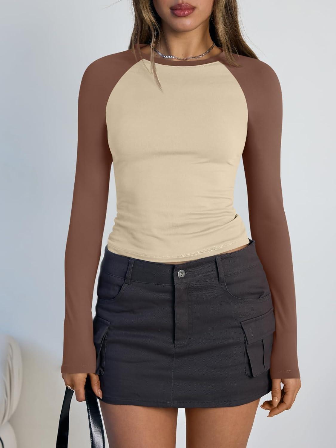 Trendy Queen Women’s Long Sleeve Shirts Slim Fit Stretchy Color Block Slightly Cropped Tops(Beige Brown Combo)