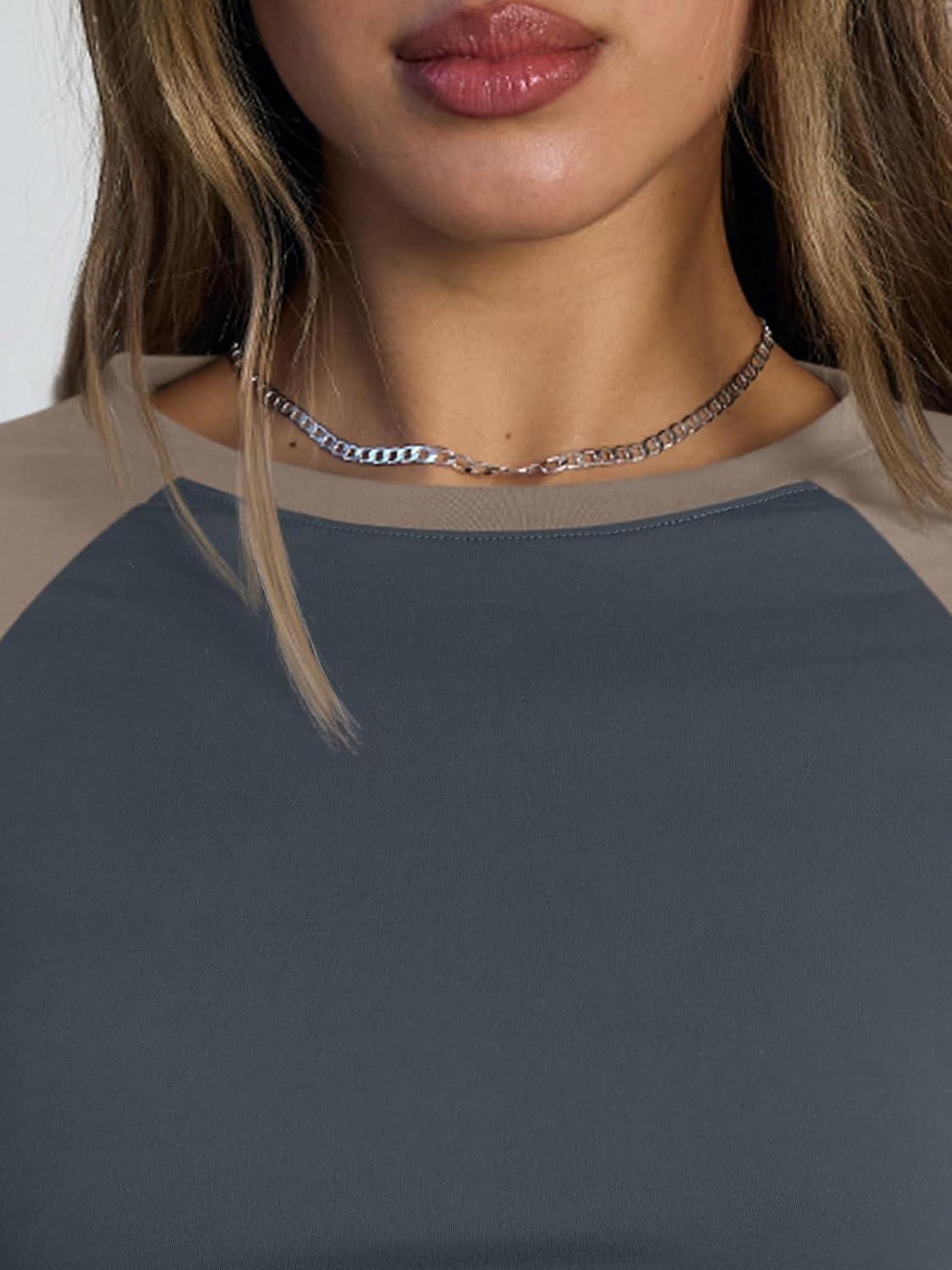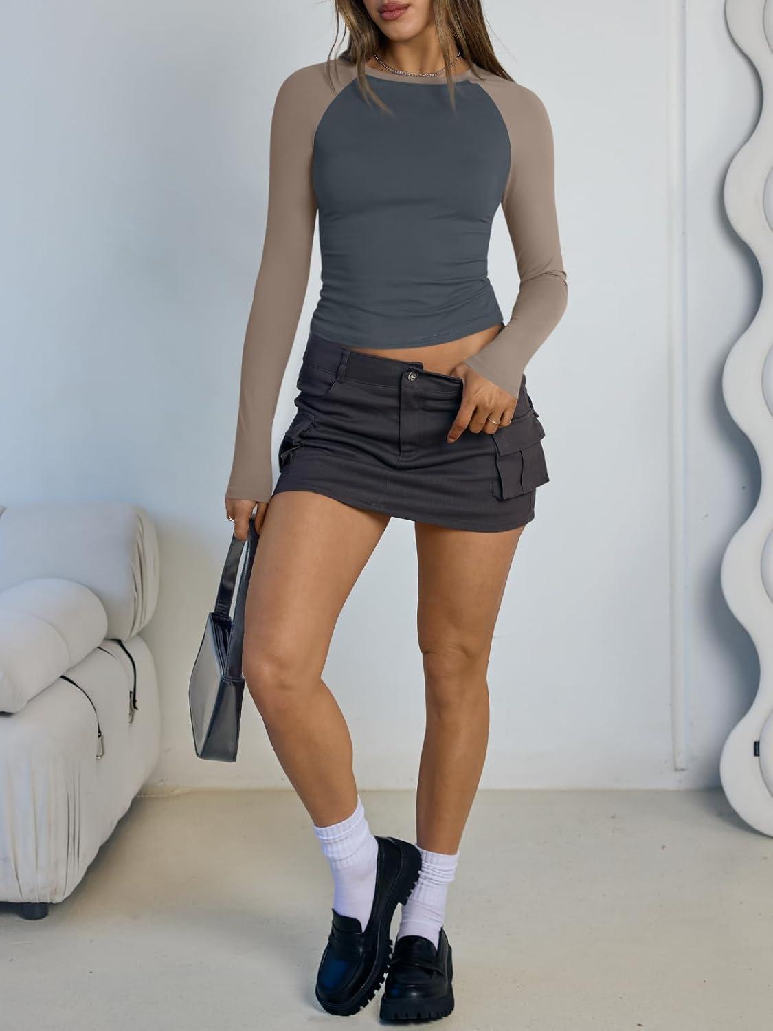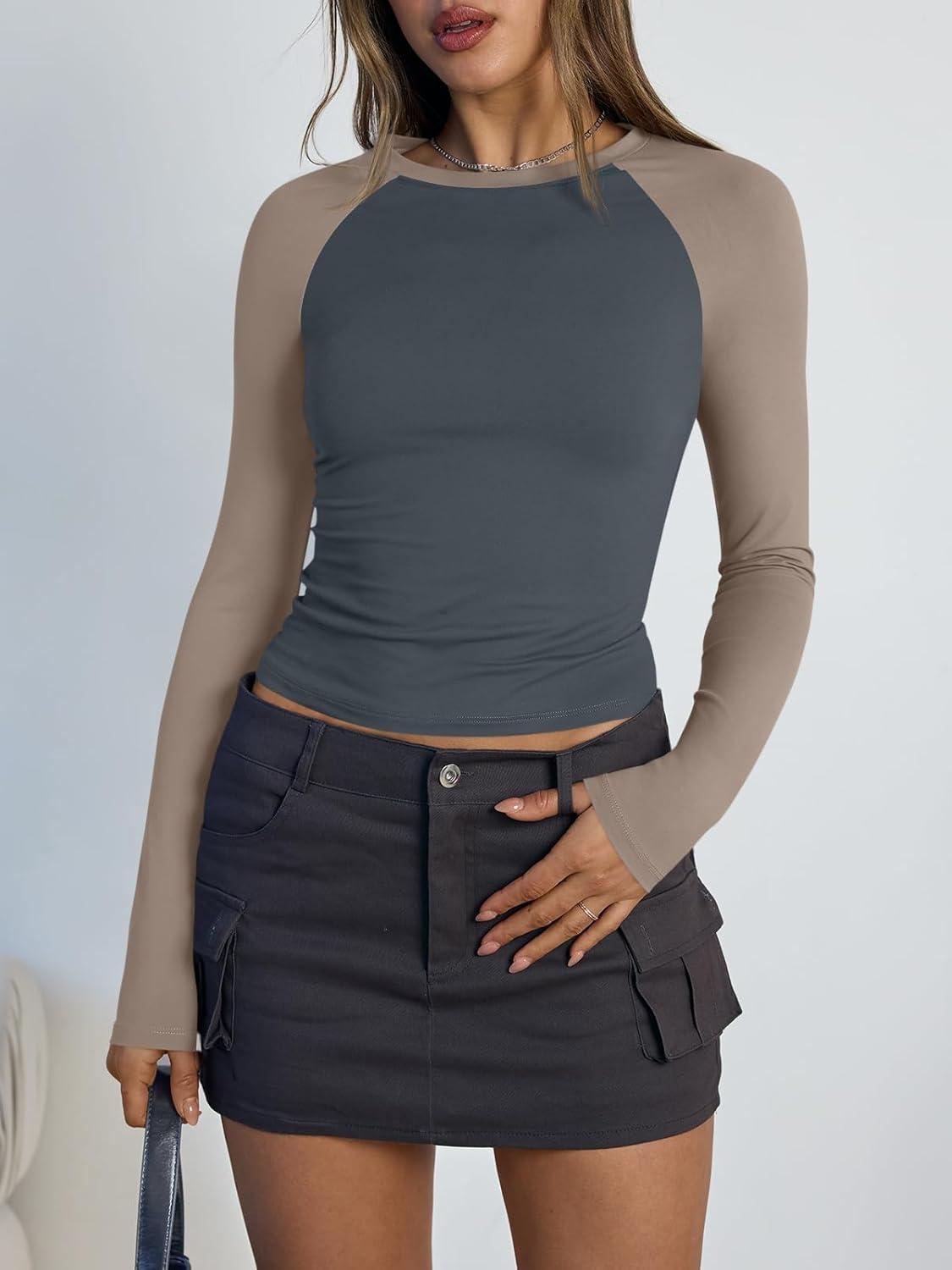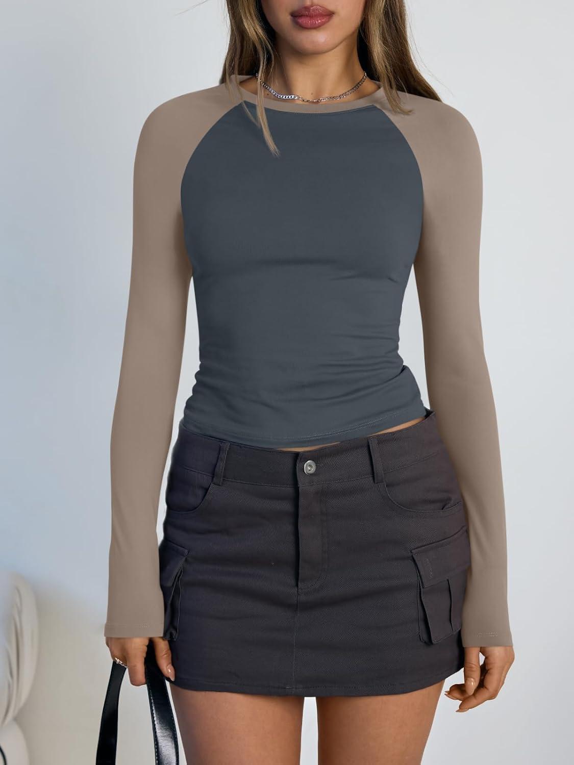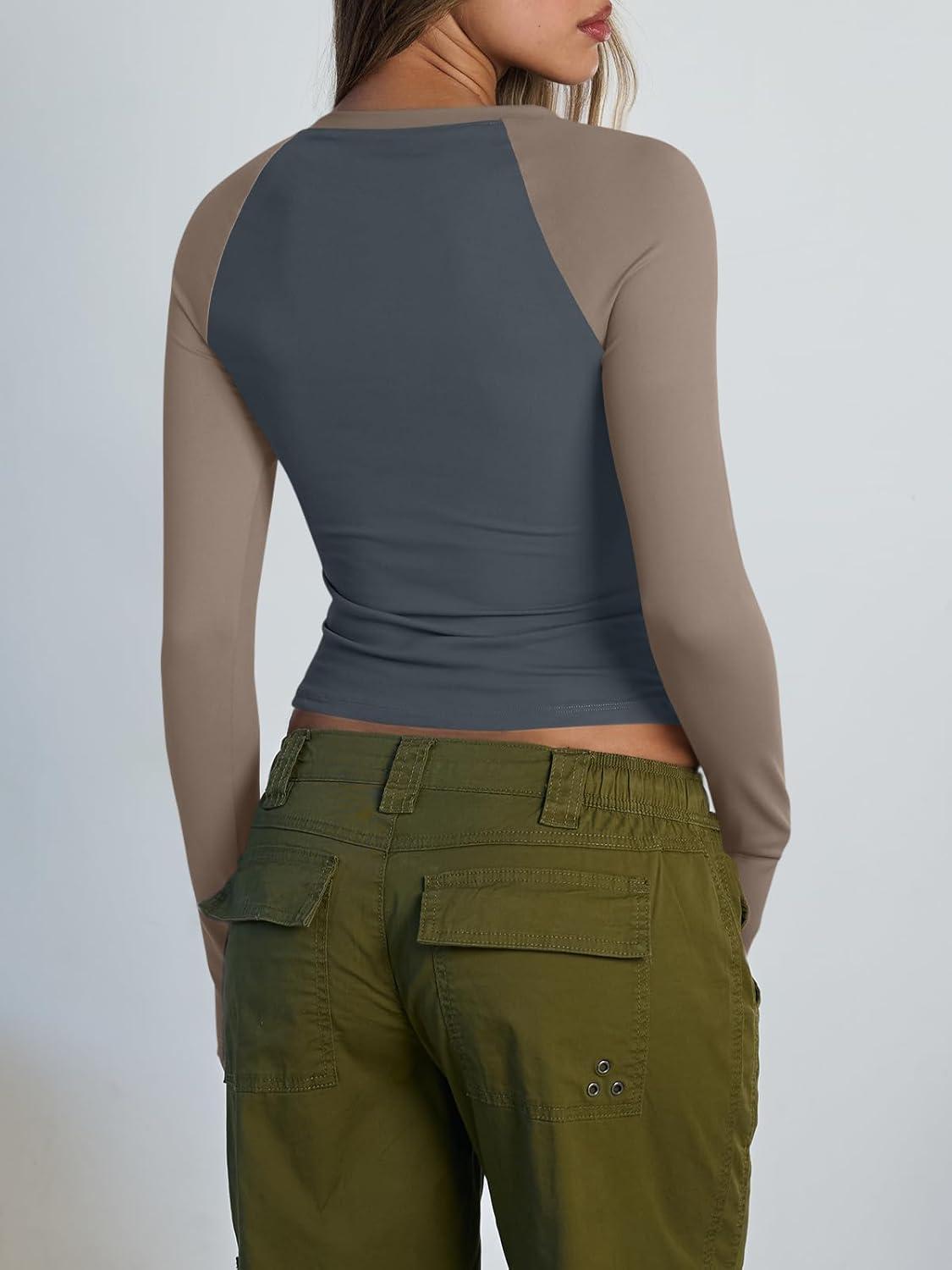 Trendy Queen Women’s Long Sleeve Shirts Slim Fit Stretchy Color Block Slightly Cropped Tops(Charcoal Mocha Combo)