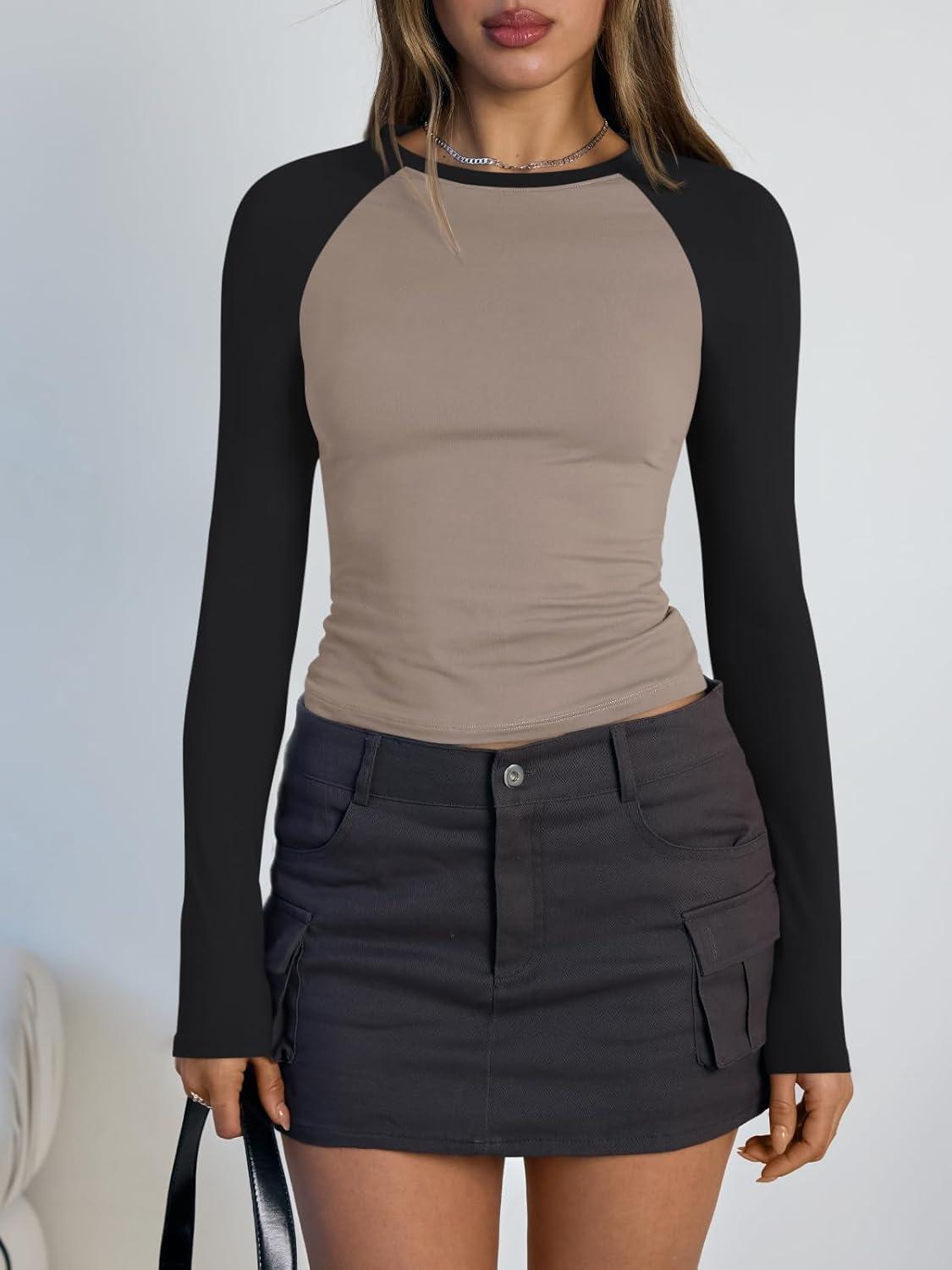 Trendy Queen Women’s Long Sleeve Shirts Slim Fit Stretchy Color Block Slightly Cropped Tops(Mocha Black Combo)