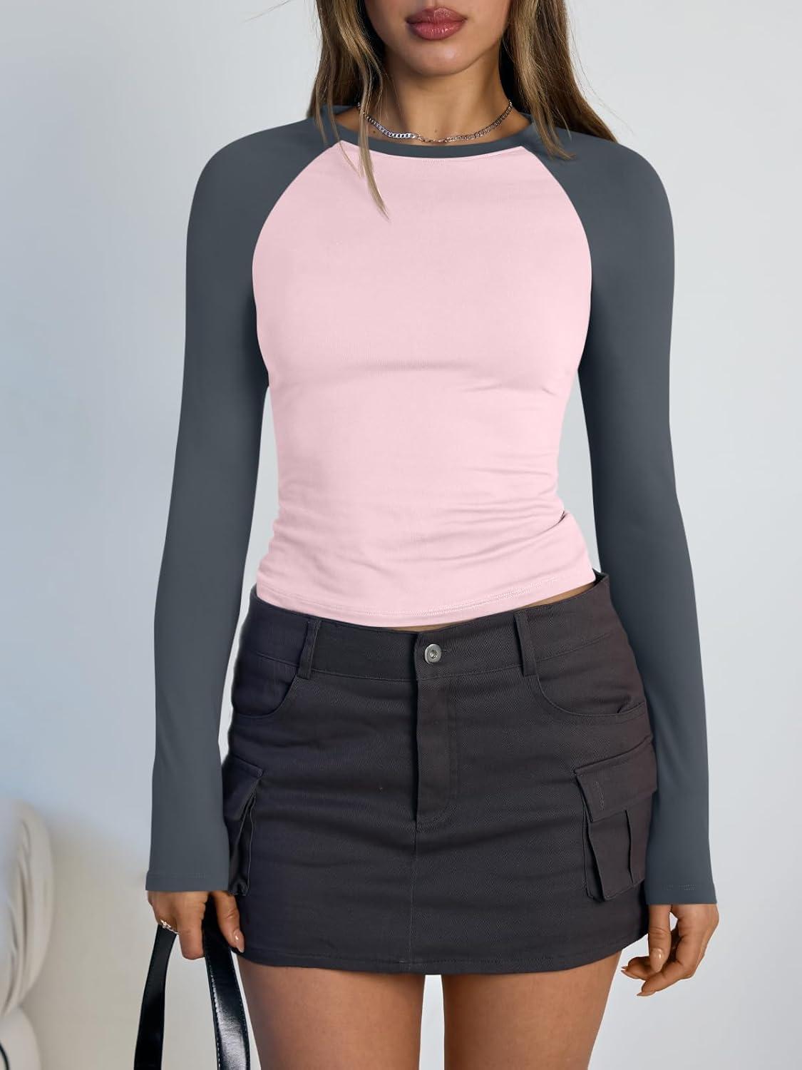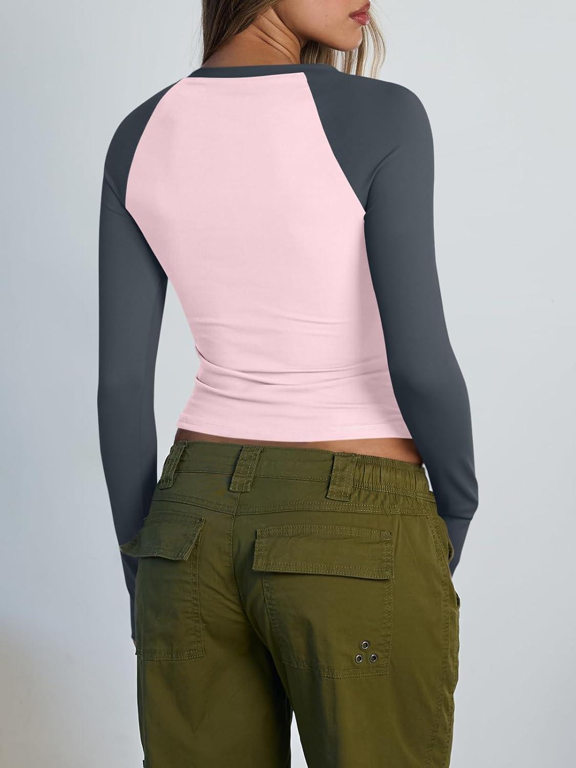 Trendy Queen Women’s Long Sleeve Shirts Slim Fit Stretchy Color Block Slightly Cropped Tops(Pink Charcoal Combo)