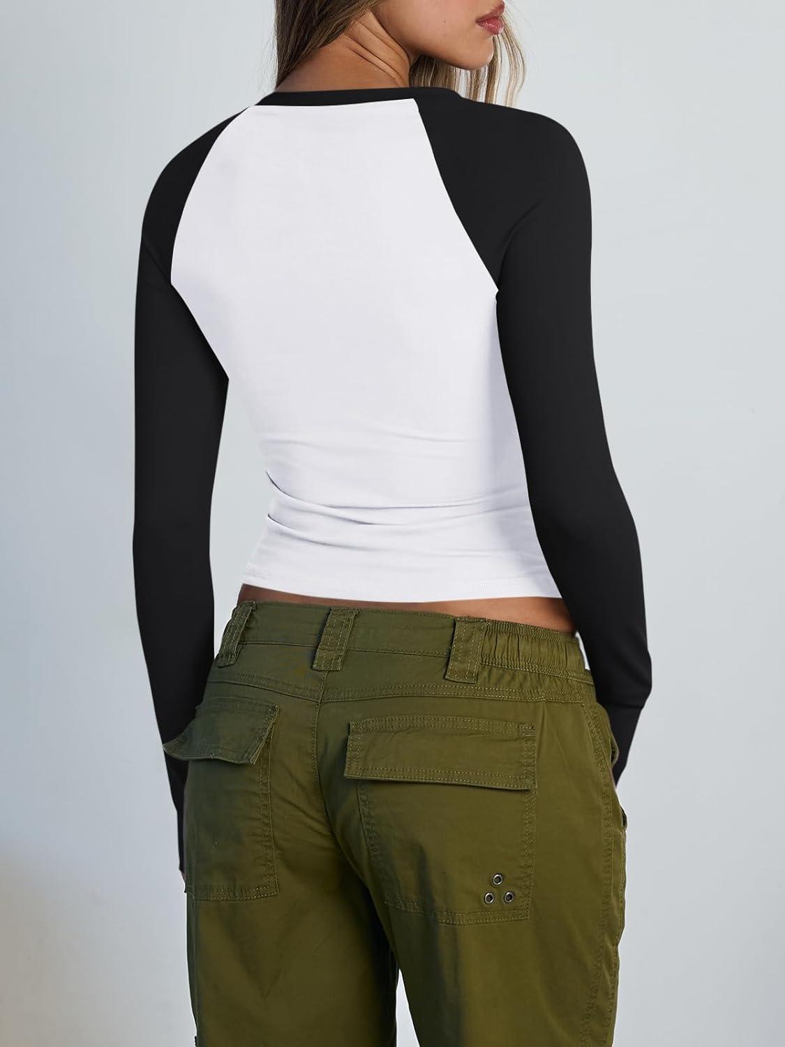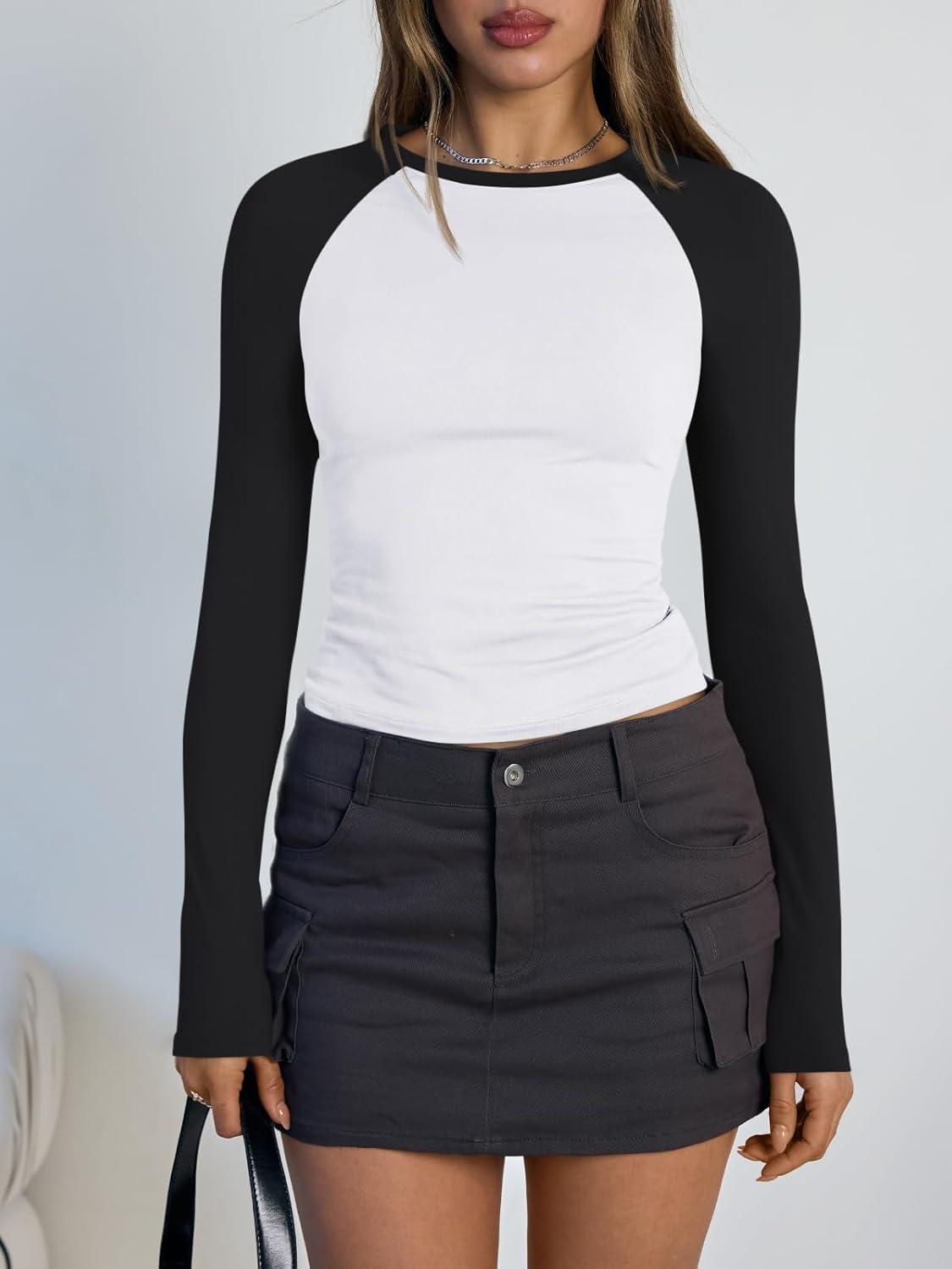 Trendy Queen Women’s Long Sleeve Shirts Slim Fit Stretchy Color Block Slightly Cropped Tops(White Black Combo)
