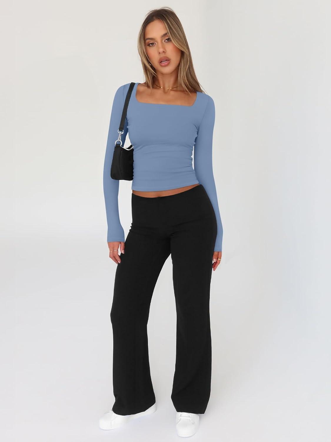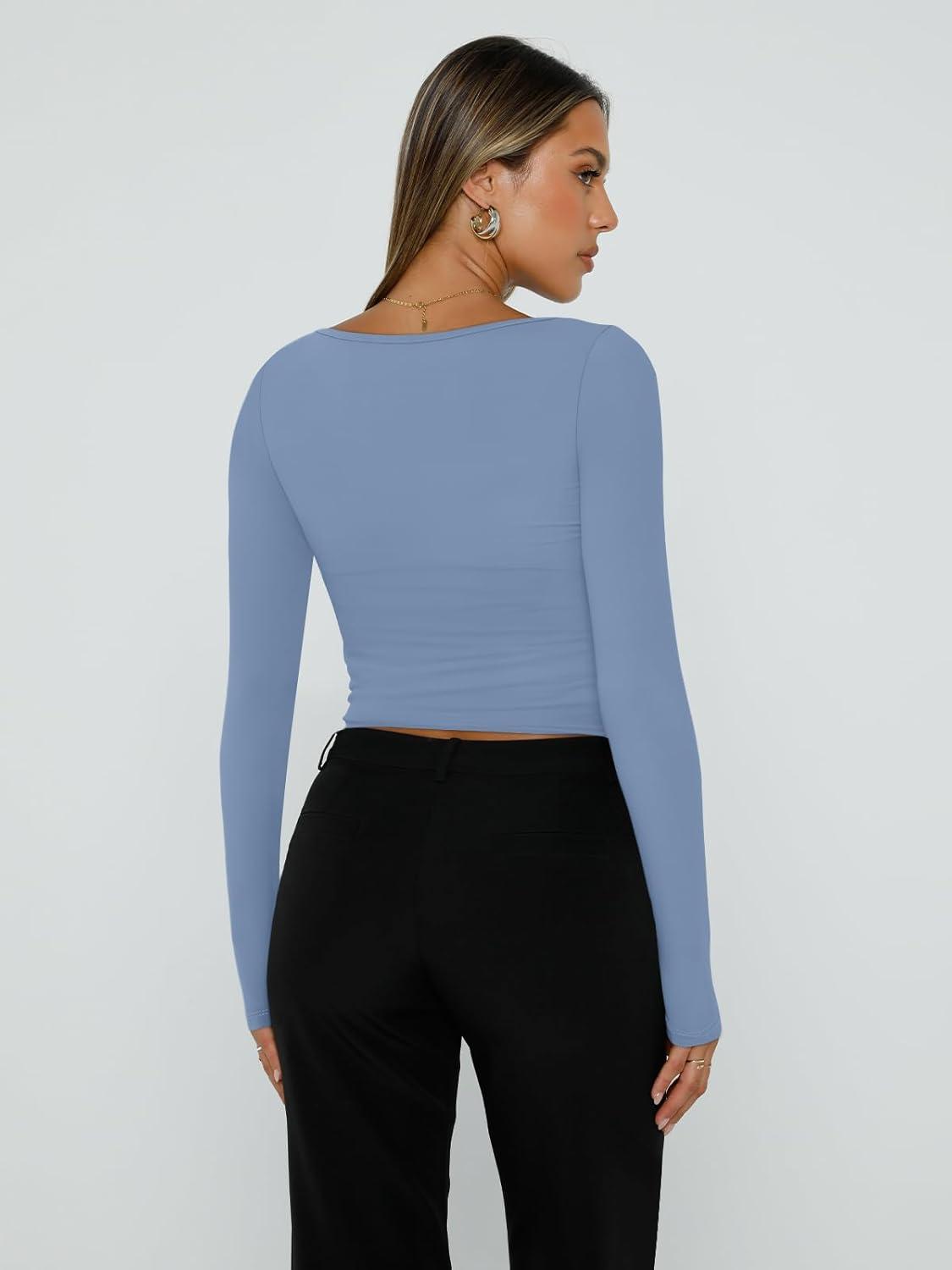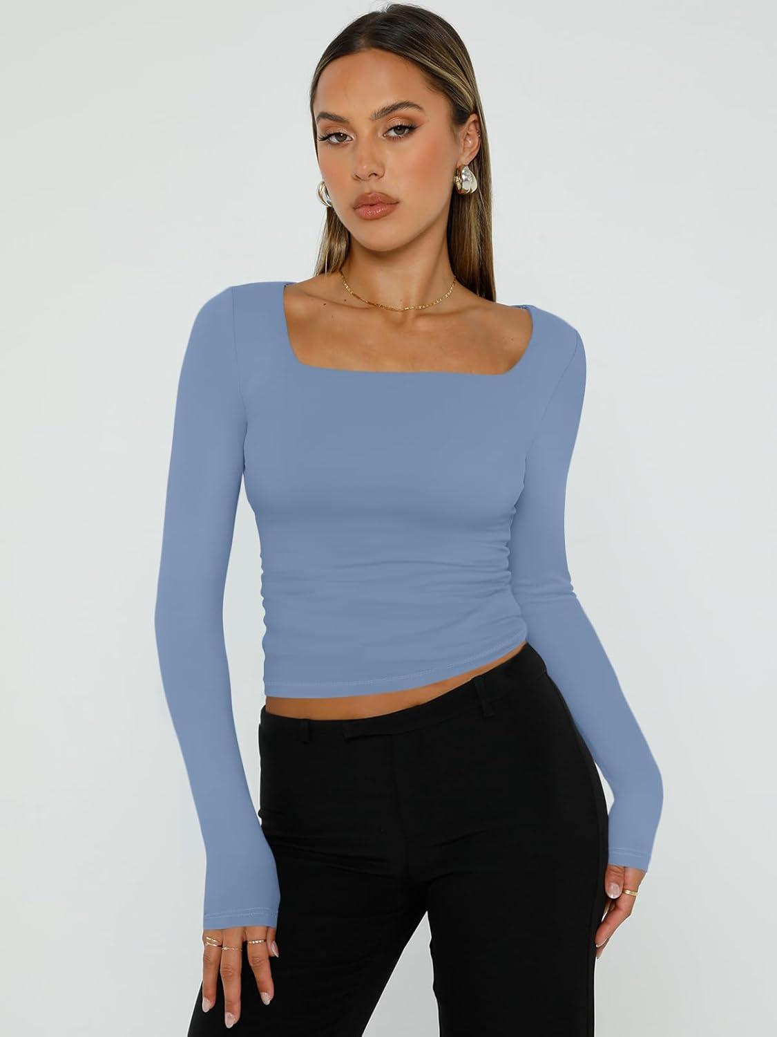 Trendy Queen Womens Long Sleeve Shirts Square Neck Going Out Crop Tops Fashion Y2k Workout Clothes Fall Outfits 2025(Blue)