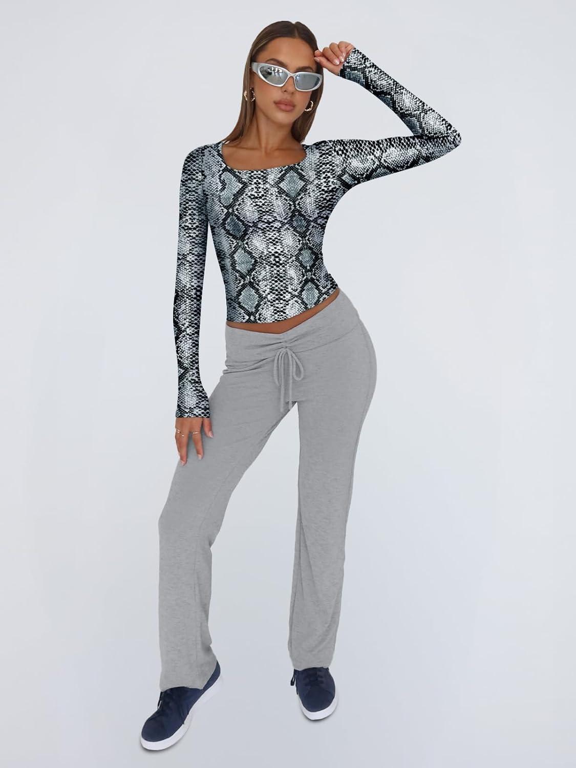 Trendy Queen Womens Long Sleeve Shirts Square Neck Going Out Crop Tops Fashion Y2k Workout Clothes Fall Outfits 2025(Cobra)