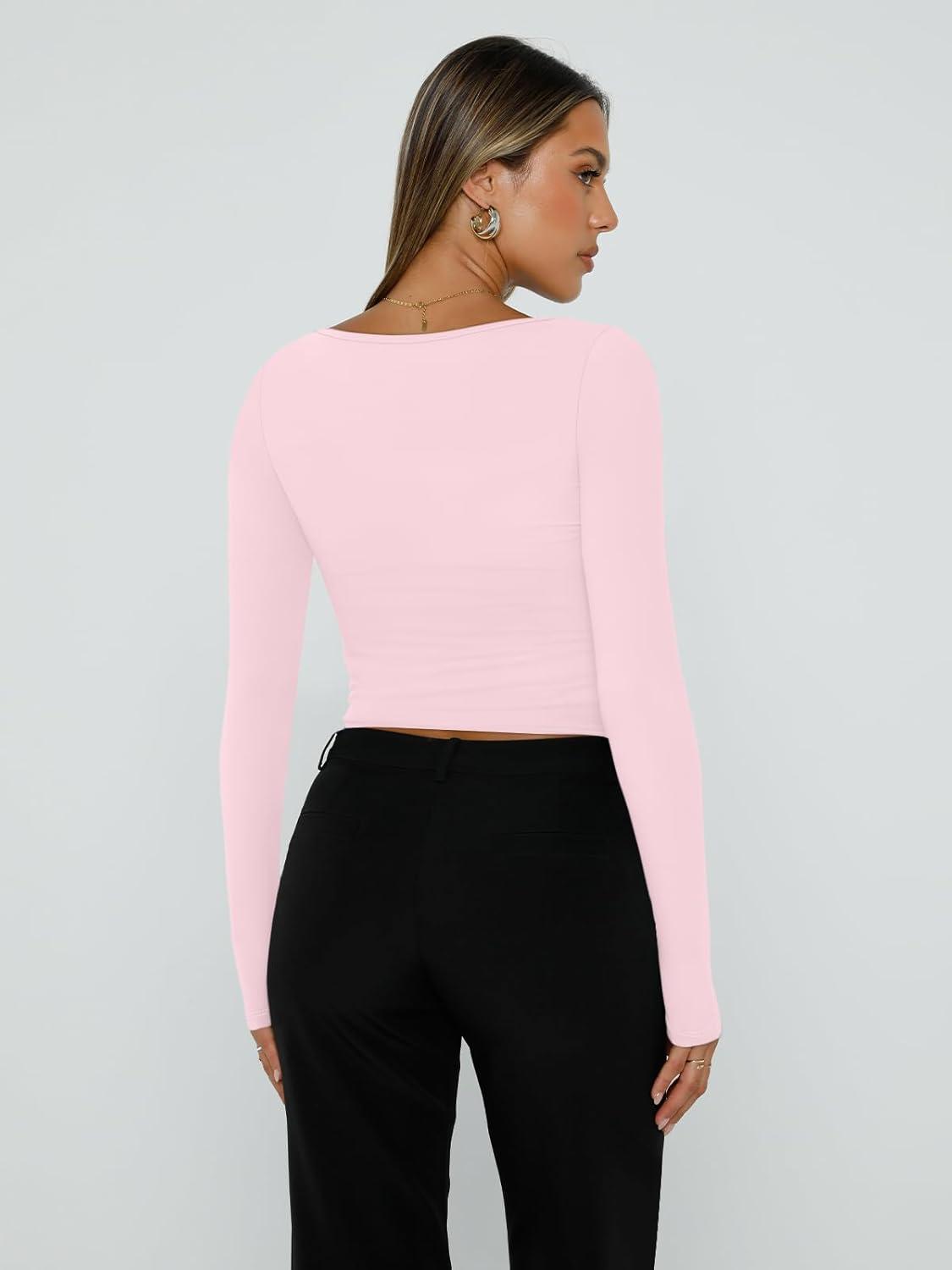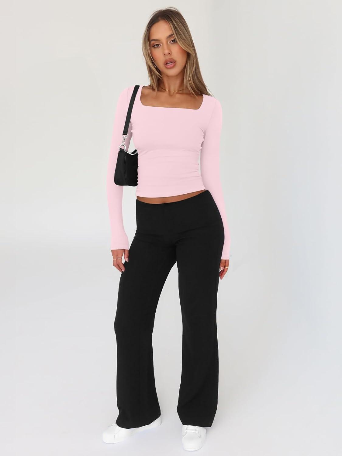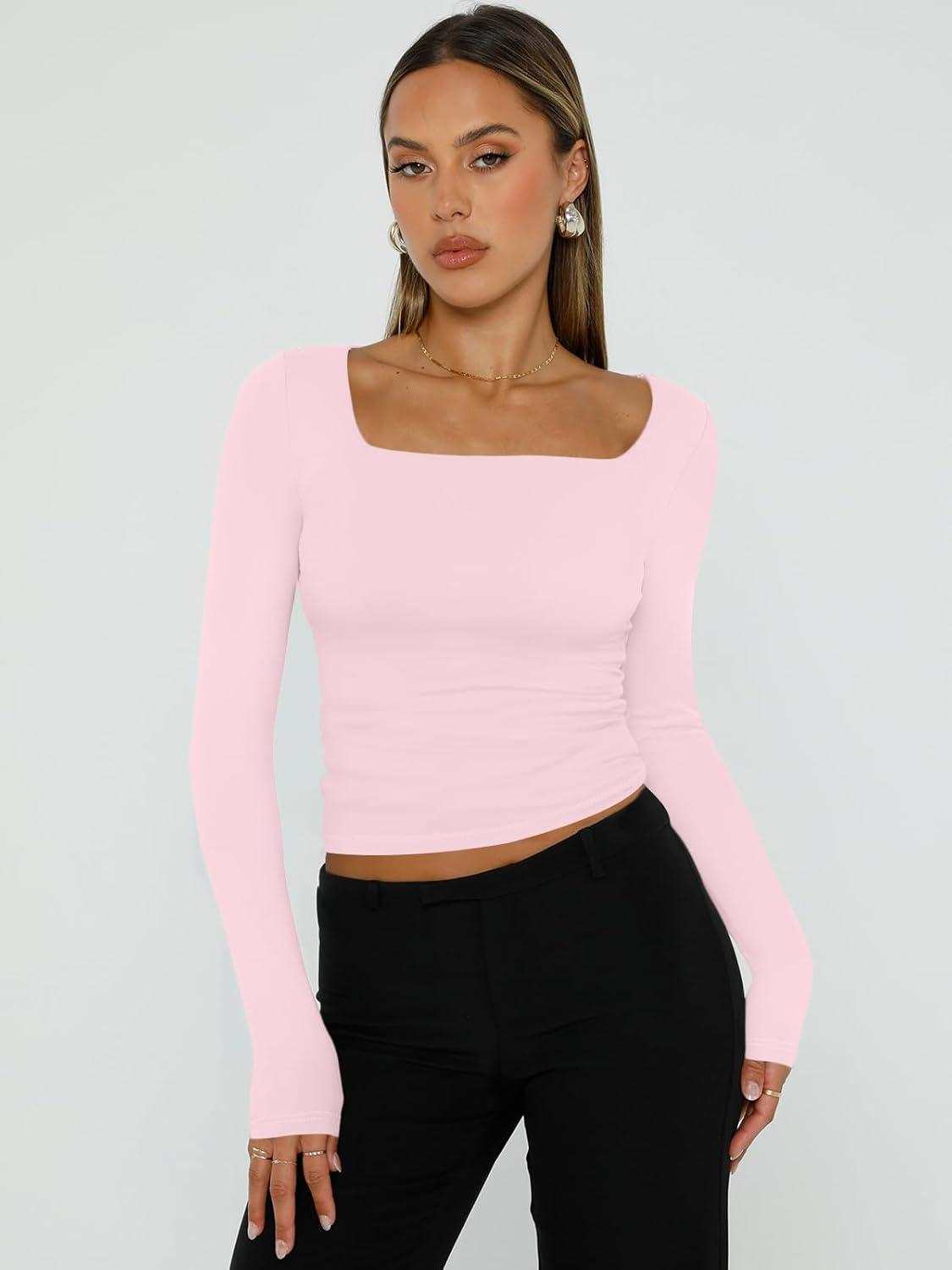 Trendy Queen Womens Long Sleeve Shirts Square Neck Going Out Crop Tops Fashion Y2k Workout Clothes Fall Outfits 2025(Pink)