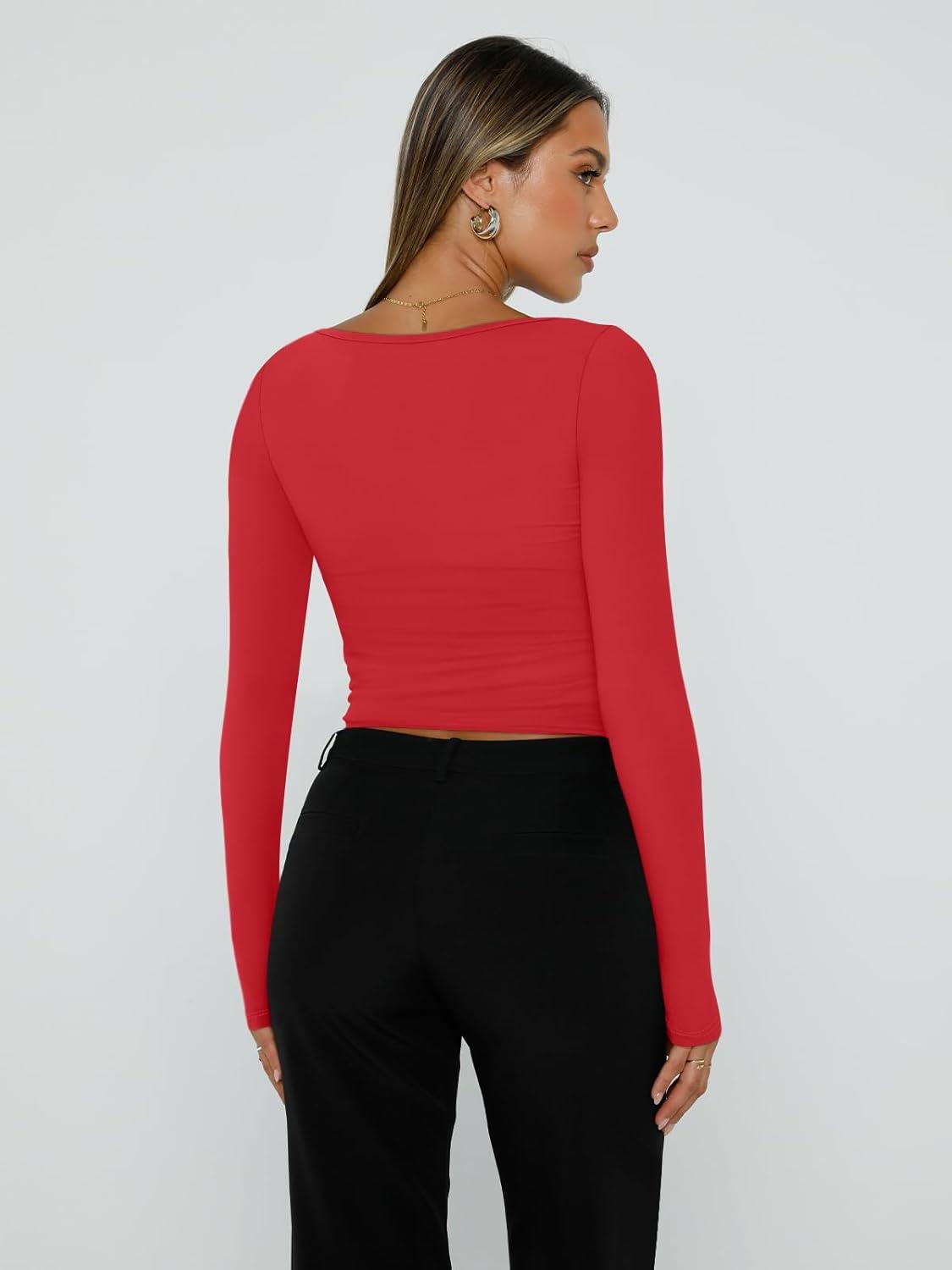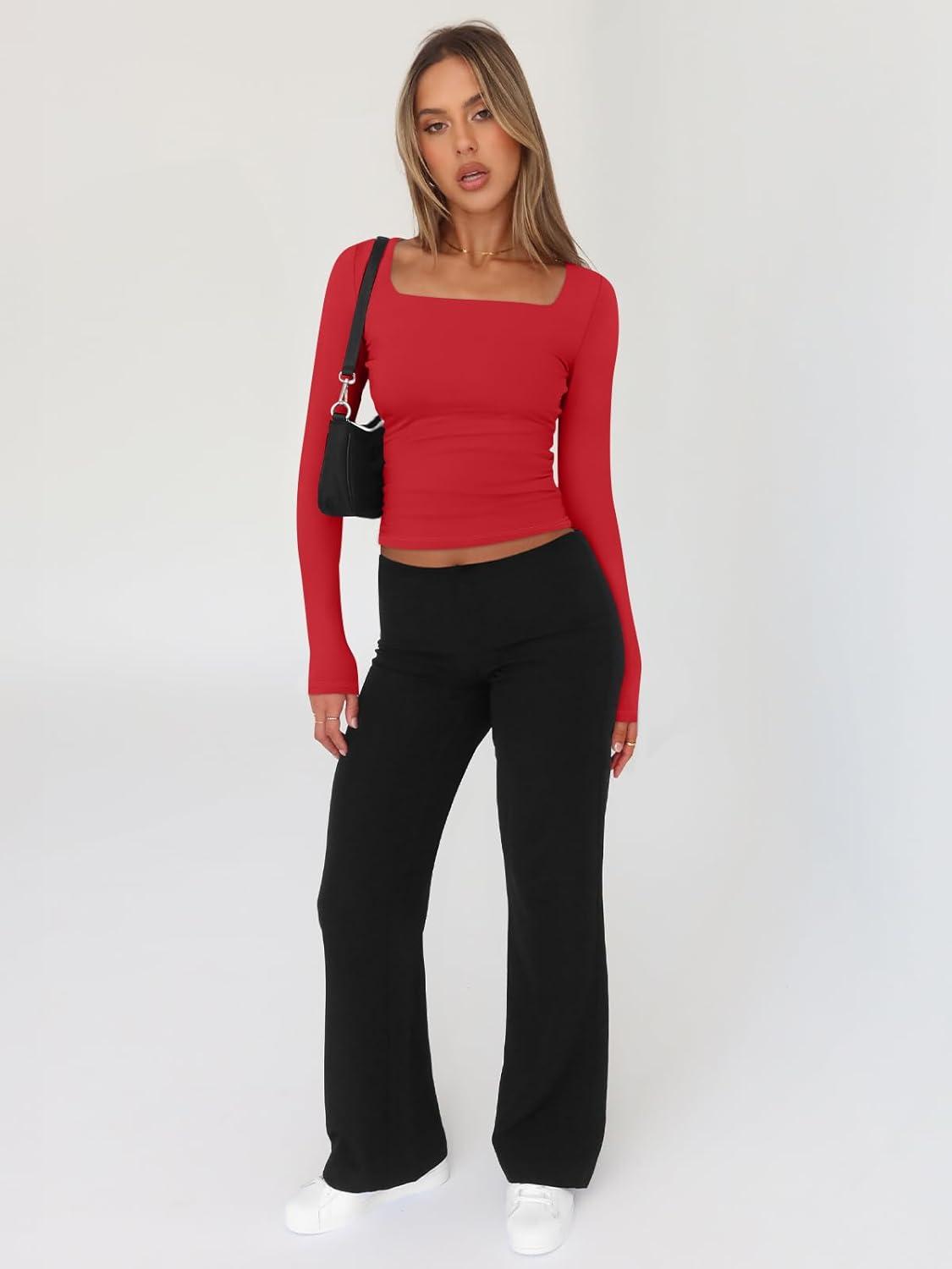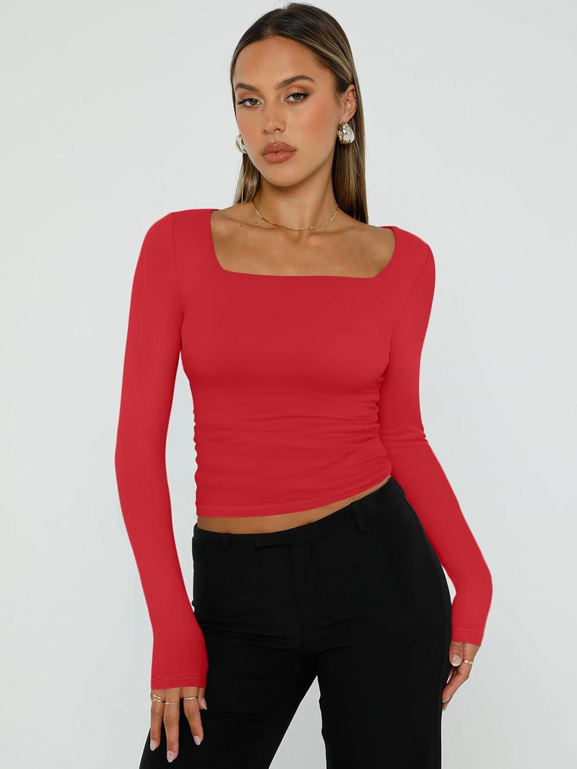 Trendy Queen Womens Long Sleeve Shirts Square Neck Going Out Crop Tops Fashion Y2k Workout Clothes Fall Outfits 2025(Red)
