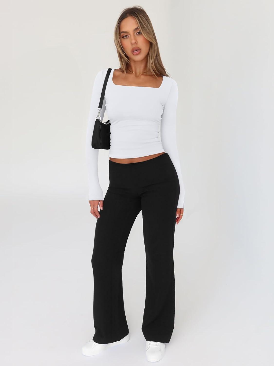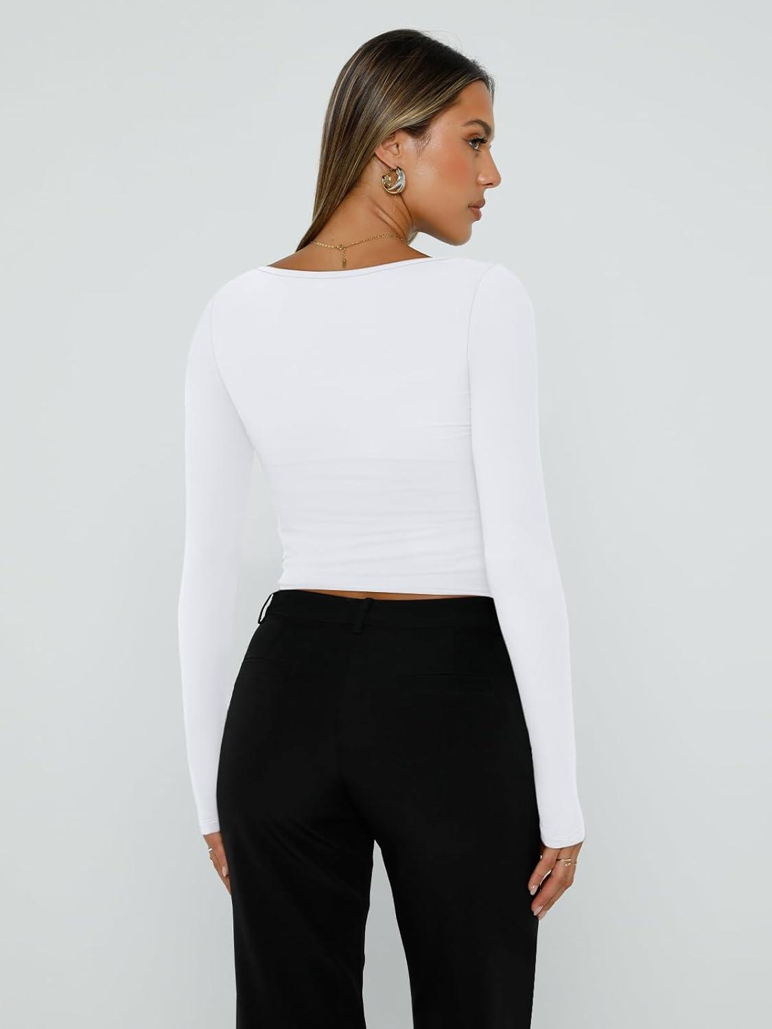 Trendy Queen Womens Long Sleeve Shirts Square Neck Going Out Crop Tops Fashion Y2k Workout Clothes Fall Outfits 2025(White)
