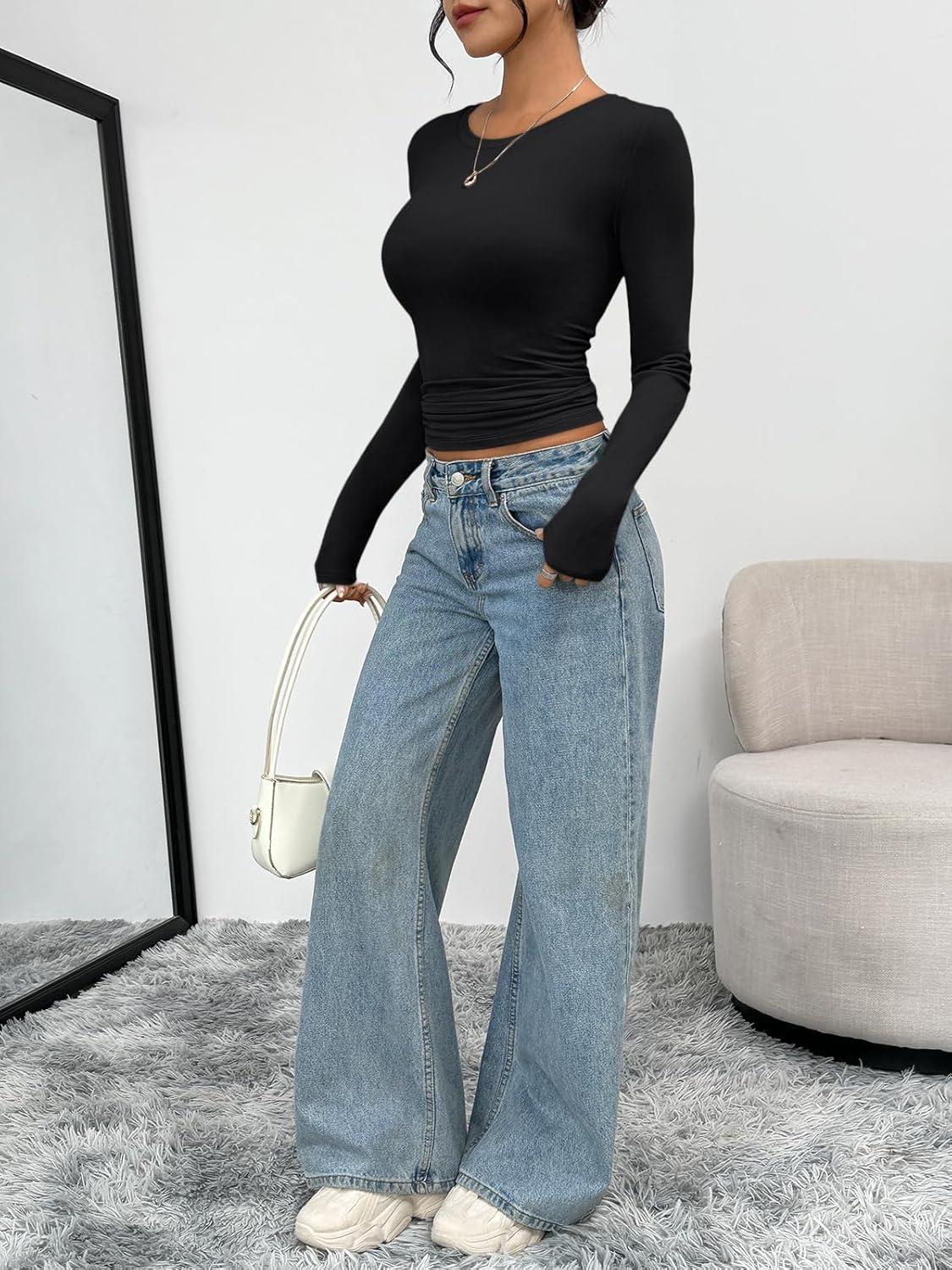 Trendy Queen Womens Long Sleeve T-Shirts Basic Crop Tops 2025 Fall Fashion Outfits Going Out Winter Clothes(Black)