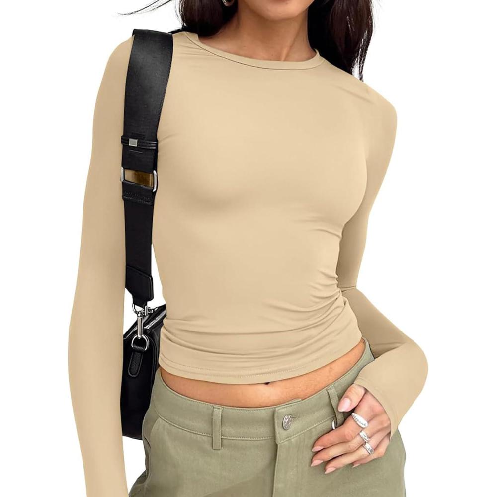 Trendy Queen Womens Long Sleeve T Shirts Fall Fashion 2025 Basic Crop Tops Going Out Outfits Y2k Clothes(Khaki)