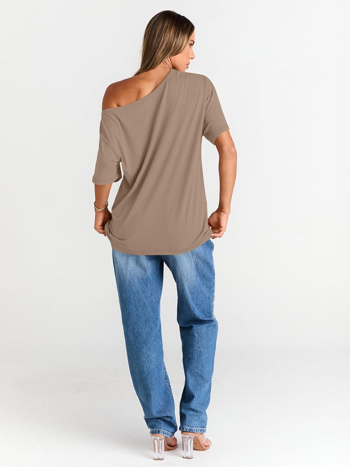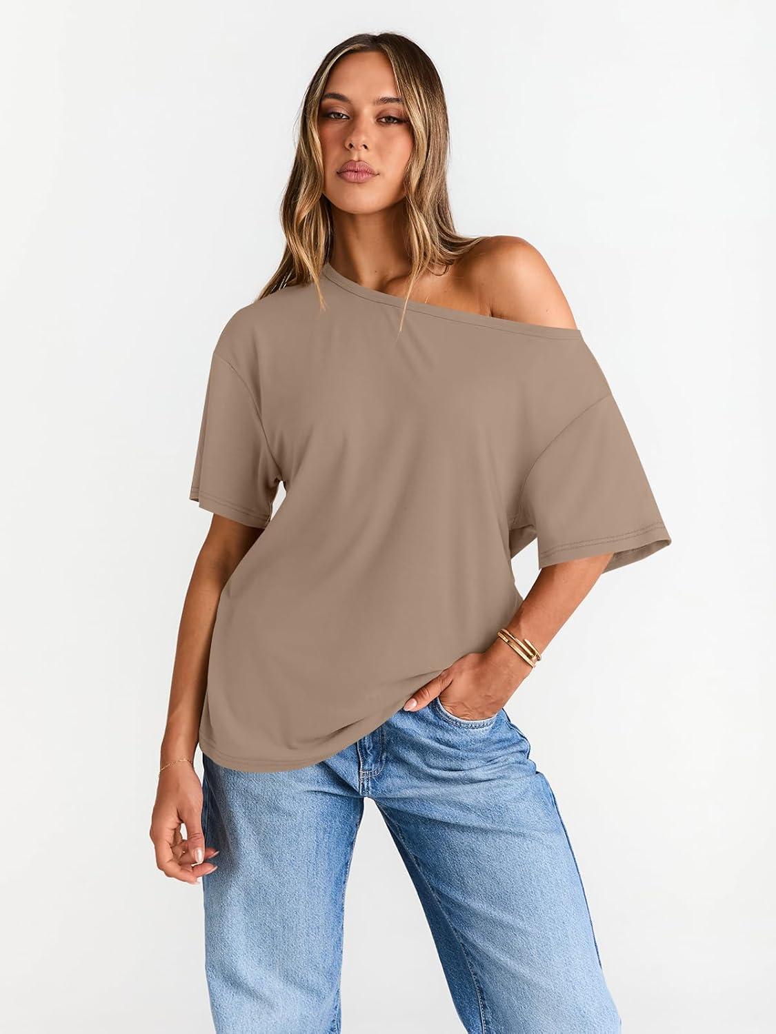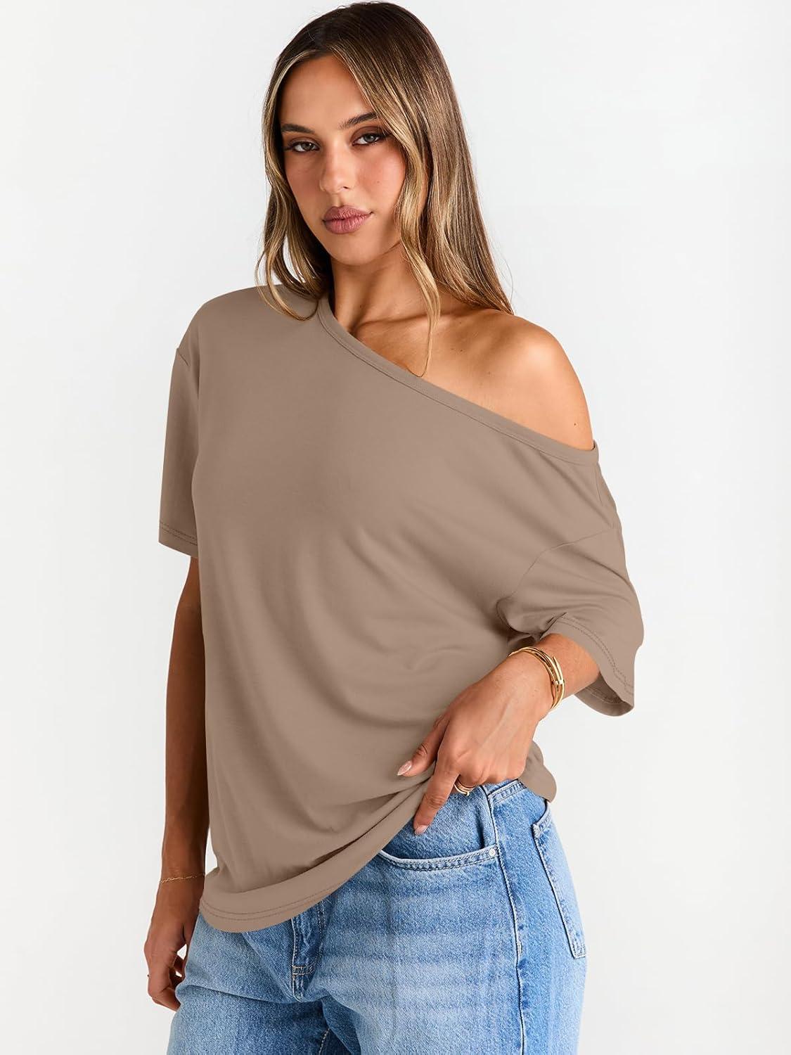 Trendy Queen Womens Off The Shoulder Tops Oversized T-Shirts Short Sleeve Tees Summer 2025 Casual Spring Fashion Clothes(Khaki)